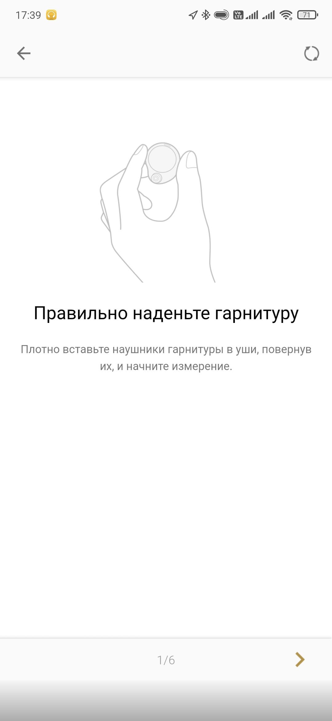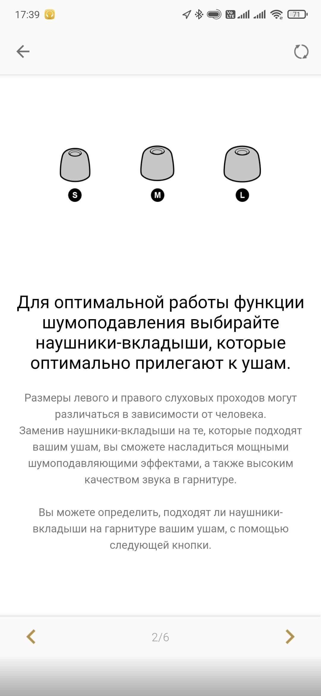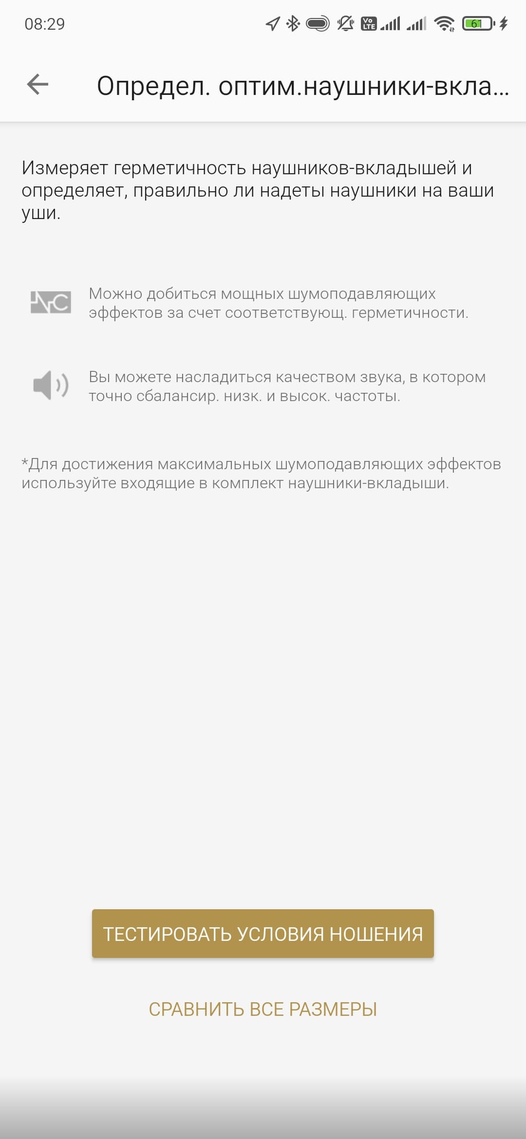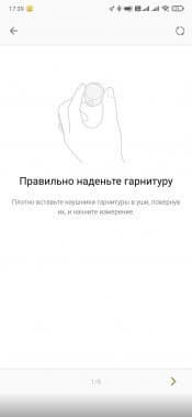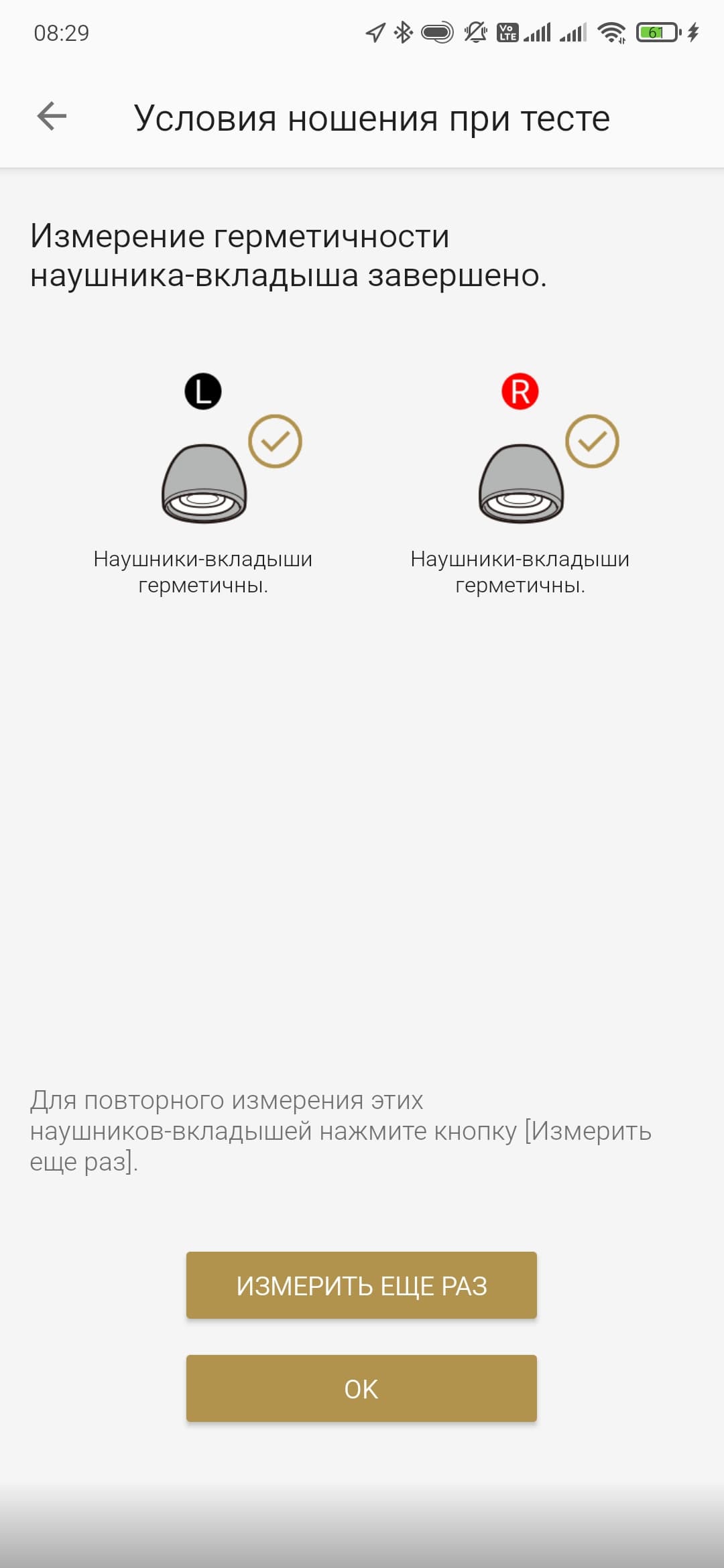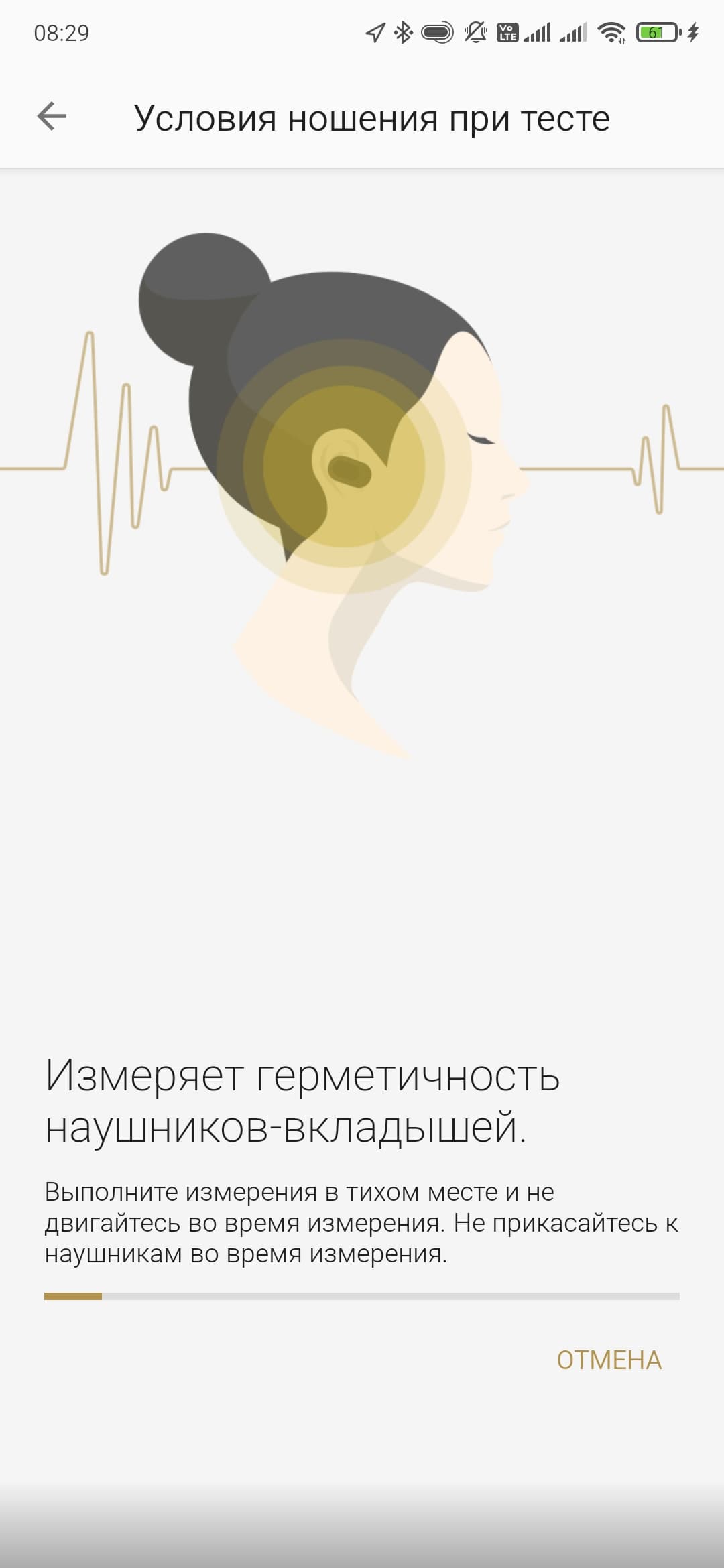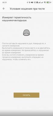 Ниже мы видим очень полезную опцию — определение правильности ношения и подбора насадок. Надеваем наушники, активируем функцию — гарнитура издает пару вполне приятных звуков и с помощью встроенных микрофонов определяет, все ли хорошо. Результаты ниже, кстати, мы получили, разместив наушники на нашем стенде для измерений — как видно, они ему идеально подошли.