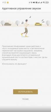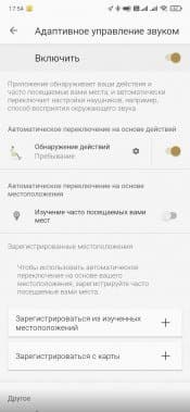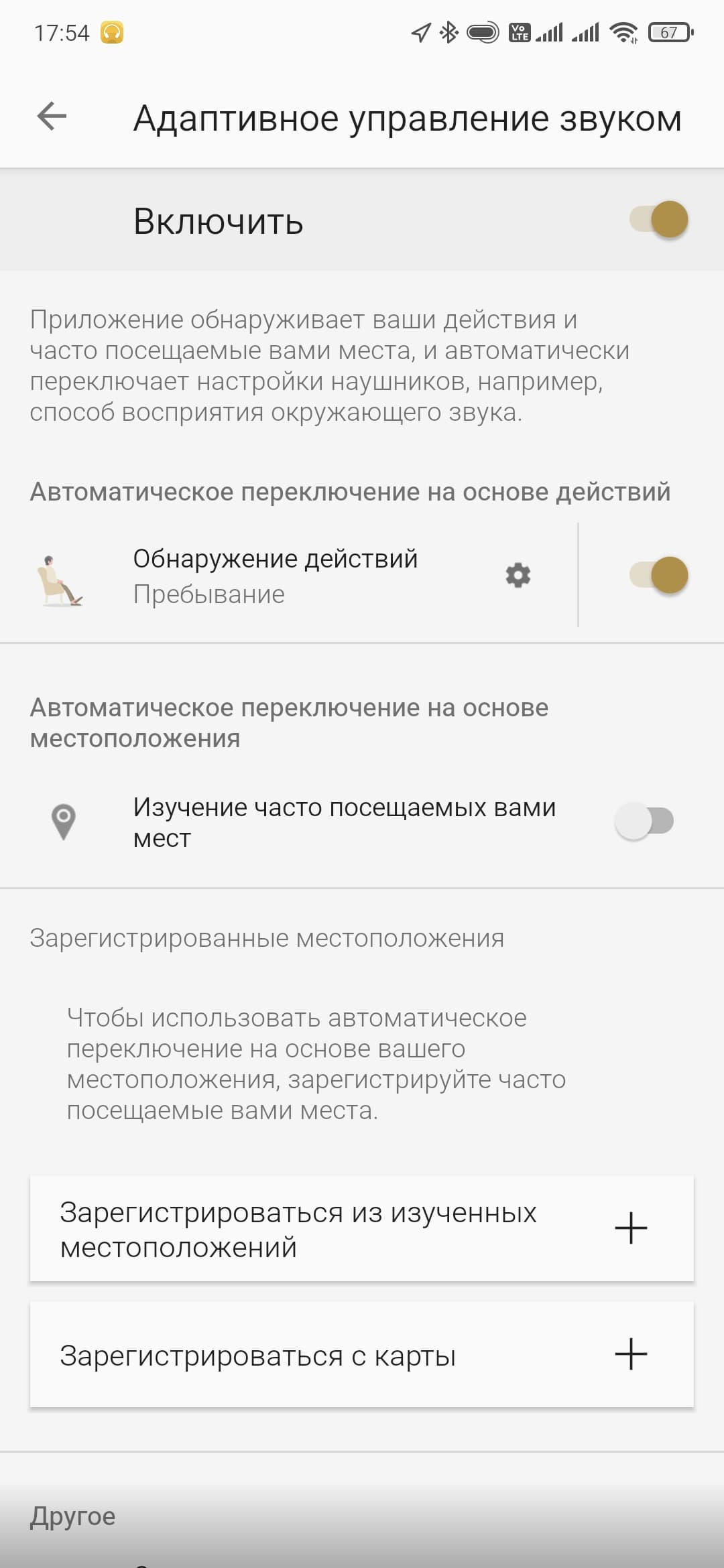 Снова возвращаемся к адаптивному управлению звуком. Система может обнаруживать действия пользователя — от ходьбы до езды в транспорте, а также ориентироваться на геопозицию. И в соответствии с этим активировать тот или иной комплект настроек, который можно изменить под себя в соответствующей вкладке. Сразу определиться с тем, что и в какой момент будет удобнее, сложно — слишком уж много всего. Но через пару-тройку дней понимание приходит, все нужные опции выбираются… После этого про эту вкладку можно надолго забыть.