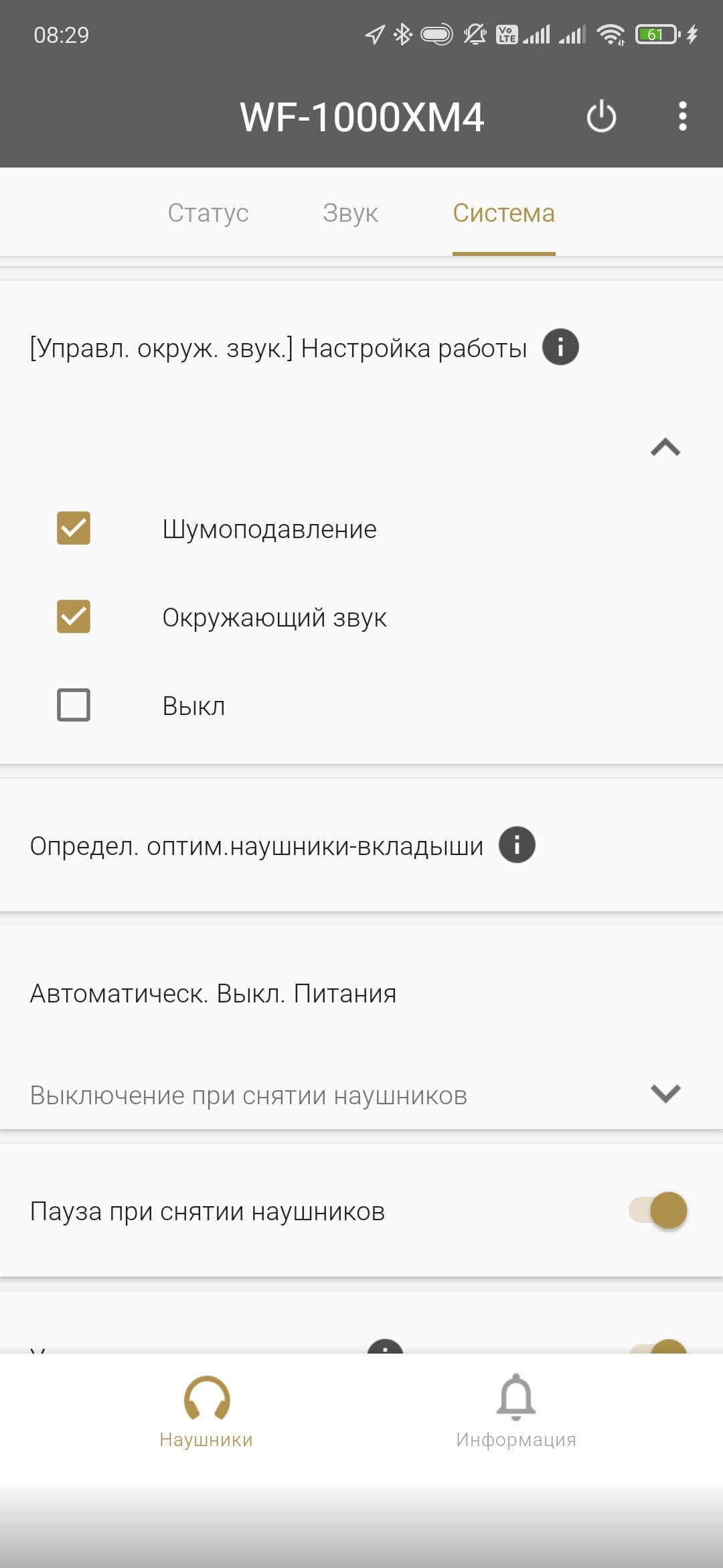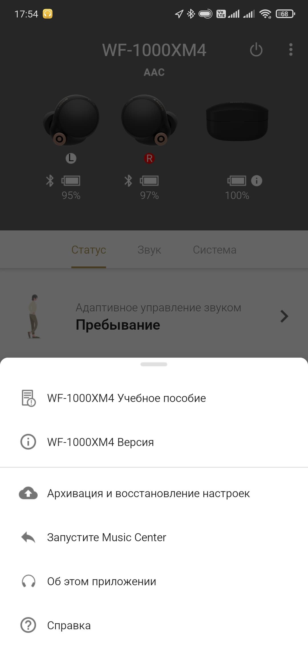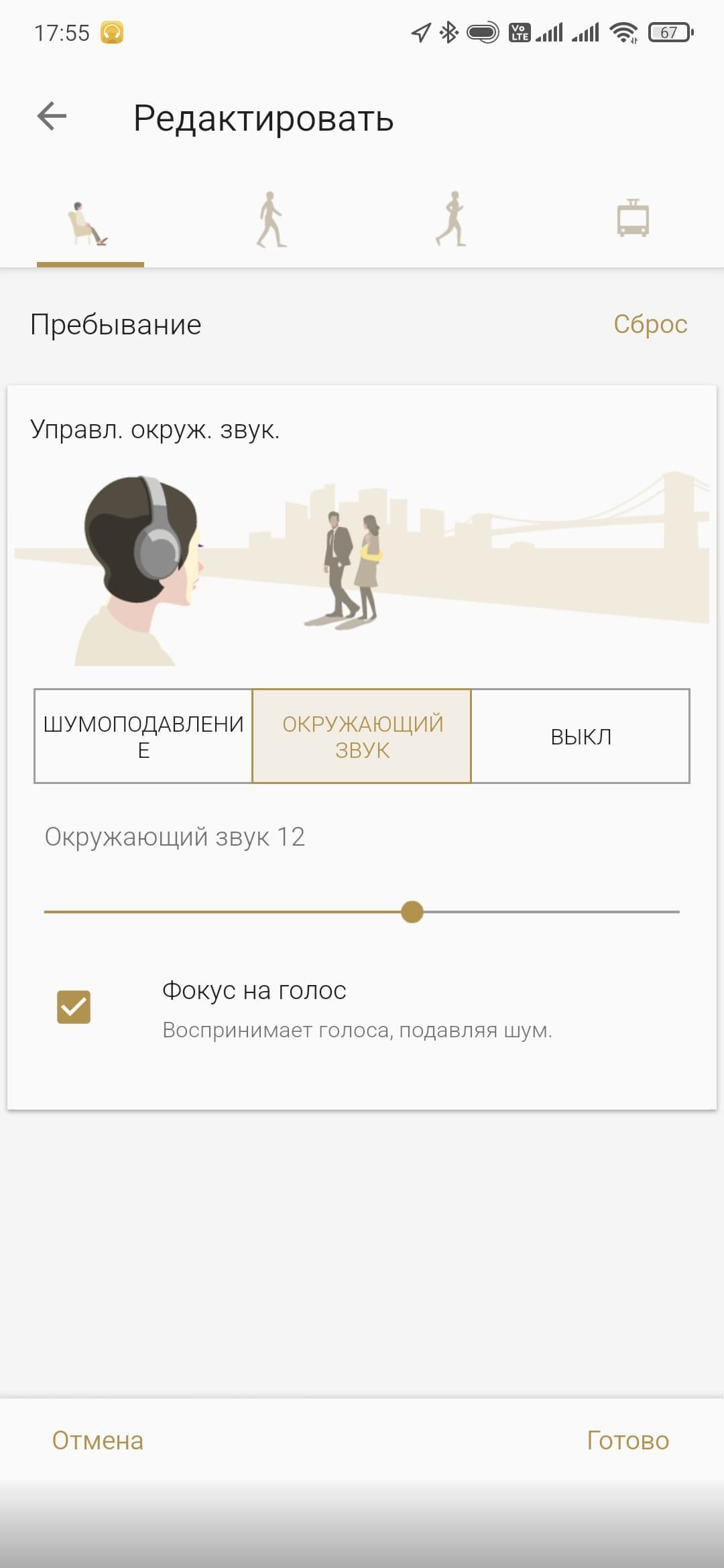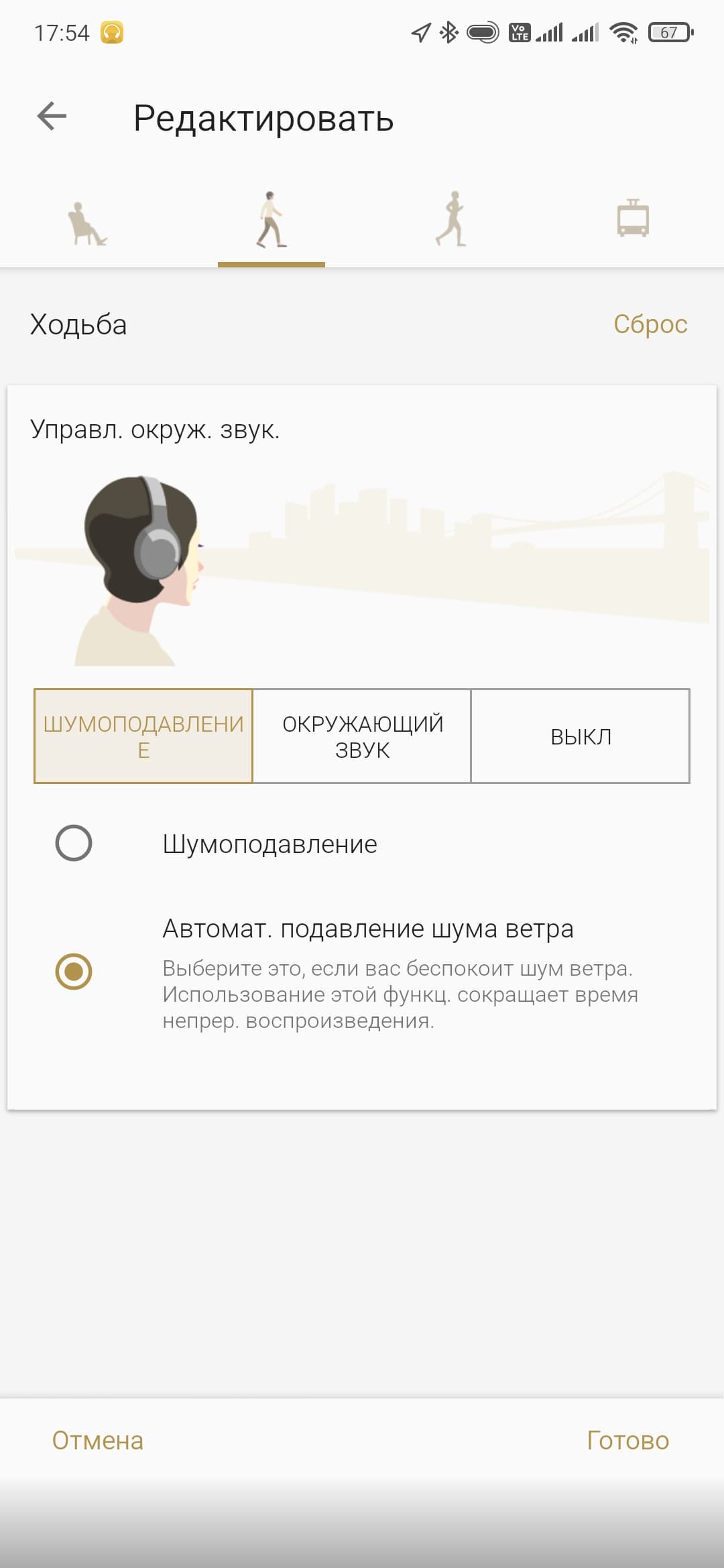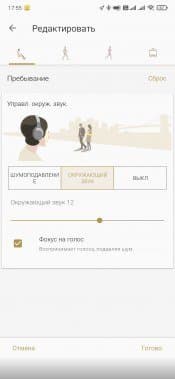 Первым делом можно восстановить ранее сохраненные настройки — учитывая их количество, это очень даже полезная опция. Далее задействуется адаптивное управление звуком — чуть ли не главная «фишка» гарнитуры, позволяющая изменять режимы работы в зависимости от активности пользователя, его положения и так далее.