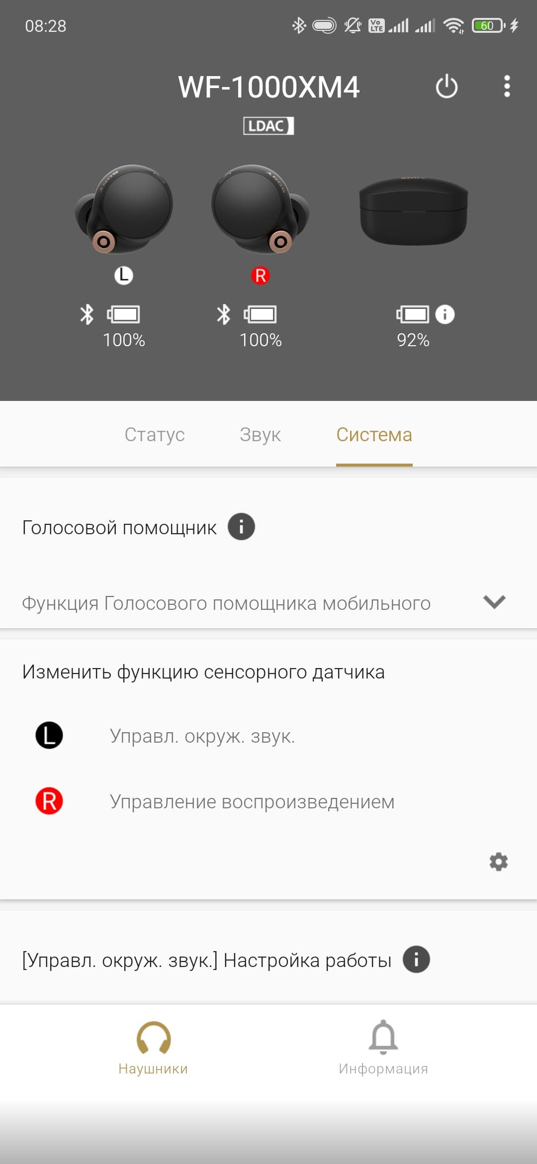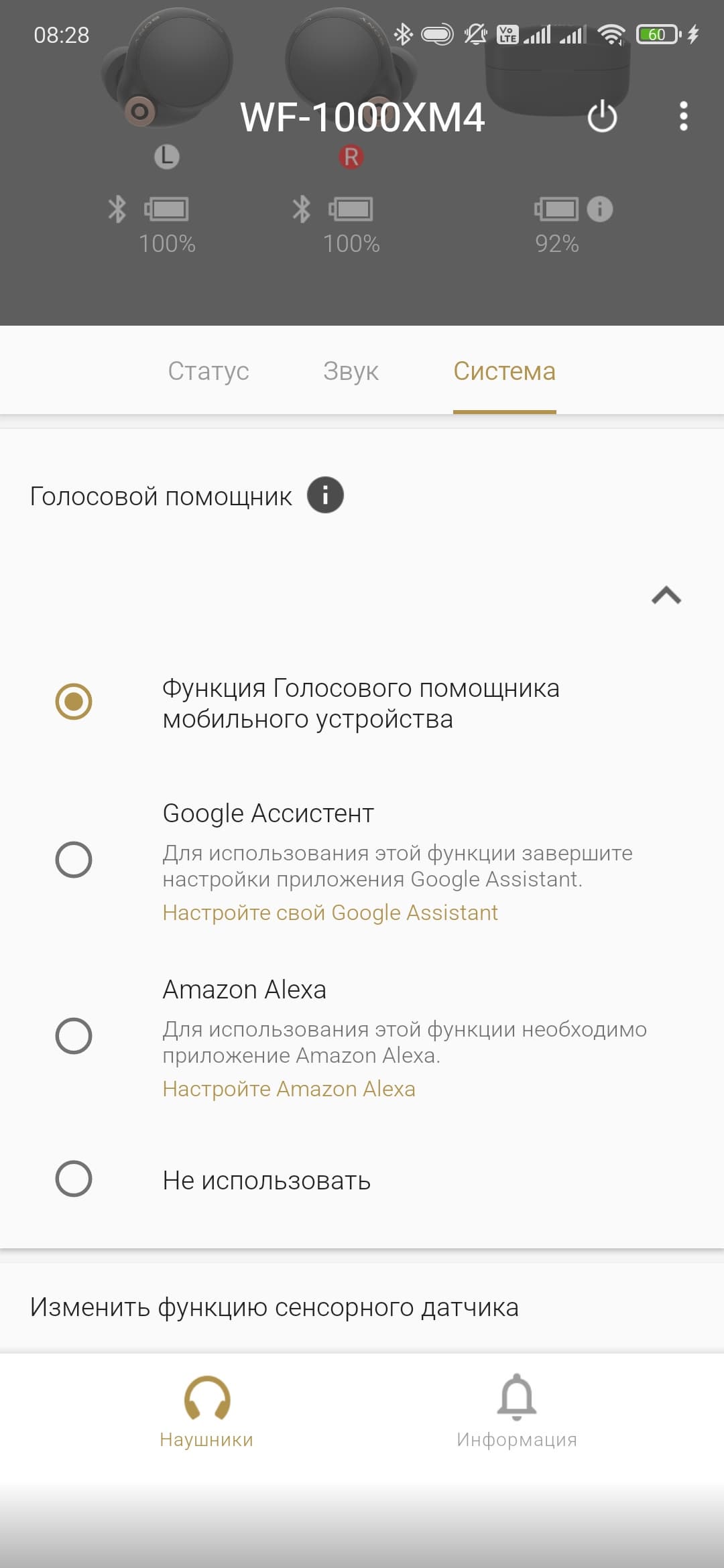 «Ведущего» и «ведомого» наушников у WF-1000XM4 вроде как нет, любой может подключаться и работать отдельно. Но не обошлось без забавных нюансов. Если на одном из наушников подключен Google Assistant или другой голосовой помощник, то он становится как бы главным и без него второй отказывается работать. При этом ассистента можно «повесить» только на тот наушник, где датчику касания назначена функция воспроизведения музыки. Вот такие немного странные нюансы. К счастью, комфорт использования они особо не снижают.