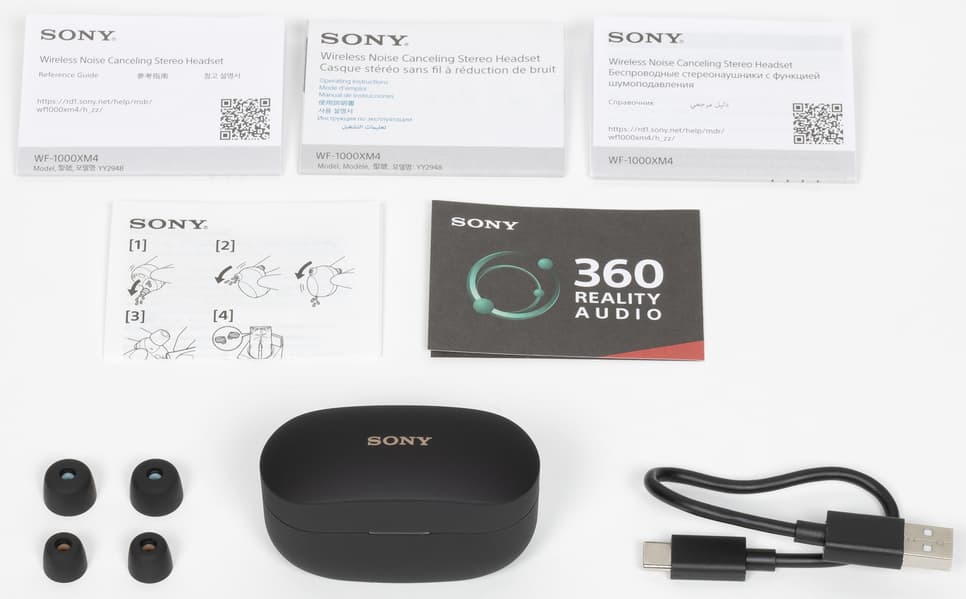 В комплект поставки входят сами наушники в зарядном кейсе, три пары амбушюров (одна установлена по умолчанию), кабель USB — USB Type-C длиной 20 см, документация и купон, дающий возможность подписаться на один из предложенных на выбор стриминговых сервисов.