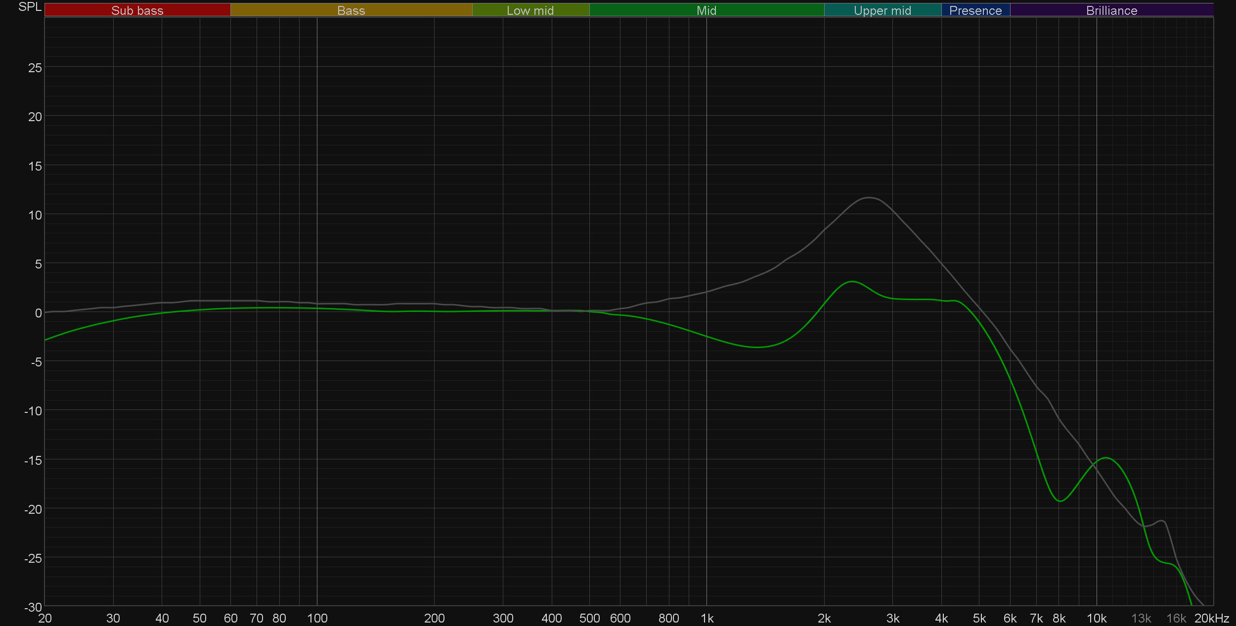 График АЧХ выше показан на фоне кривой IDF (IEM diffuse field compensation), предоставленной производителем используемого стенда. Ее задача — помочь скомпенсировать резонансные явления в имитированном слуховом канале и особенности используемого оборудования, создав «звуковой профиль», максимально корректно иллюстрирующий то, как звучание наушников воспринимается слушателем. Ее можно рассматривать как адаптированный под конкретное устройство аналог так называемой «кривой Хармана», созданной командой Harman International под руководством доктора Шона Олива. Скомпенсируем полученный график АЧХ в соответствии с кривой IDF.