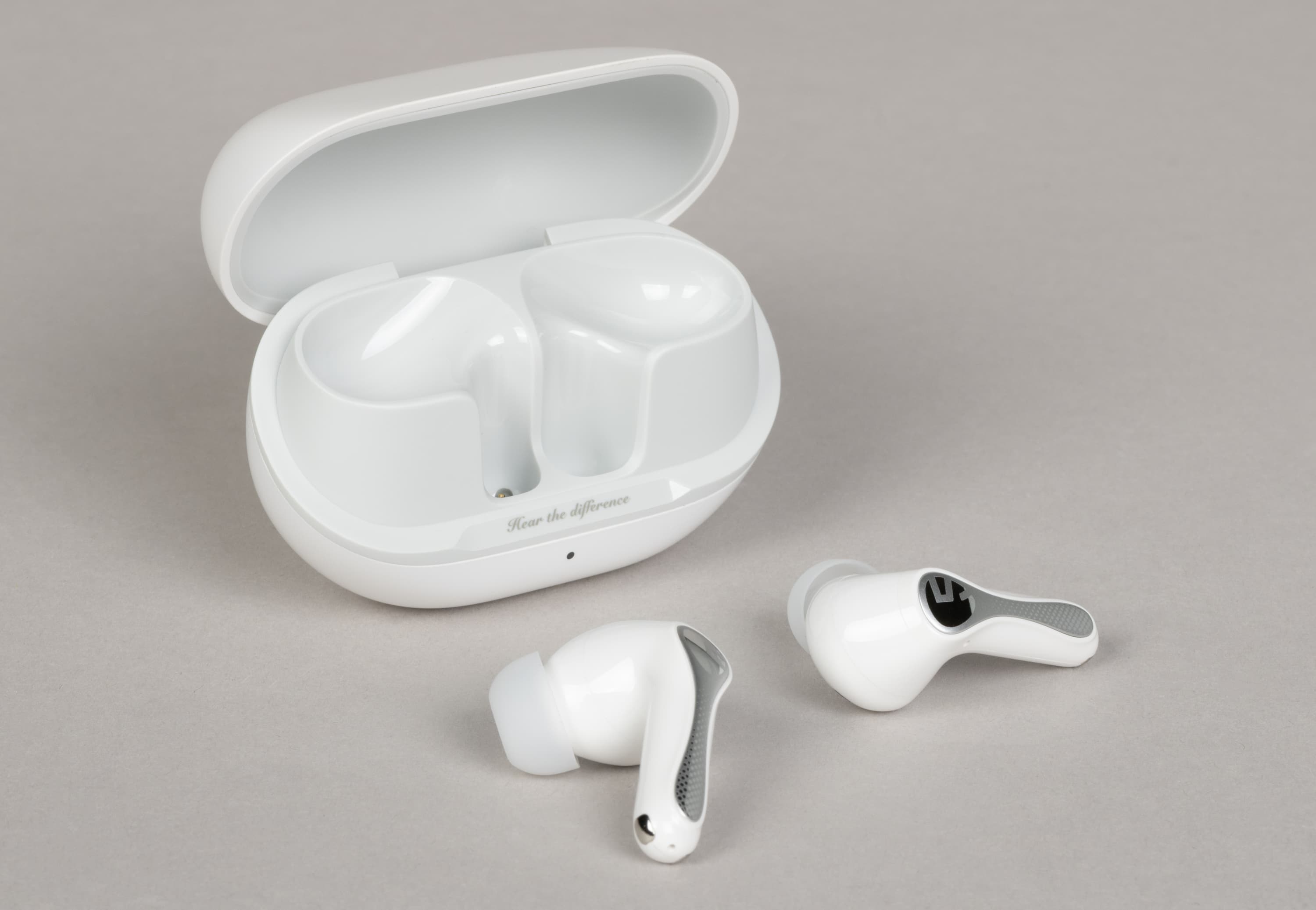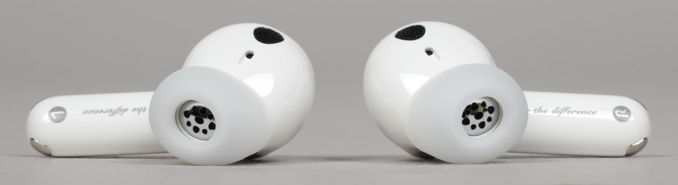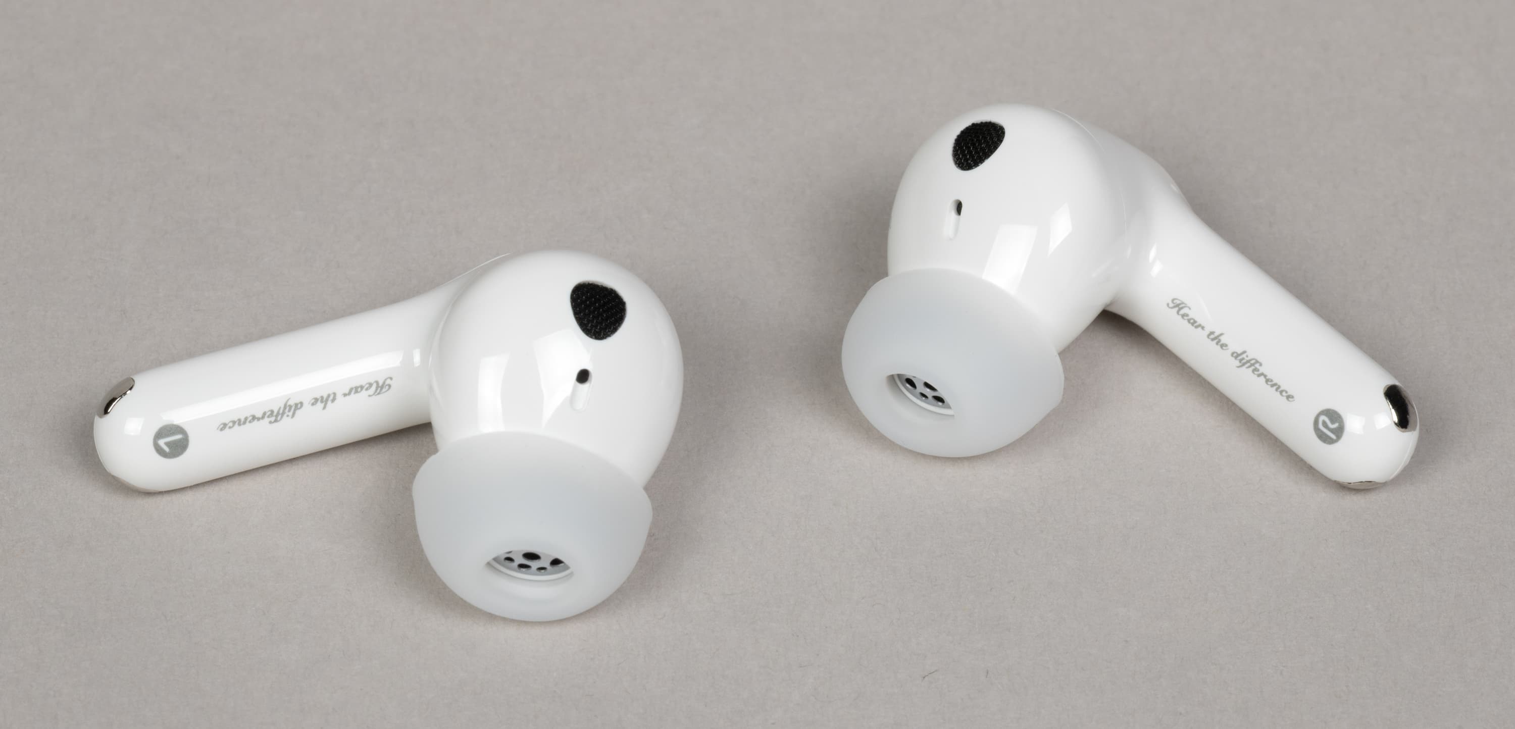 На внутреннюю сторону ножек нанесены обозначения правого и левого наушника, а также тот же слоган «Hear the difference», который мы уже видели на кейсе.