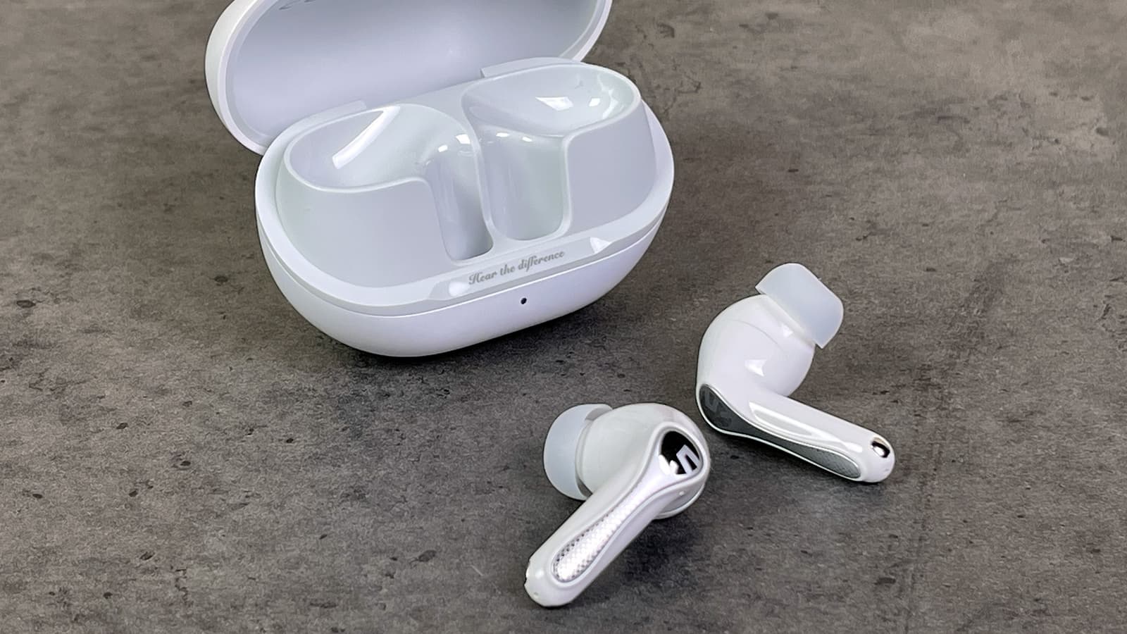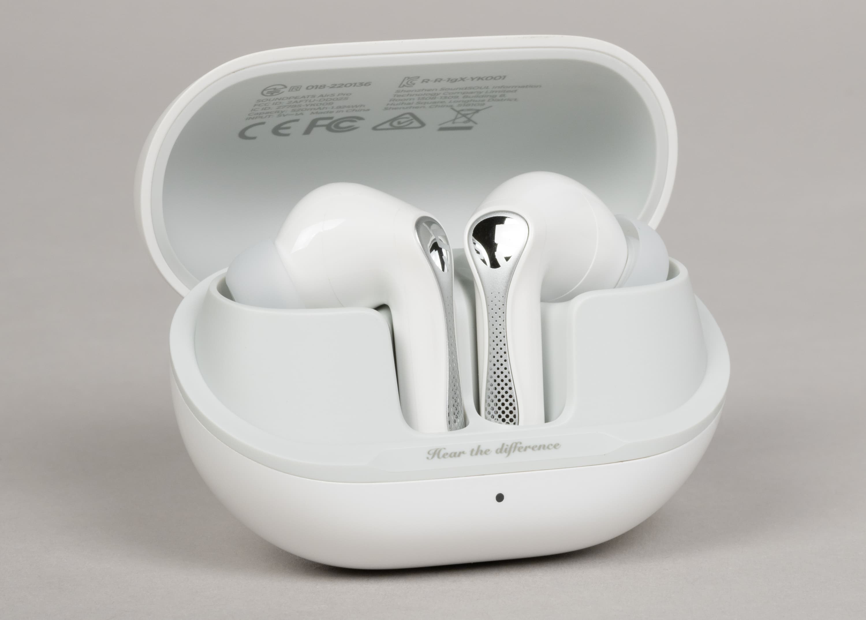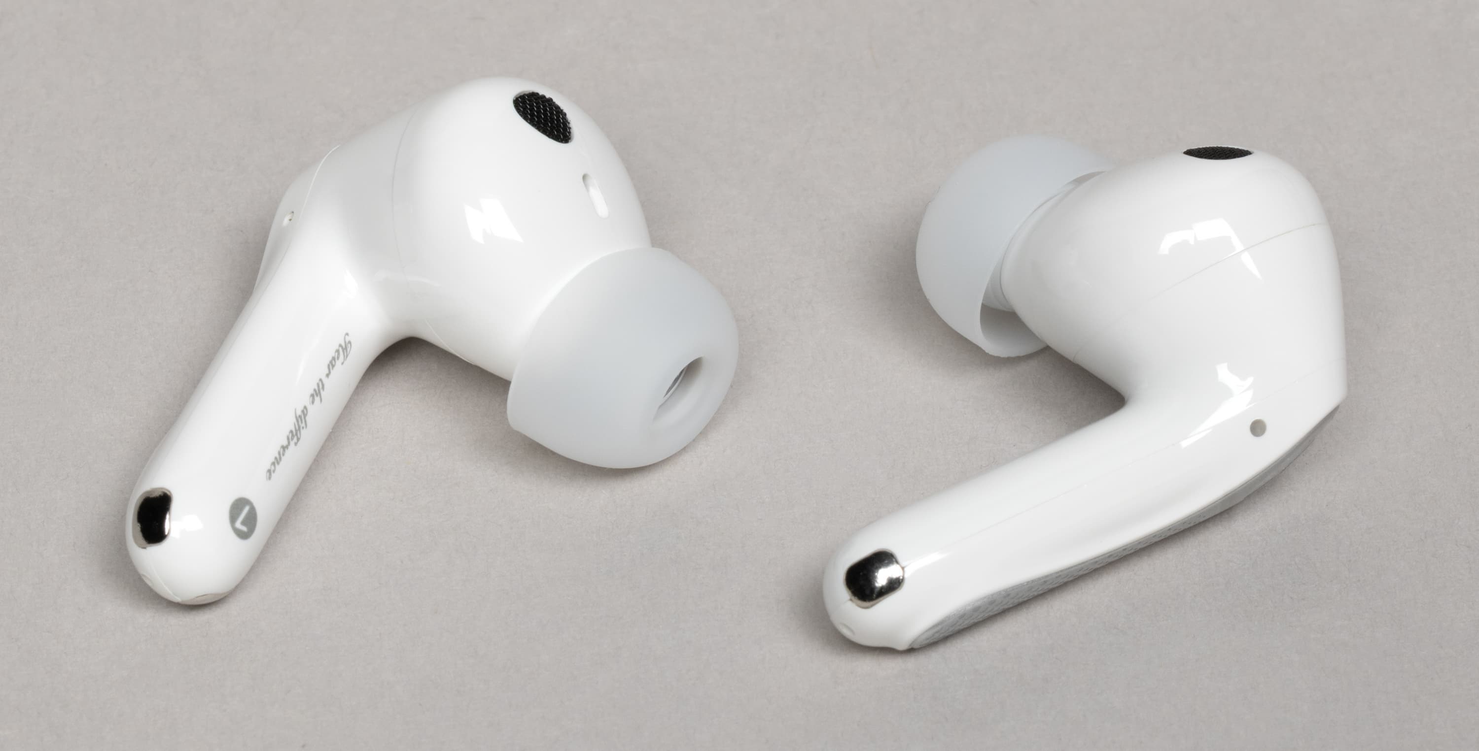 На внутреннюю сторону ножек нанесены обозначения правого и левого наушника, а также тот же слоган «Hear the difference», который мы уже видели на кейсе.