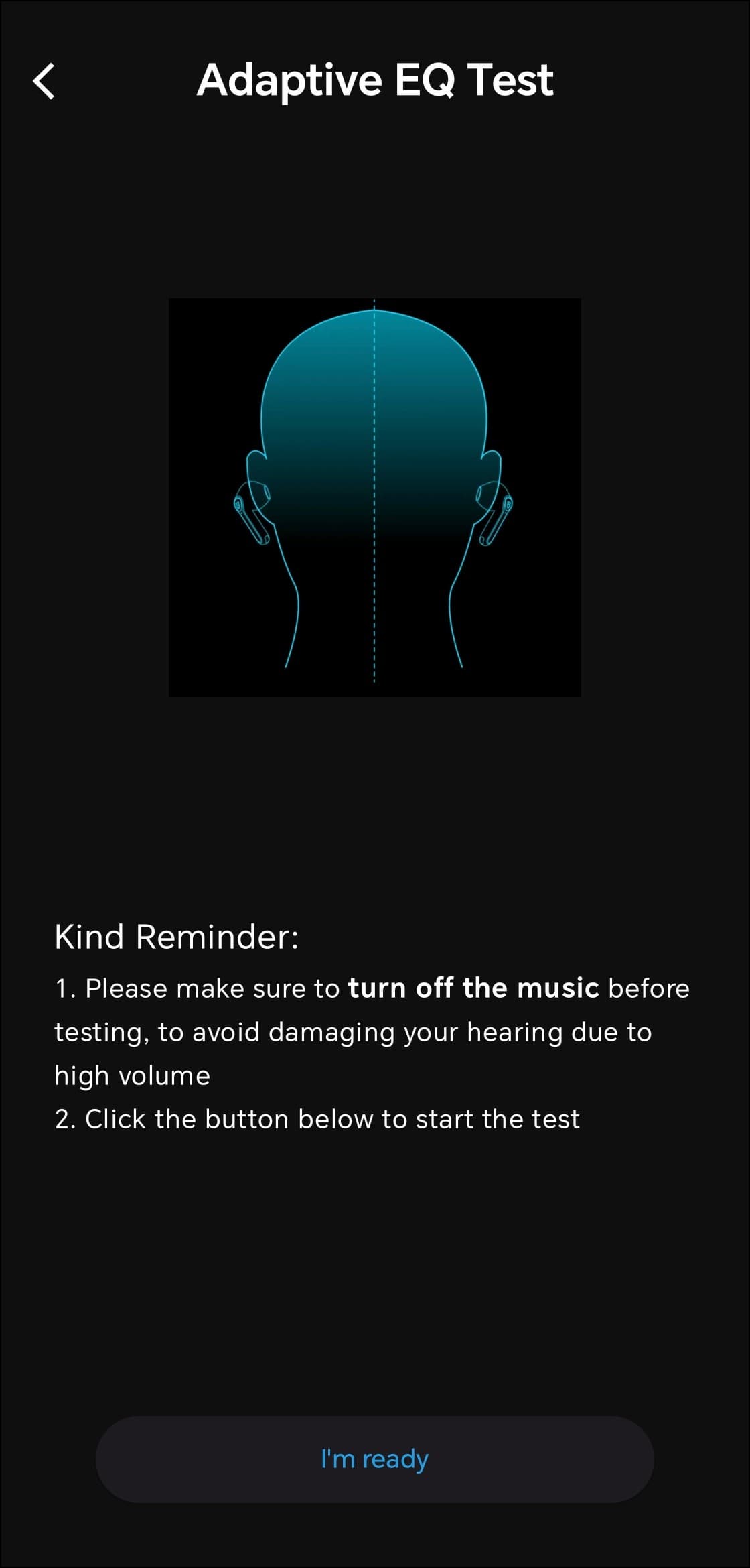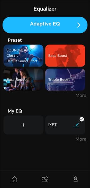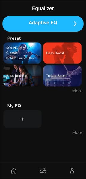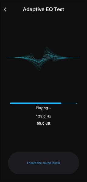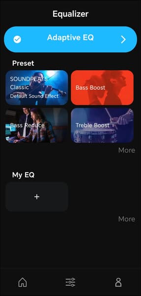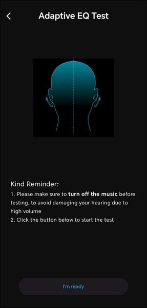 На отдельной вкладке, доступной по нажатию на иконку в нижней части экрана, размещены настройки профиля звучания. В верхней части страницы находится модуль запуска адаптивного эквалайзера. После его активации приложение проводит проверку слуха: воспроизводит тоны разной частоты с постепенно растущей громкостью и предлагает пользователю нажать кнопку в момент, когда сигнал становится различим. На основе полученных ответов формируется кривая эквализации, компенсирующая индивидуальные особенности восприятия. Метод давно известный и вполне рабочий.