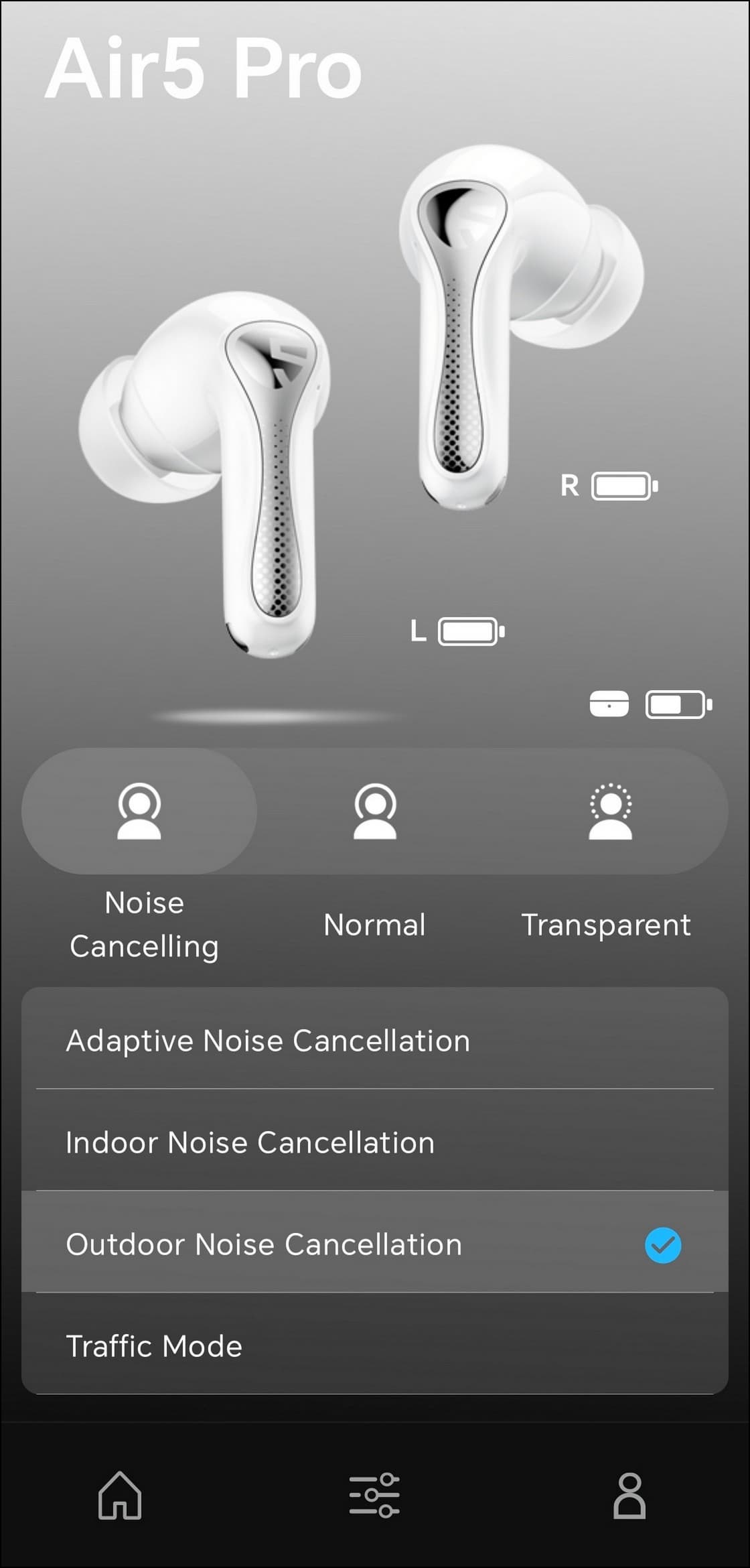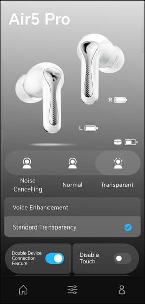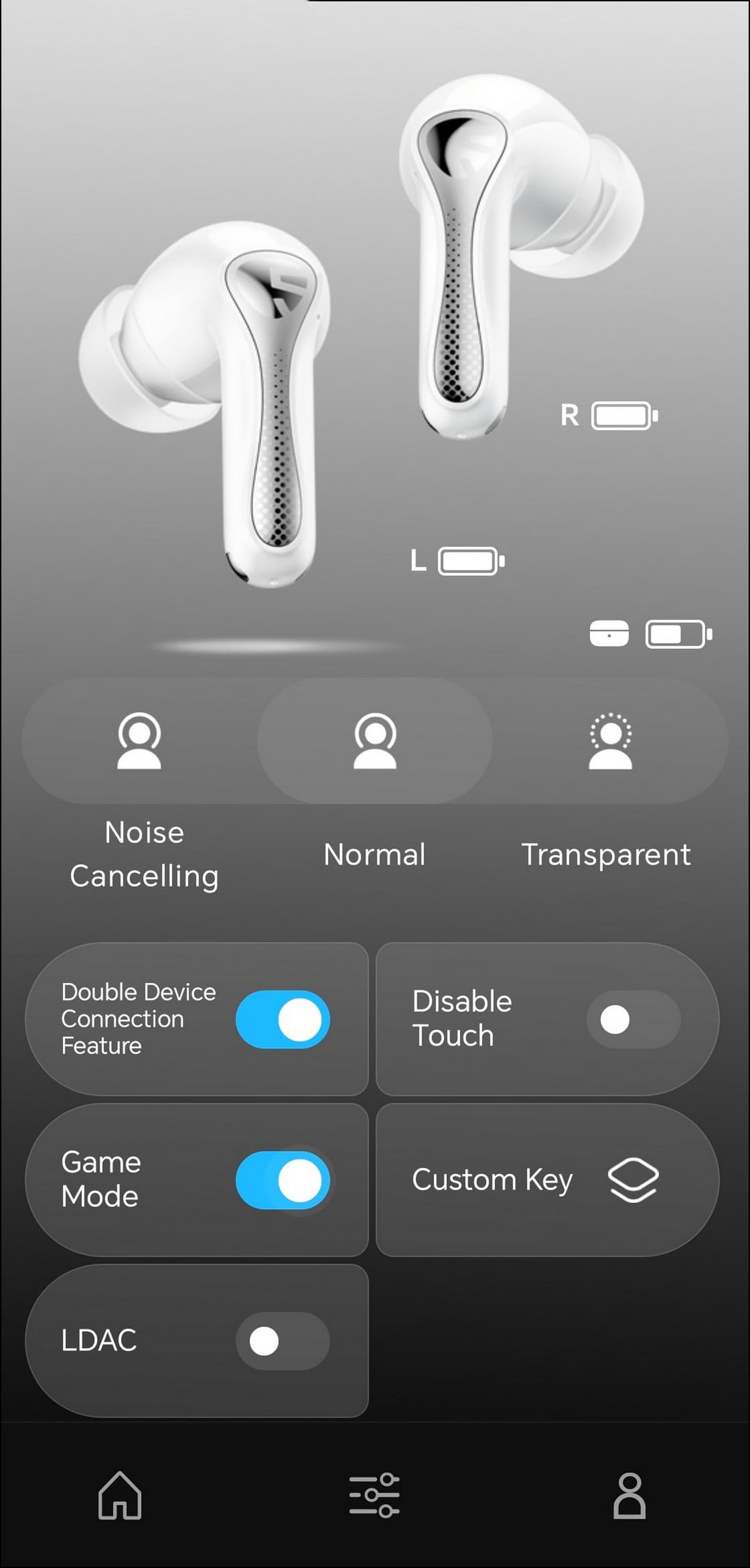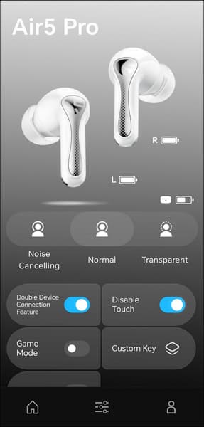 В центре экрана размещено крупное изображение наушников, индикаторы зарядки каждого из них и кейса, а ниже — несколько модулей с переключателями.