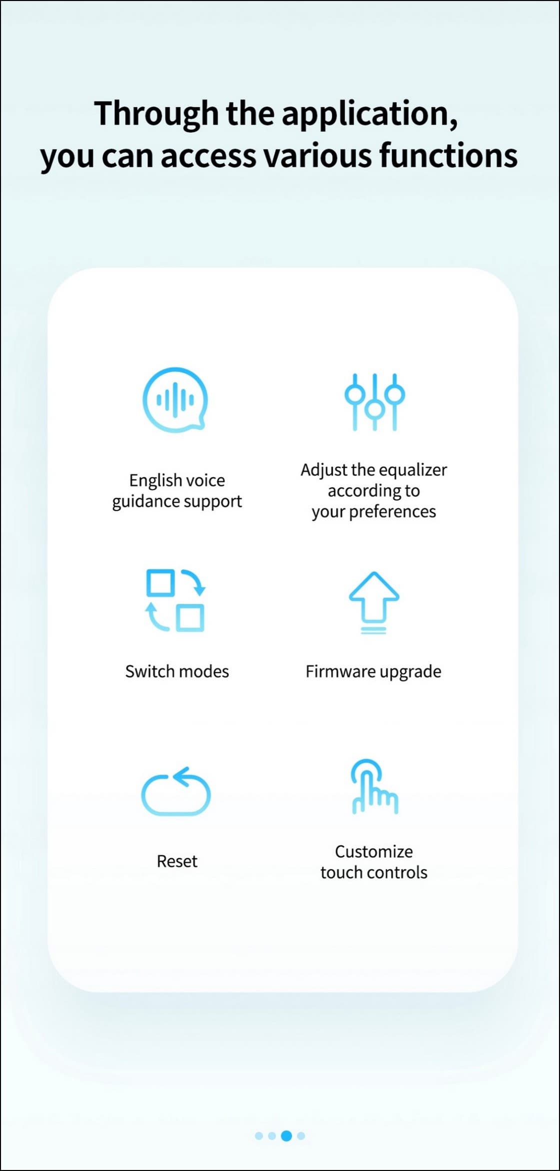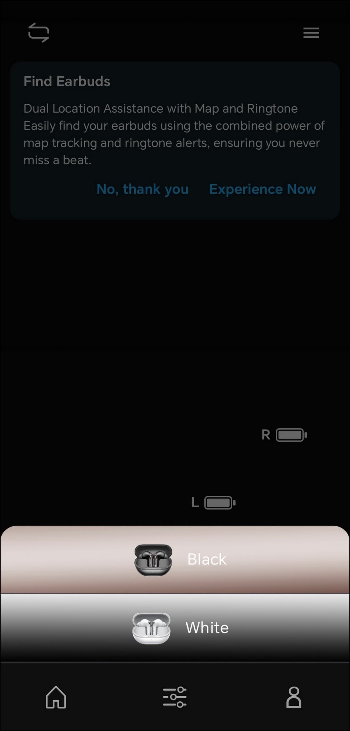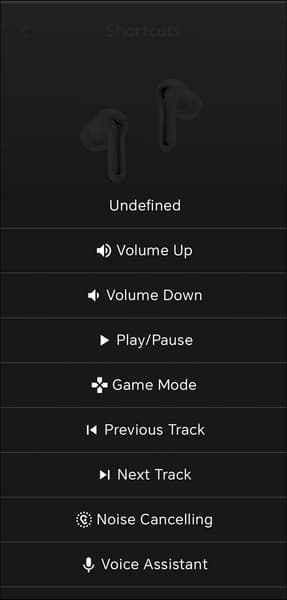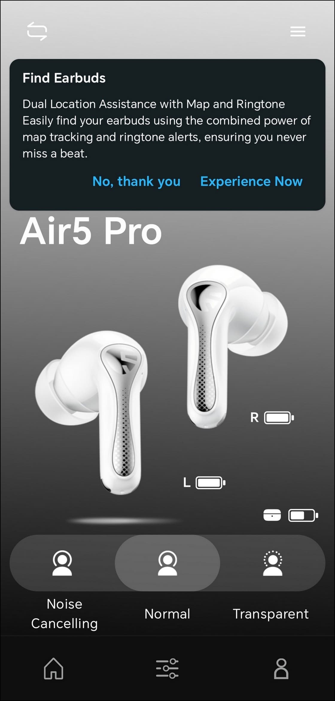 В центре экрана размещено крупное изображение наушников, индикаторы зарядки каждого из них и кейса, а ниже — несколько модулей с переключателями.