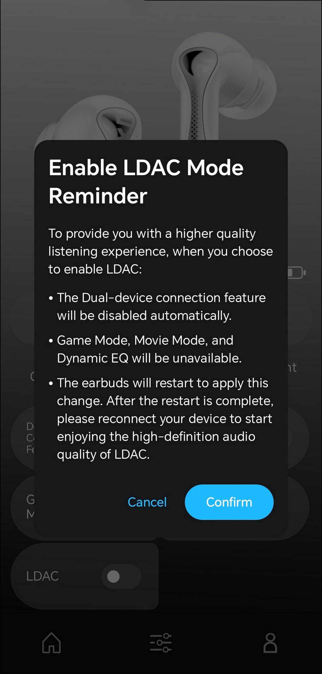 После включения кодека LDAC появляется предупреждение о том, что при его активации не работает мультипойнт — это довольно распространенная особенность гарнитур с поддержкой LDAC, хотя в последнее время все чаще встречаются модели, в которых этого конфликта уже нет. Кроме того, при активации «хайрезного» кодека становятся недоступны игровой режим и динамический эквалайзер. На этом фоне aptX Lossless выглядит гораздо более выигрышным решением.