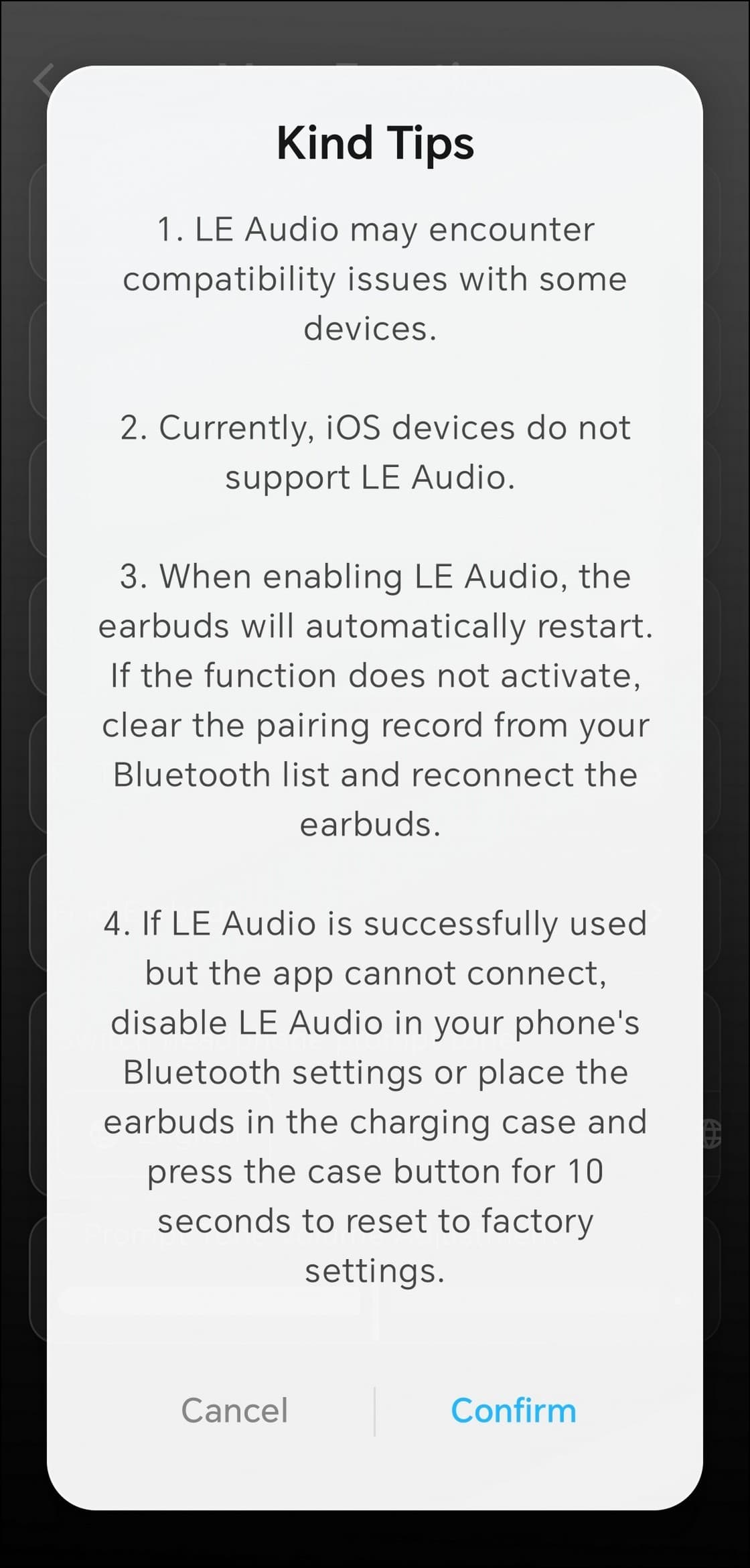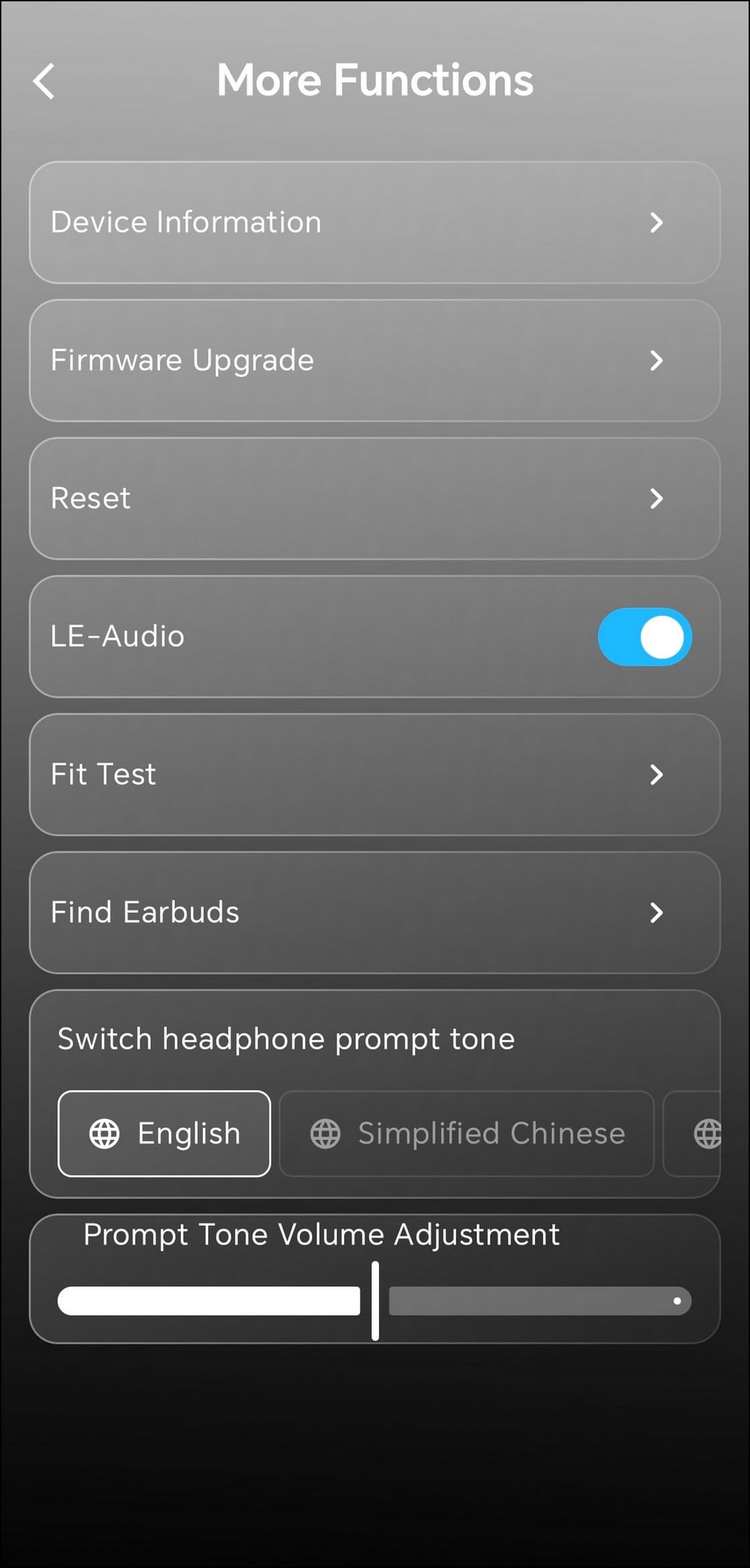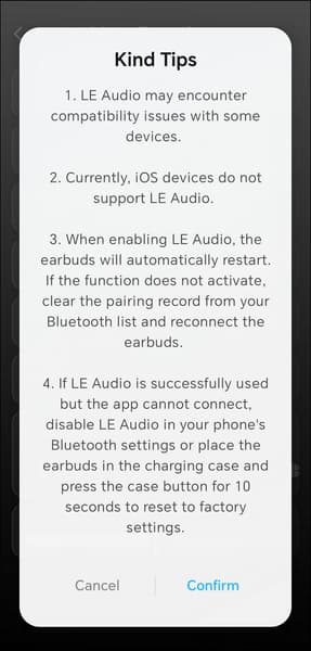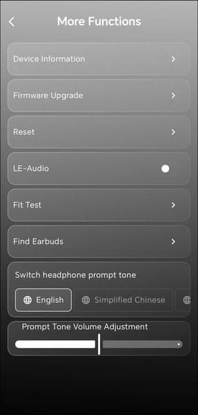Часть настроек скрыта в отдельном меню, которое открывается по нажатию на иконку в правом верхнем углу экрана. В частности, туда вынесли включение режима LE Audio — немного странно, что для LDAC нашлось место на главной странице, а для него нет, тем более что свободное пространство там как раз имеется. При активации режима появляется всплывающее окно с информацией о пока еще ограниченной поддержке и предупреждением о том, что приложение может перестать «видеть» устройство — в этом случае гарнитуру придется сбросить к заводским настройкам, чтобы все снова заработало. В том же меню можно переключить язык голосовых сообщений, которыми гарнитура сообщает о своем состоянии, и настроить их громкость. Русского, к сожалению, нет. Там же доступна информация об устройстве, проверка обновлений и прочие сервисные пункты.