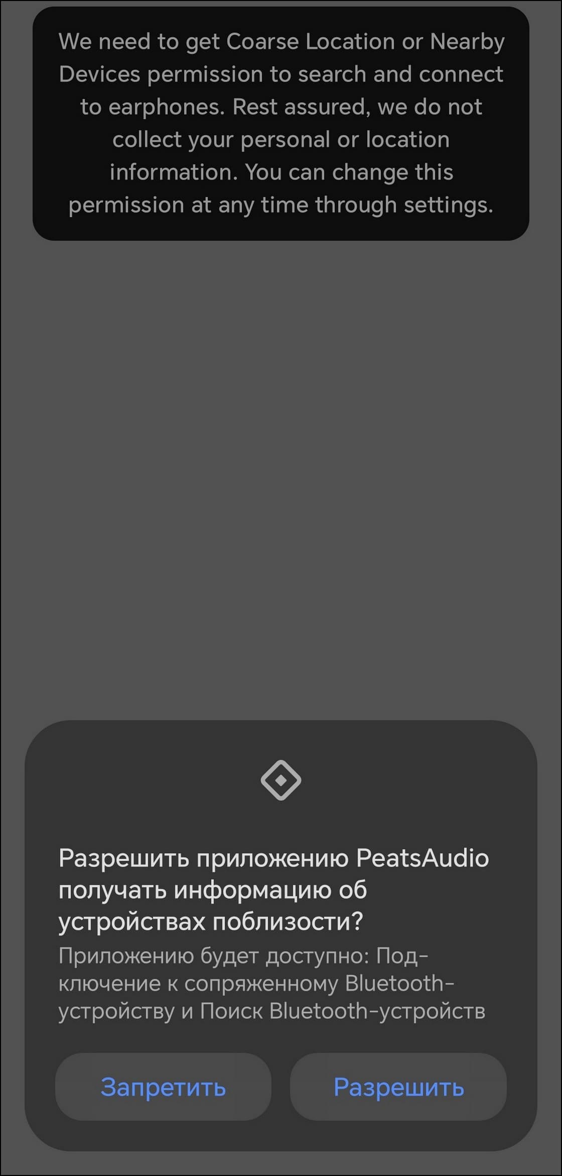 Финальный этап подготовки Soundpeats Air5 Pro к работе — установка фирменного приложения PeatsAudio на устройство-источник. Теоретически гарнитурой можно пользоваться и без него, но на практике без него недоступны ключевые функции гарнитуры, включая выбор кодеков и настройки эквалайзера. После установки программа предлагает познакомиться с парой документов и рекламным объявлением — пропустить их одним движением нельзя, придется пролистывать.