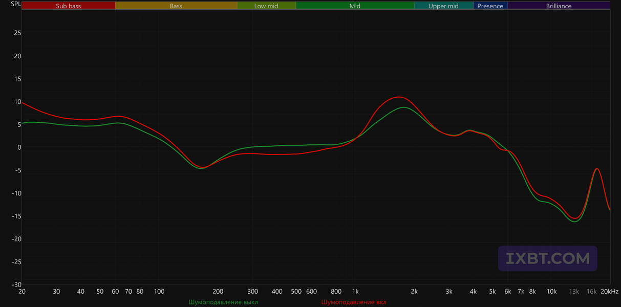 Системы активного шумоподавления, как правило, не лучшим образом влияют на воспроизведение тех частот, в которых они наиболее эффективны — прежде всего на бас. В данном случае влияние заметно, но явно компенсируется встроенным DSP, и в итоге на слух оно если и заметно, то совсем слегка. Так что шумоподавление можно использовать без опасений, ориентируясь только на собственный комфорт.
