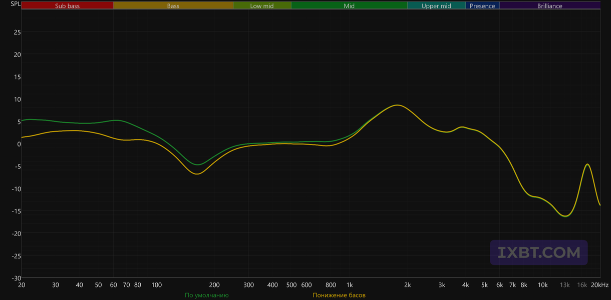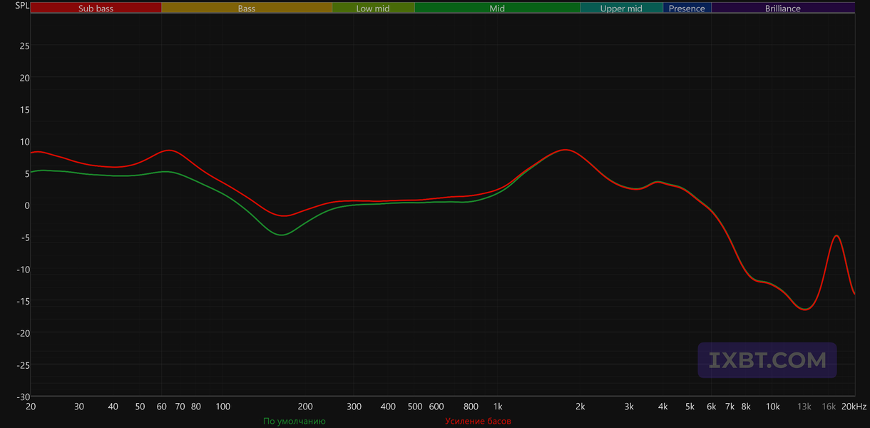 Производитель анонсировал 10-миллиметровый динамик с «композитной биодиафрагмой», который должен обеспечить насыщенный бас, детализированную середину и чистые высокие частоты. По факту форма АЧХ здесь скорее рассчитана на эффектную подачу, чем на нейтральное или строго сбалансированное звучание. Глубокий бас заметно форсирован, что само по себе неплохо для жанров, где низкочастотная основа играет важную роль, — хип-хопа, танцевальной и электронной музыки. Такой акцент подчеркивает ритмическую основу и делает звук более массивным. При этом область среднего баса и нижней середины ослаблена — в районе 150 Гц виден заметный провал, который помогает избежать лишней гулкости, но одновременно уменьшает «телесность» мужского вокала и нижнего регистра инструментов.