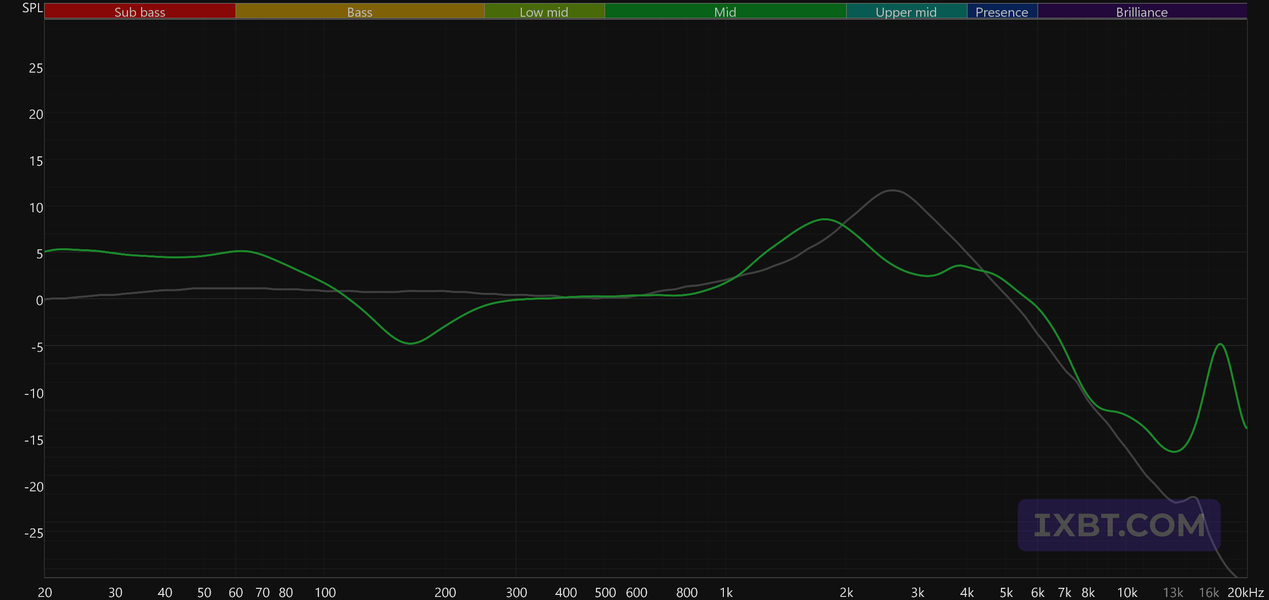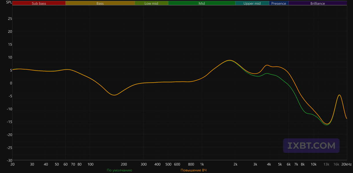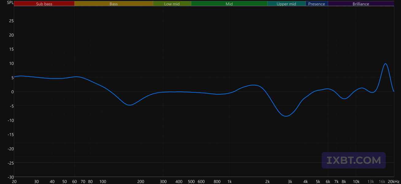 Нижняя середина в целом подается спокойно, однако в области присутствия сохраняется выраженный акцент. Относительно целевой этот подъем смещен немного ниже по частоте, из-за чего звук может восприниматься как более собранный и разборчивый. Однако на сложных и плотно сведенных записях такая настройка может добавлять жесткости и быстрее утомлять. Верхние частоты после этого участка подаются достаточно сдержанно, что в данном случае выглядит логично: при такой настройке верхней середины дополнительный избыток яркости только усилил бы ощущение резкости.