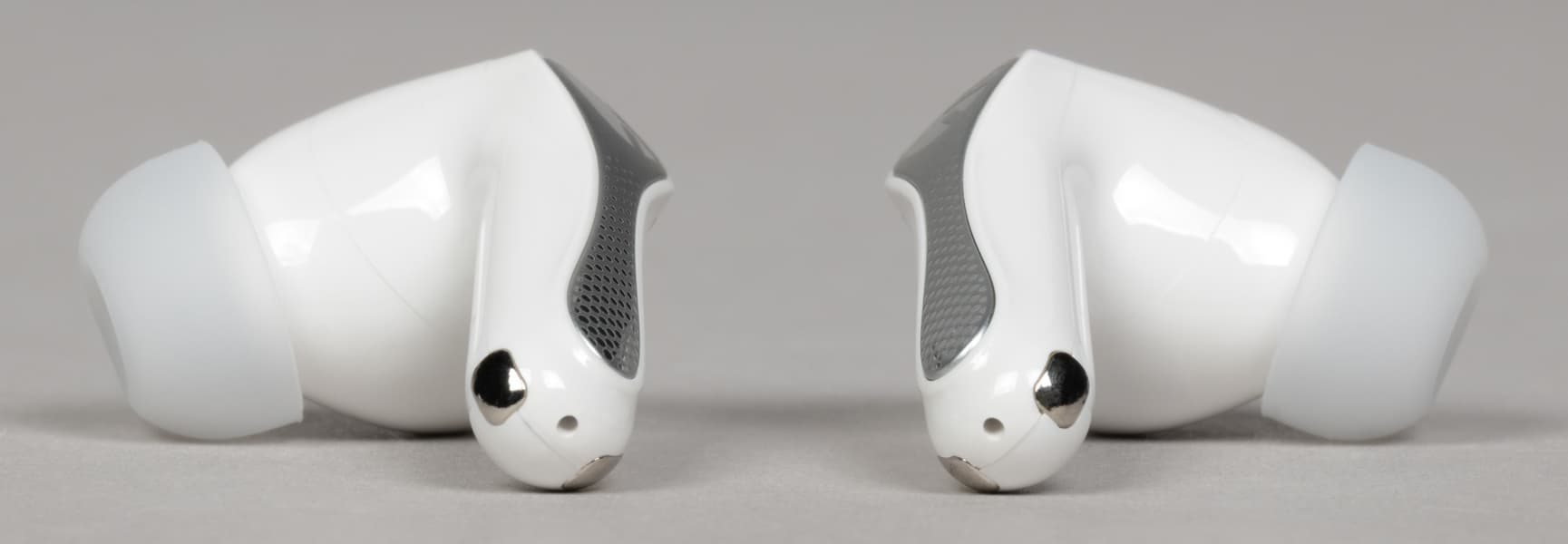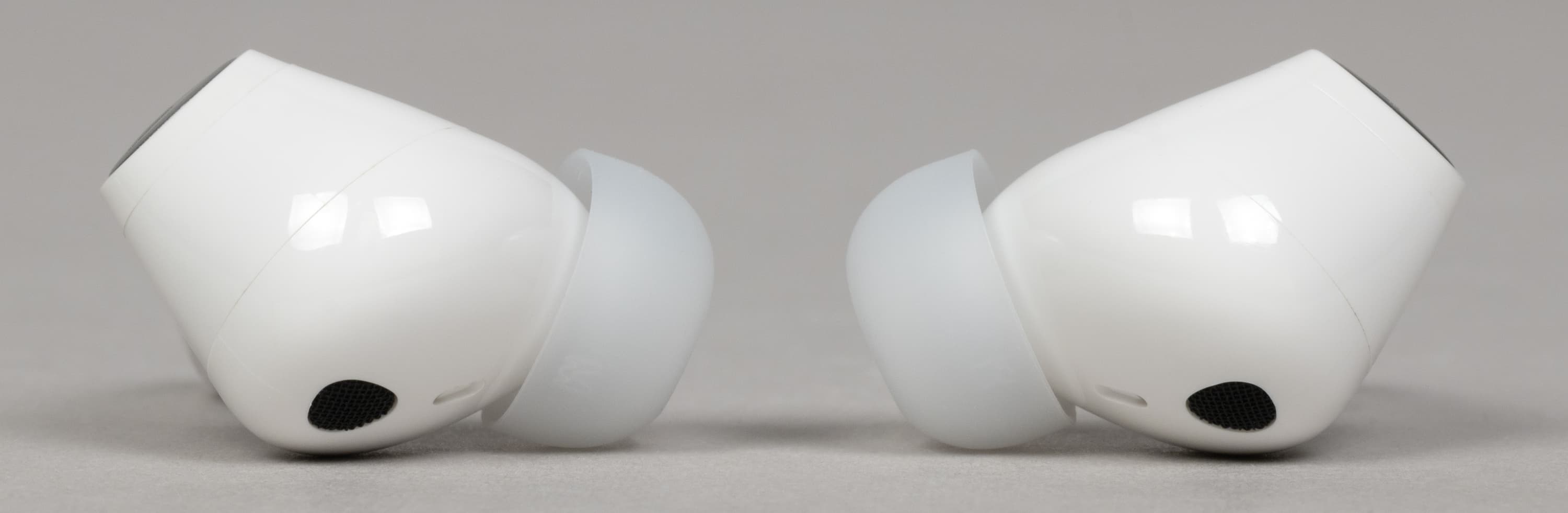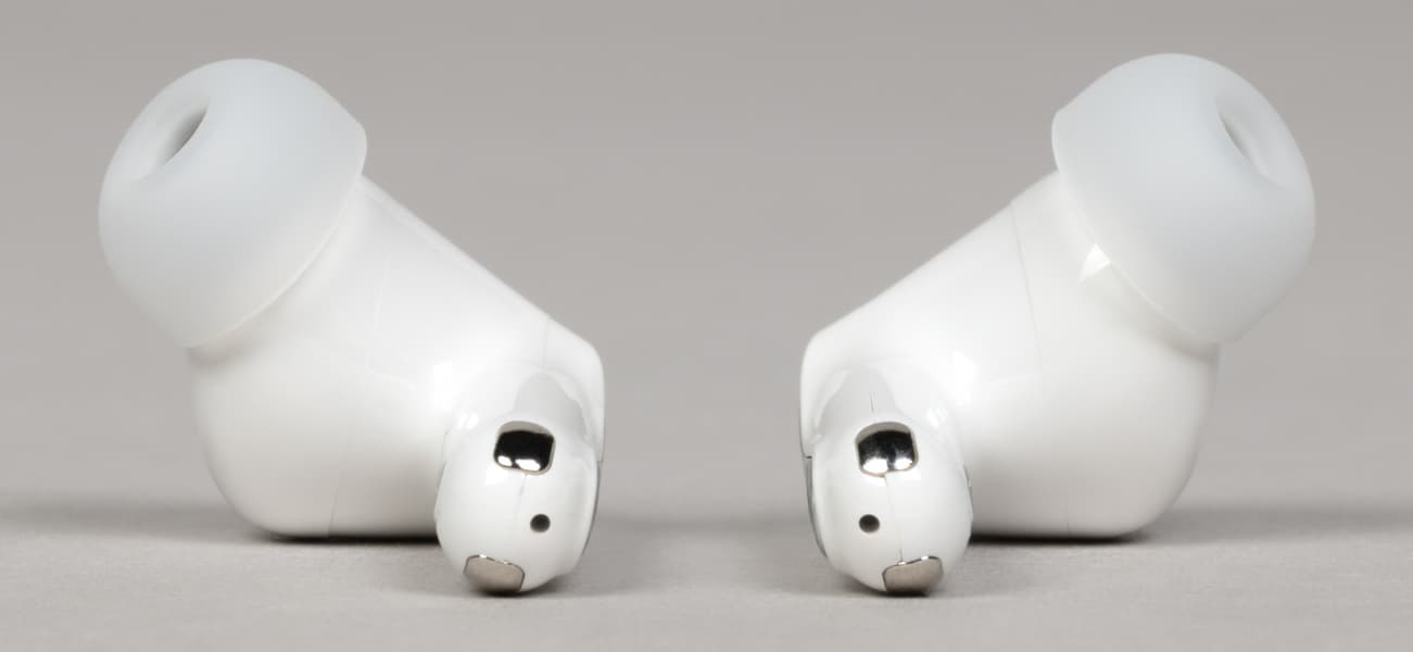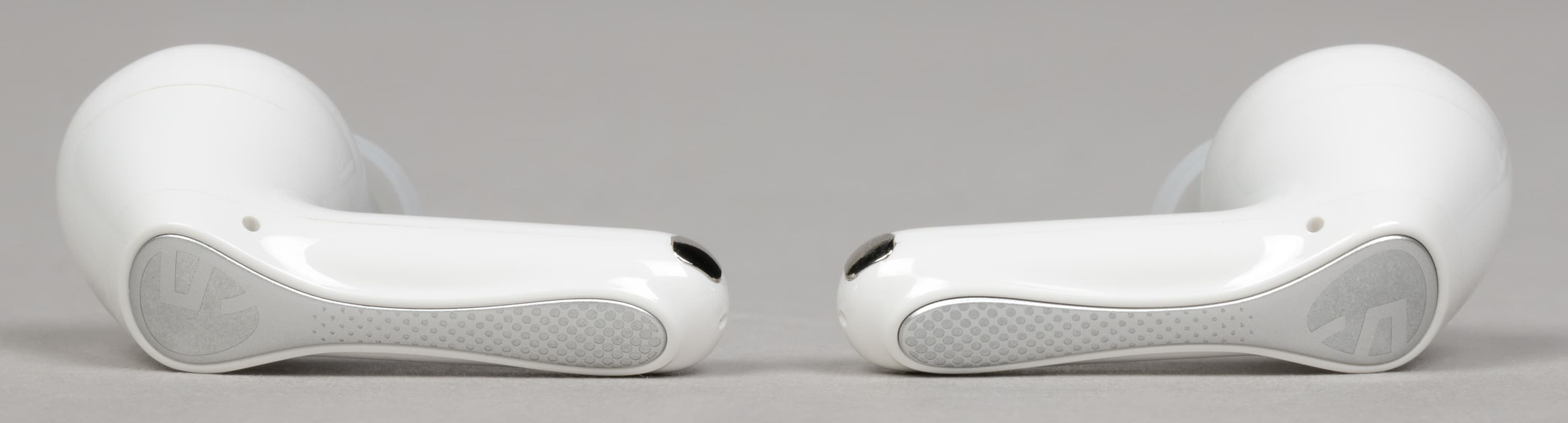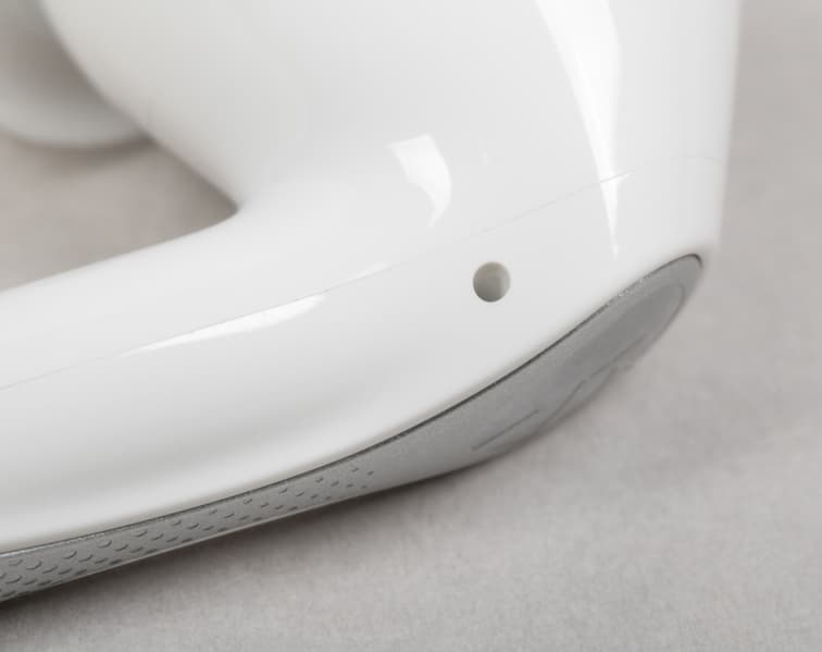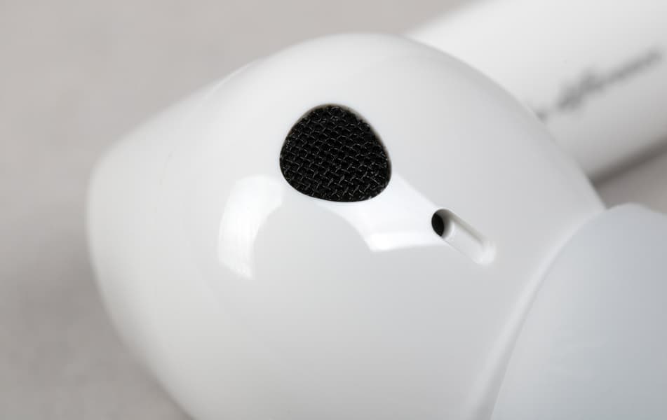 На внутренней поверхности округлой части расположены два отверстия: одно покрупнее, прикрытое металлической сеткой, и второе — меньшего диаметра. Вероятнее всего, за первым скрывается внутренний микрофон системы активного шумоподавления, а второе выполняет компенсационную функцию — служит для сброса избыточного давления при работе динамического драйвера.