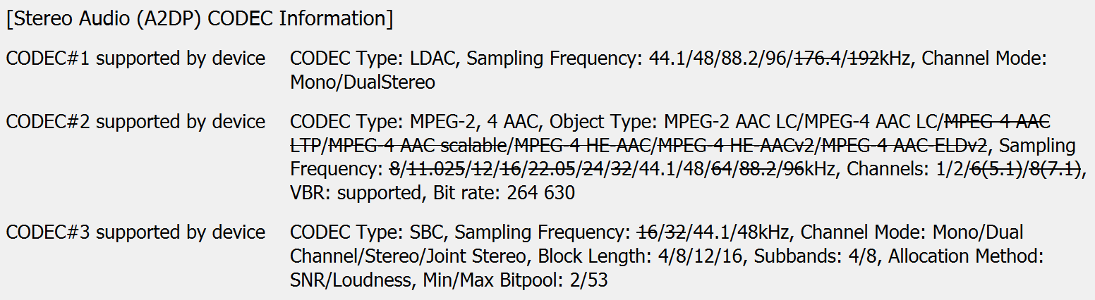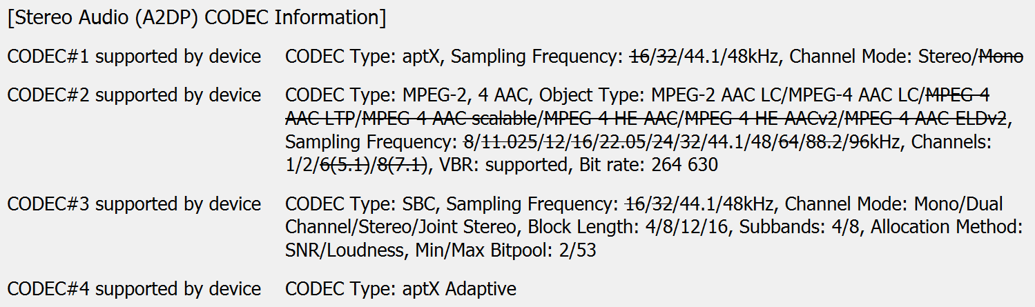 Заодно можно заглянуть и в параметры базовых кодеков. Для модели, ориентированной на продвинутые решения, это не самый очевидный вариант использования, но проверить его все равно интересно. Для SBC максимальное значение Bitpool установлено на уровне 53, тогда как профиль High Quality предполагает 51 — то есть кодек фактически работает на пределе своих возможностей. Битрейт AAC ограничен чуть выше типичных для него 256 кбит/с — он также задействован по максимуму.