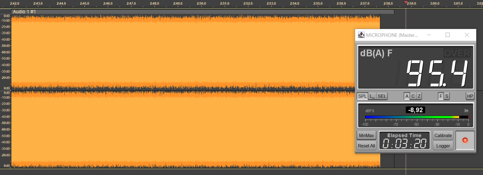 Безопасным уровнем звукового давления при прослушивании музыки считается 75 дБ, но на практике большинство слушателей предпочитает уровень 90-100 дБ. Мы транслируем в наушники белый шум, фиксируя уровень SPL в районе 95 дБ, сразу после старта воспроизведения запускаем запись сигнала с измерительного стенда — по длине получившегося трека легко понять, сколько проработал каждый из наушников.