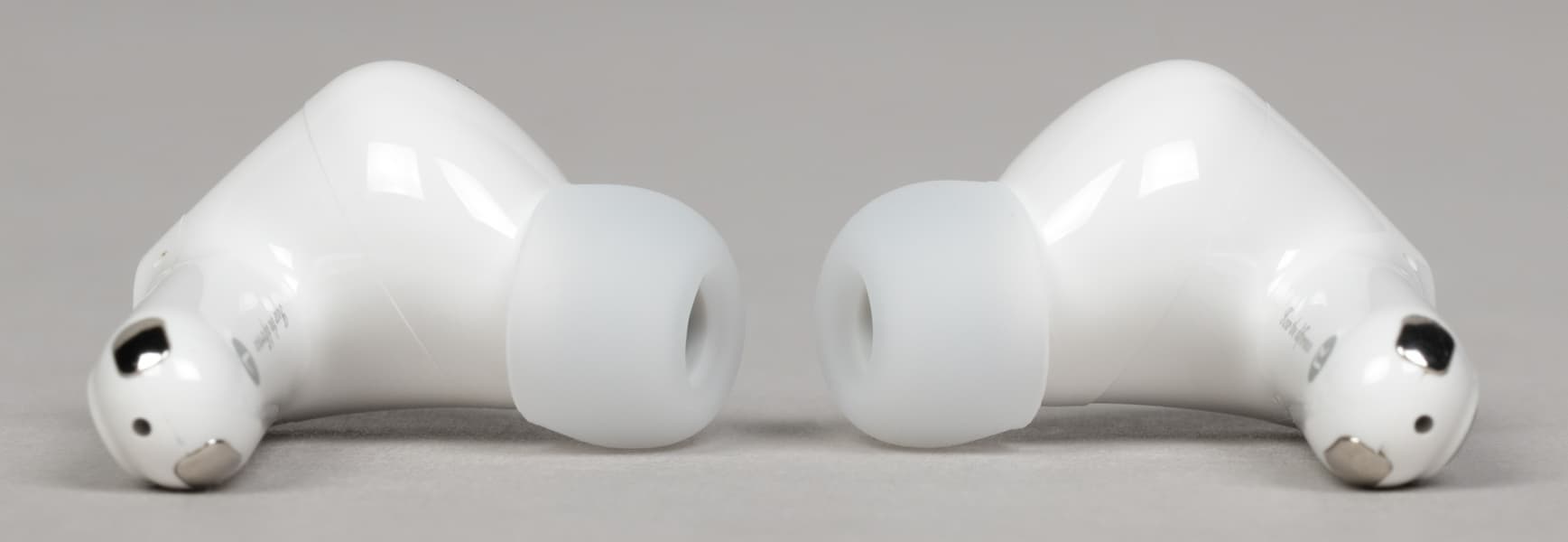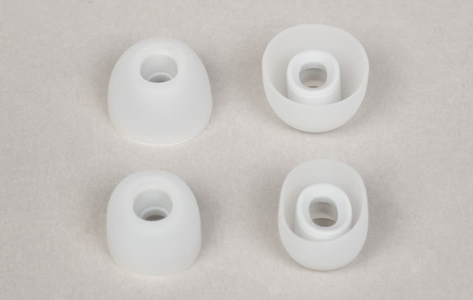 Насадки имеют плотный сердечник и мягкую внешнюю часть — матовую и приятную на ощупь. В комплекте три пары: маленькая и большая лежат в коробке, средняя установлена на наушники по умолчанию.
