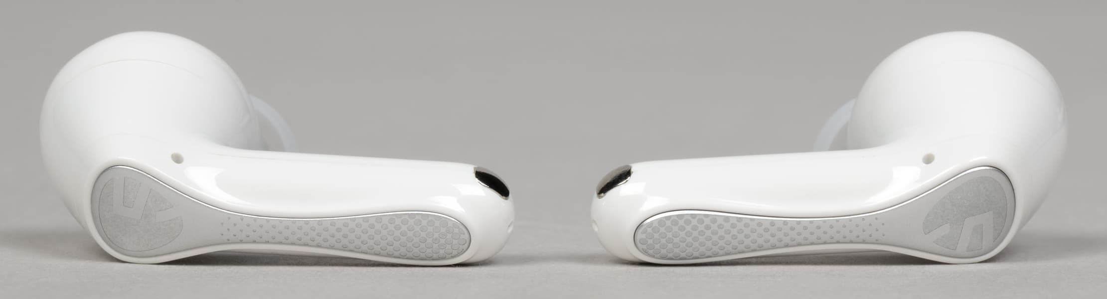 Внешние поверхности ножек оформлены декоративными накладками с логотипом производителя — смотрятся они очень приятно и одновременно служат сенсорными зонами управления.