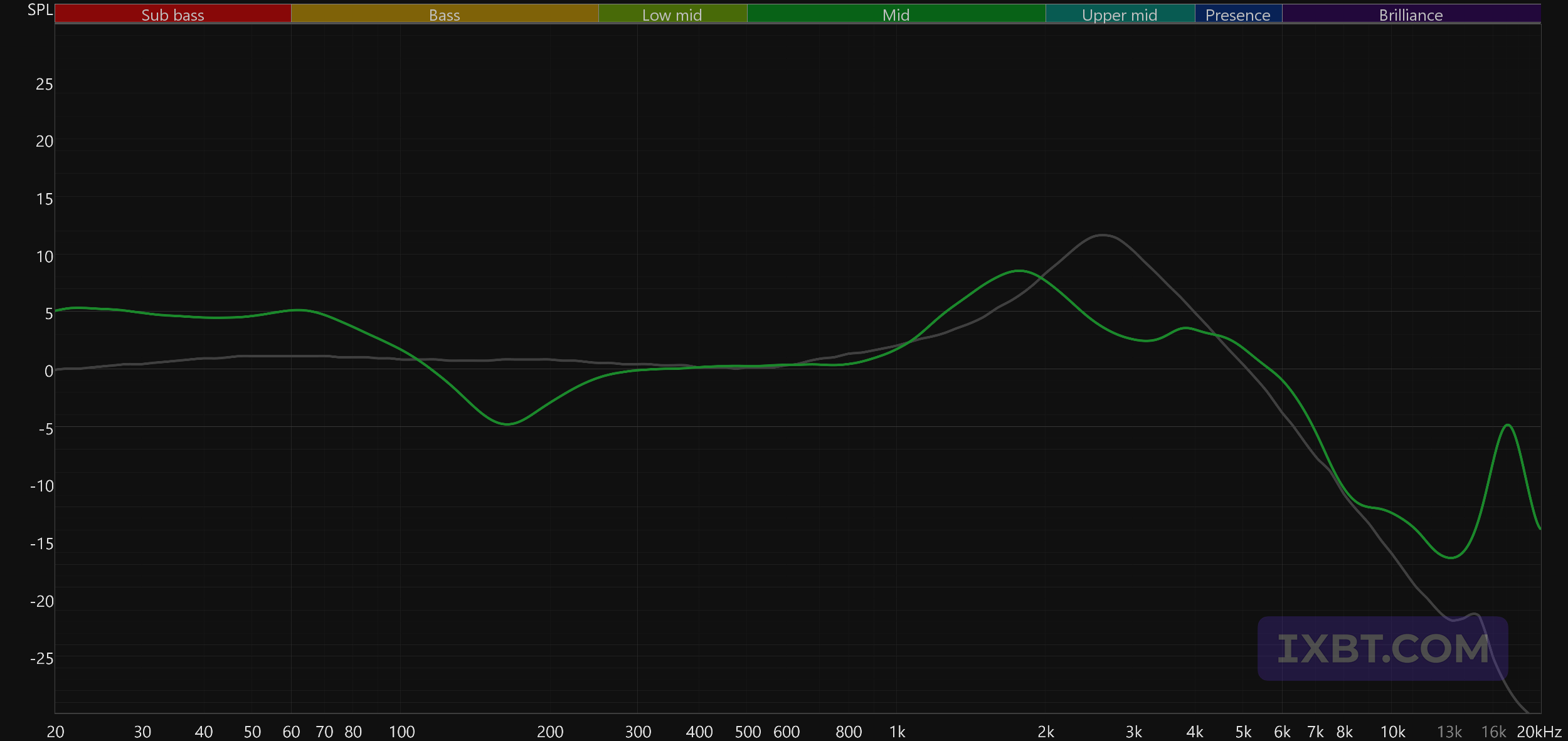 График выше показан на фоне кривой IDF (IEM diffuse field compensation), предоставленной производителем используемого стенда. Ее задача — помочь скомпенсировать резонансные явления в имитированном слуховом канале и особенности оборудования, создав «звуковой профиль», максимально корректно иллюстрирующий то, как звучание наушников воспринимается слушателем. Ее можно рассматривать как адаптированный под конкретное устройство аналог так называемой «кривой Хармана», созданной командой Harman International под руководством доктора Шона Олива. Скомпенсируем полученный график АЧХ в соответствии с кривой IDF. В таком виде он наиболее полно иллюстрирует субъективные впечатления от прослушивания.