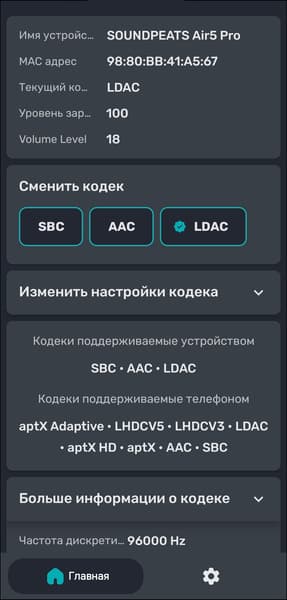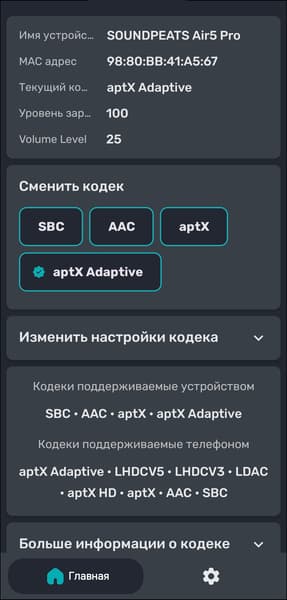 Также через приложение можно активировать различные кодеки — одновременно они не работают. По умолчанию используется семейство aptX, если источник его не поддерживает, гарнитура переключается на базовые SBC или AAC. Приложение Bluetooth Codec Changer подтверждает поддержку aptX Adaptive. А при наличии Snapdragon Sound у источника активируется режим aptX Lossless — в этом можно убедиться через меню устройства. Если задействовать LDAC через приложение, акцент делается на нем — поддержка aptX отключается, базовые кодеки остаются на месте, но становится недоступен мультипойнт.