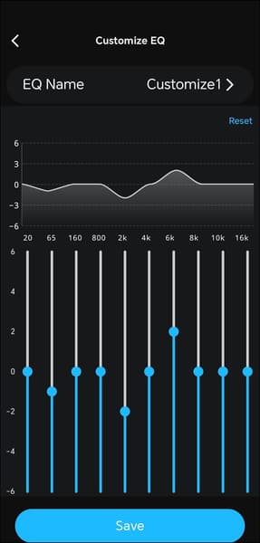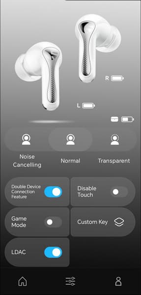 Приложение предлагает четыре встроенных профиля звучания и возможность создавать собственные с помощью полноценного 10-полосного эквалайзера. Немного жаль, что кривую компенсации, полученную в ходе проверки слуха, нельзя накладывать поверх пользовательских настроек — так было бы удобнее, подобная реализация встречается в более продвинутых моделях. Но это мы уже немного придираемся, сам факт наличия полноценного 10-полосного эквалайзера уже является достаточным поводом для того, чтобы похвалить Soundpeats Air5 Pro за обширные по меркам их сегмента возможности настройки звука.