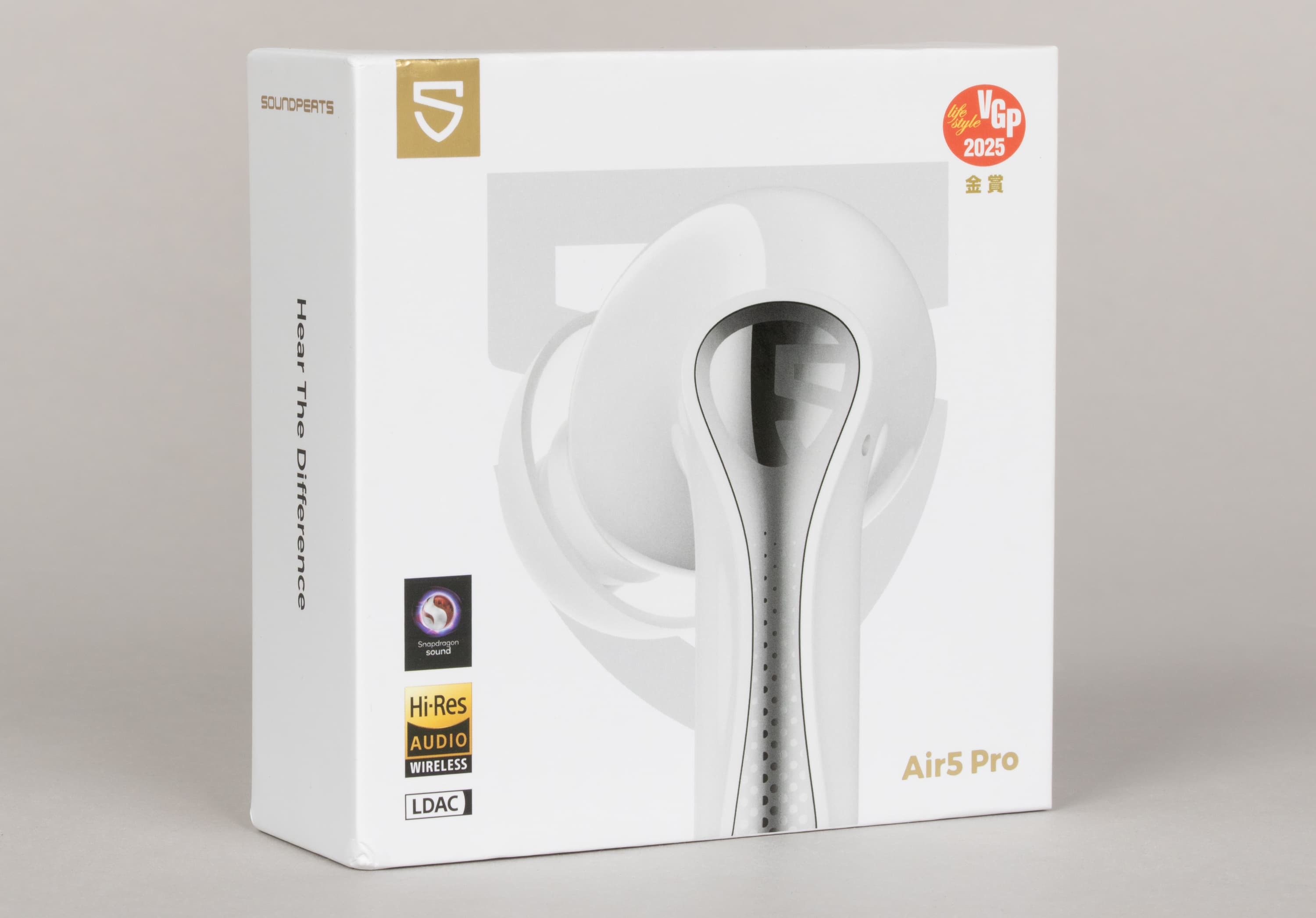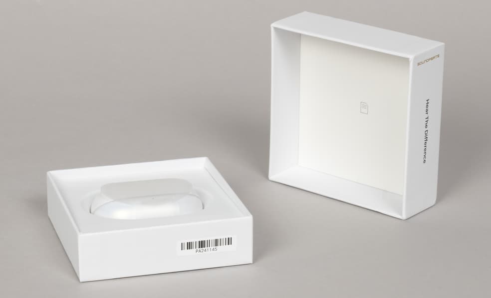 Soundpeats Air5 Pro поставляется в коробке из плотного белого картона со съемной крышкой. На нее нанесены изображение устройства, краткая информация об устройстве, а также логотипы систем сертификации и используемых технологий, включая упомянутую во введении Snapdragon Sound.