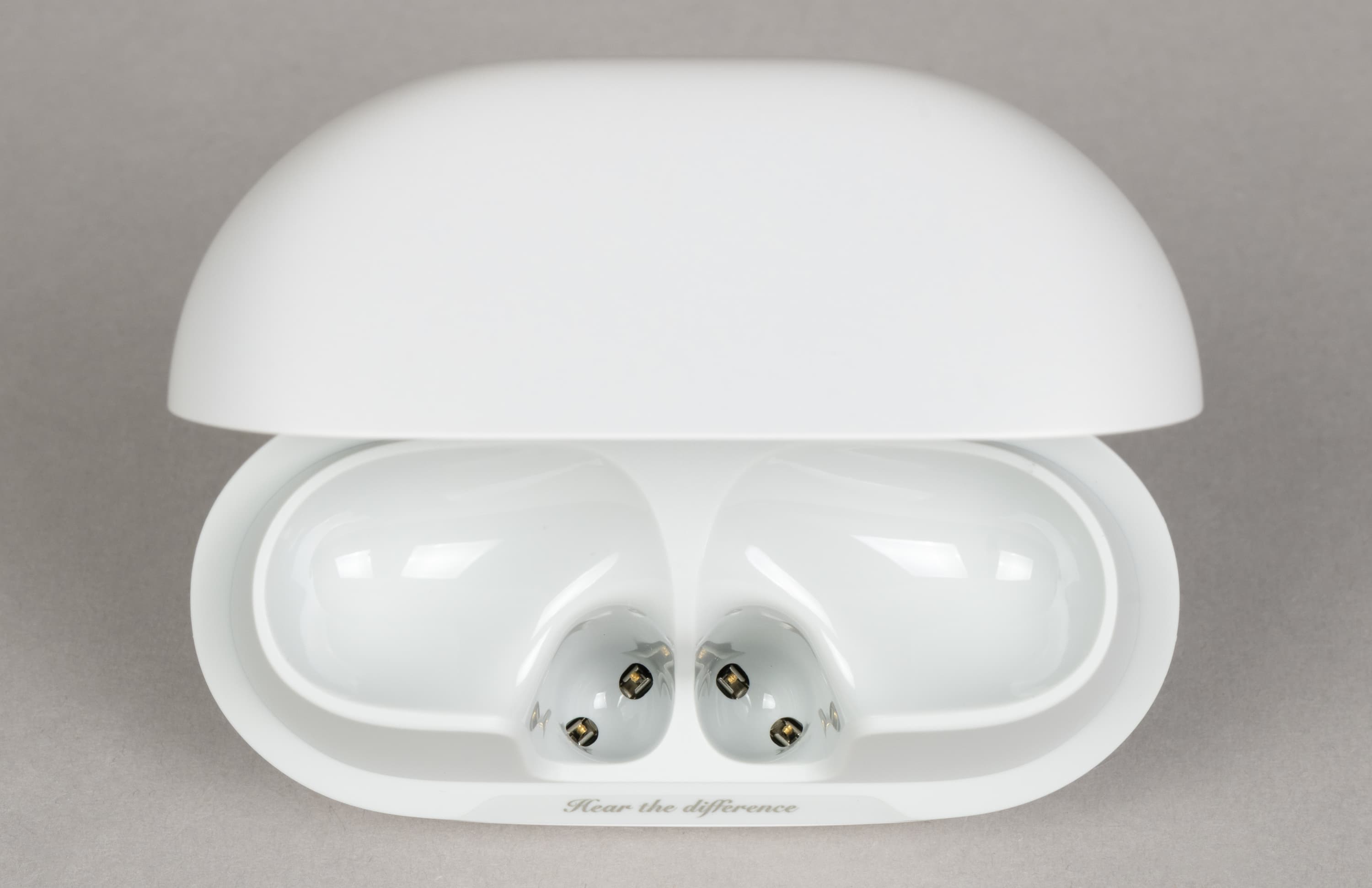 В районе небольшой выемки, облегчающей открытие крышки, размещена надпись «Hear the difference» — «услышь разницу». Фраза запредельно банальная, но с точки зрения позиционирования вполне логичная: гарнитура как раз и привлекла наше внимание как способ услышать разницу между кодеками. Правда, займемся мы этим не сегодня, а в отдельном обзоре.
