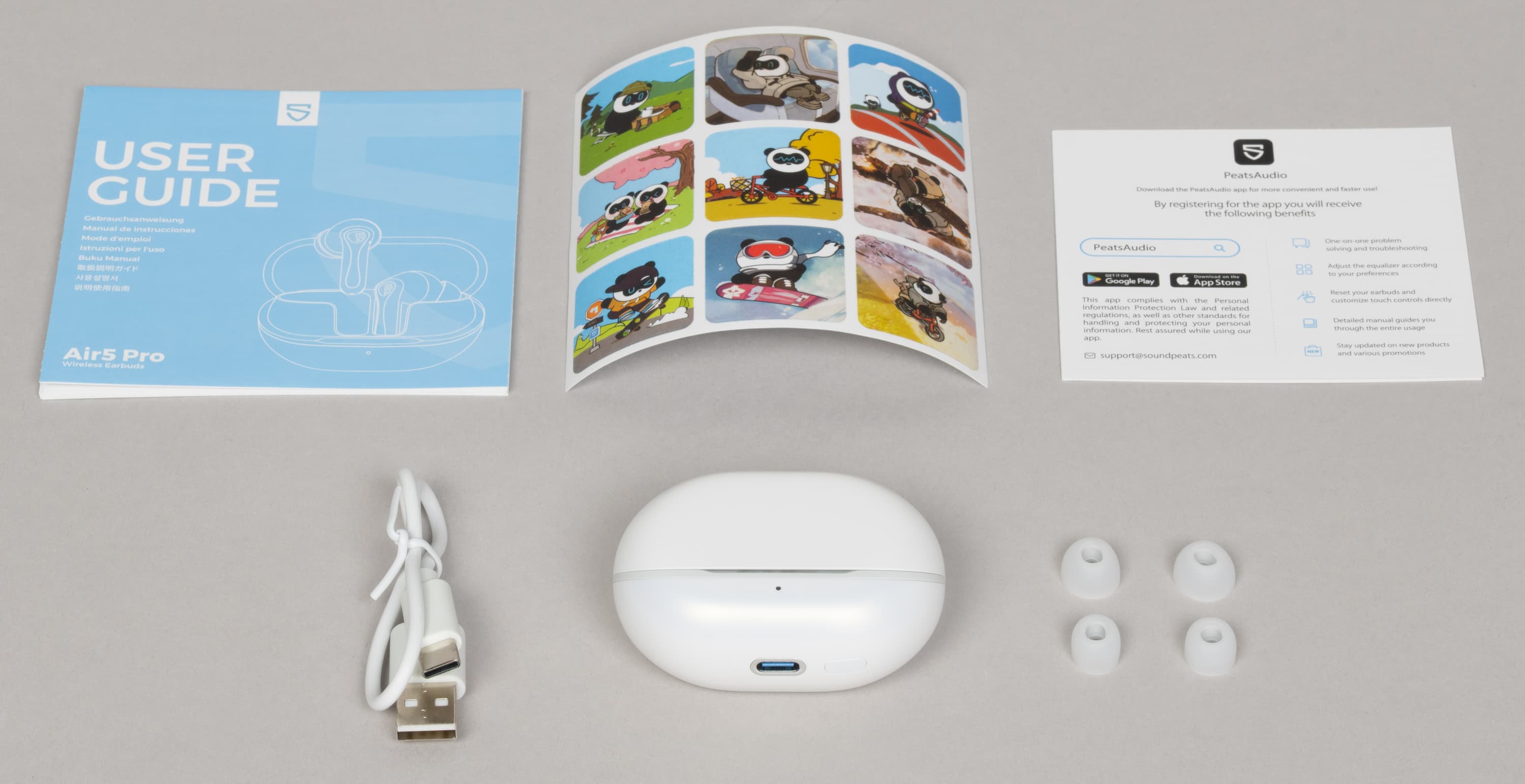 В комплект поставки, помимо самой гарнитуры, входят кабель USB-A — USB-C длиной 25 см, инструкция, фирменные наклейки и комплект сменных насадок.