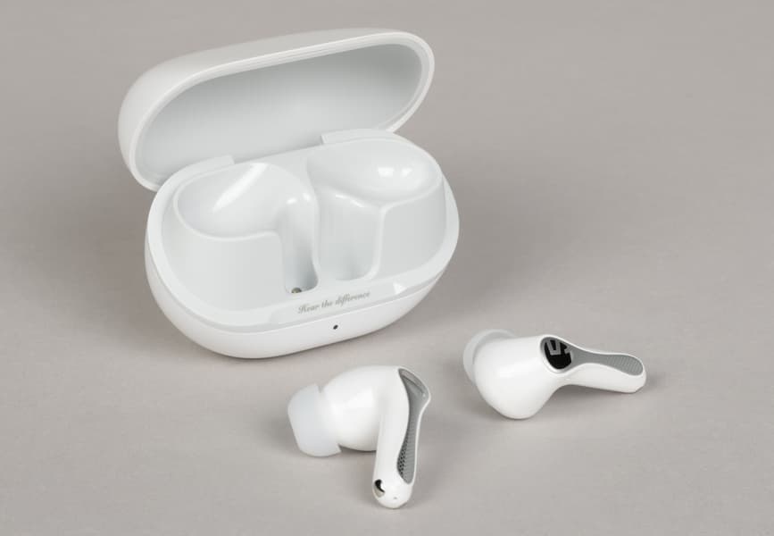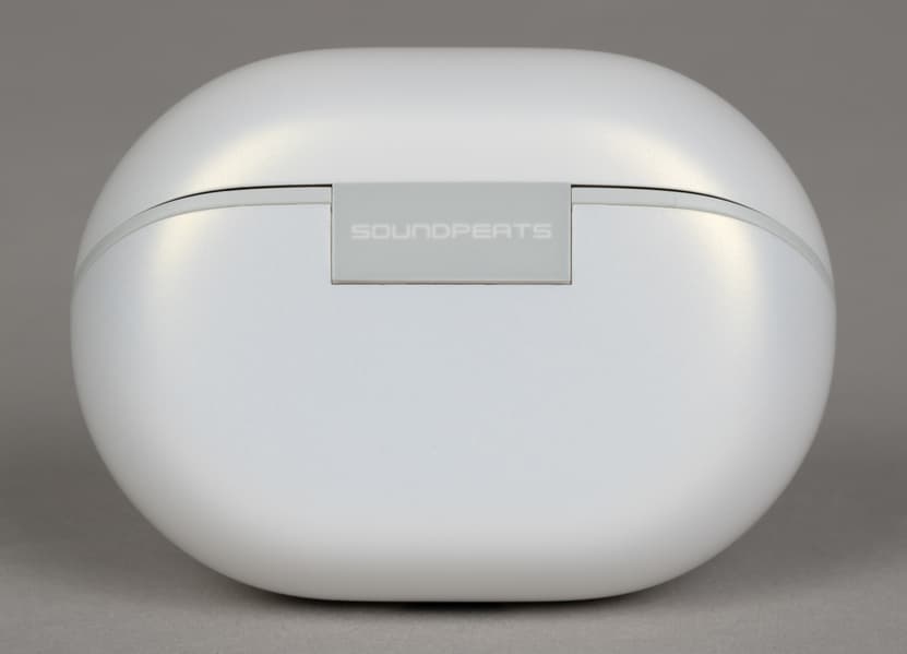 Soundpeats Air5 Pro предлагаются в двух классических цветах — черном и белом; у нас на тесте была белая версия. Кейс у модели довольно необычный, хотя подобный формат в последнее время встречается все чаще: откидная крышка открывает большую часть передней панели, а сами наушники установлены внутри в отдельных вертикальных слотах по центру корпуса. Нечто похожее мы недавно видели у Ugreen HiTune H6 Pro.