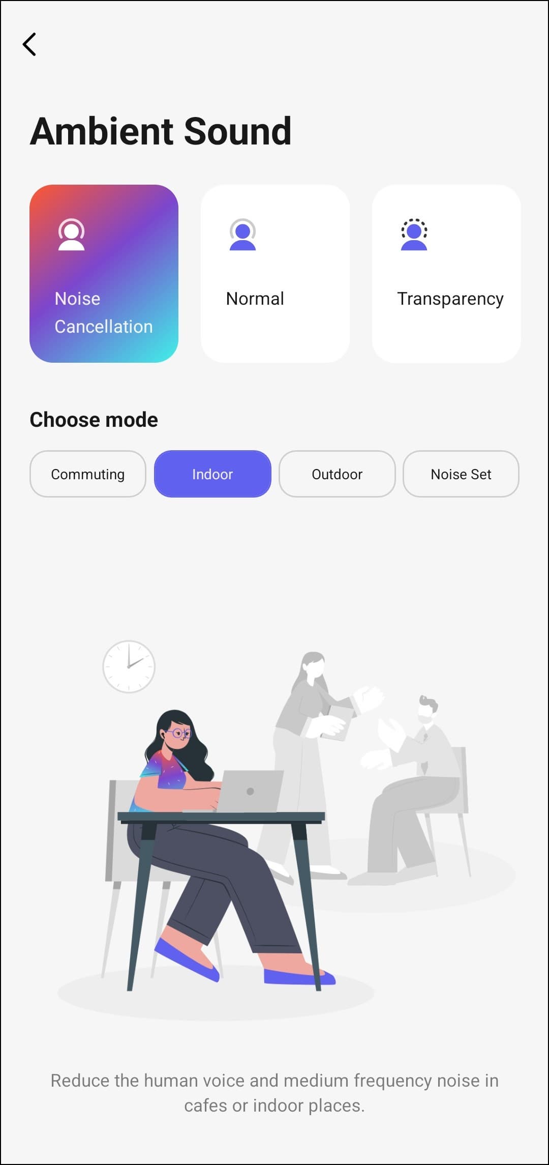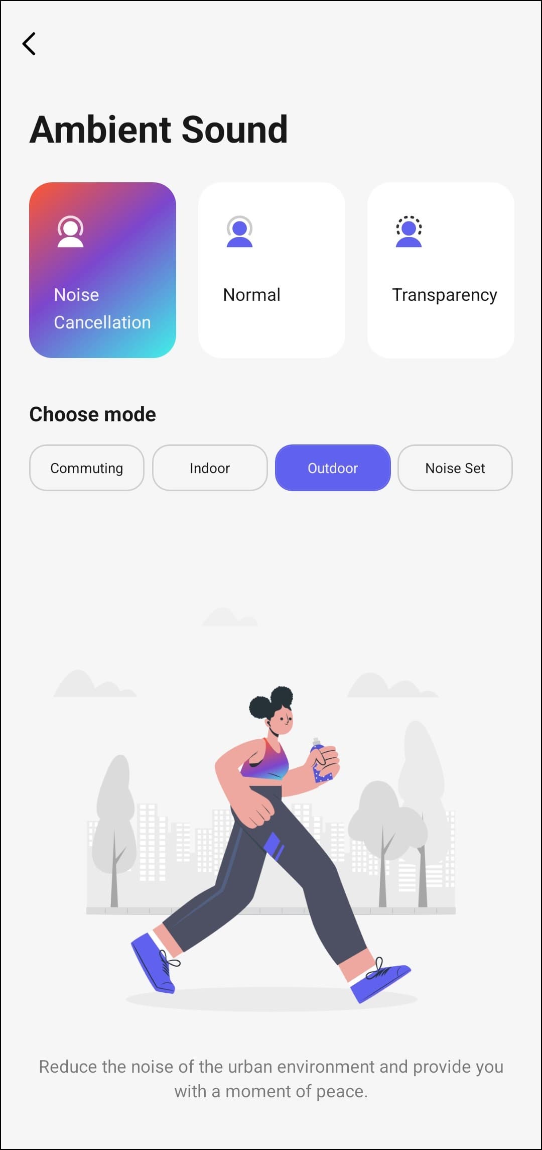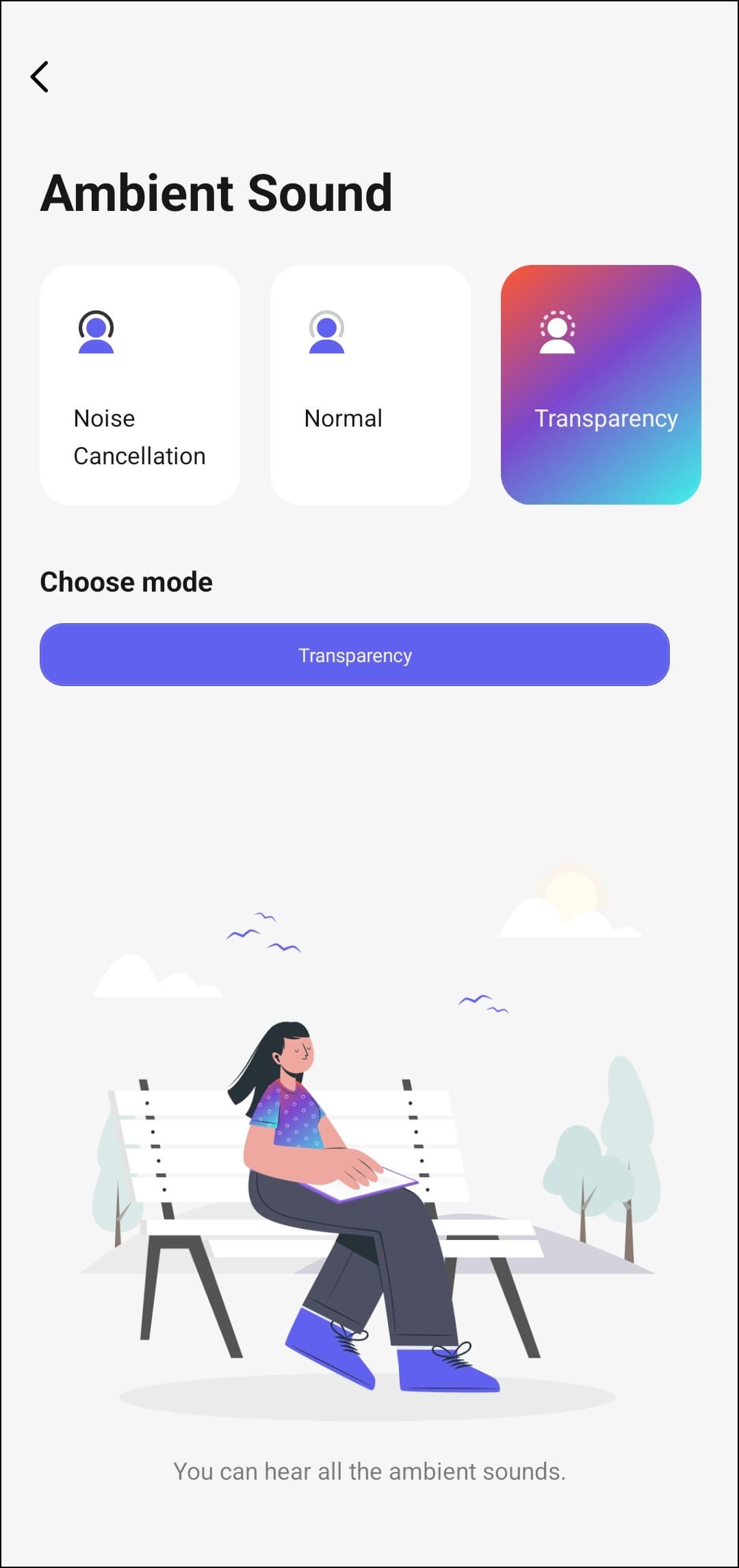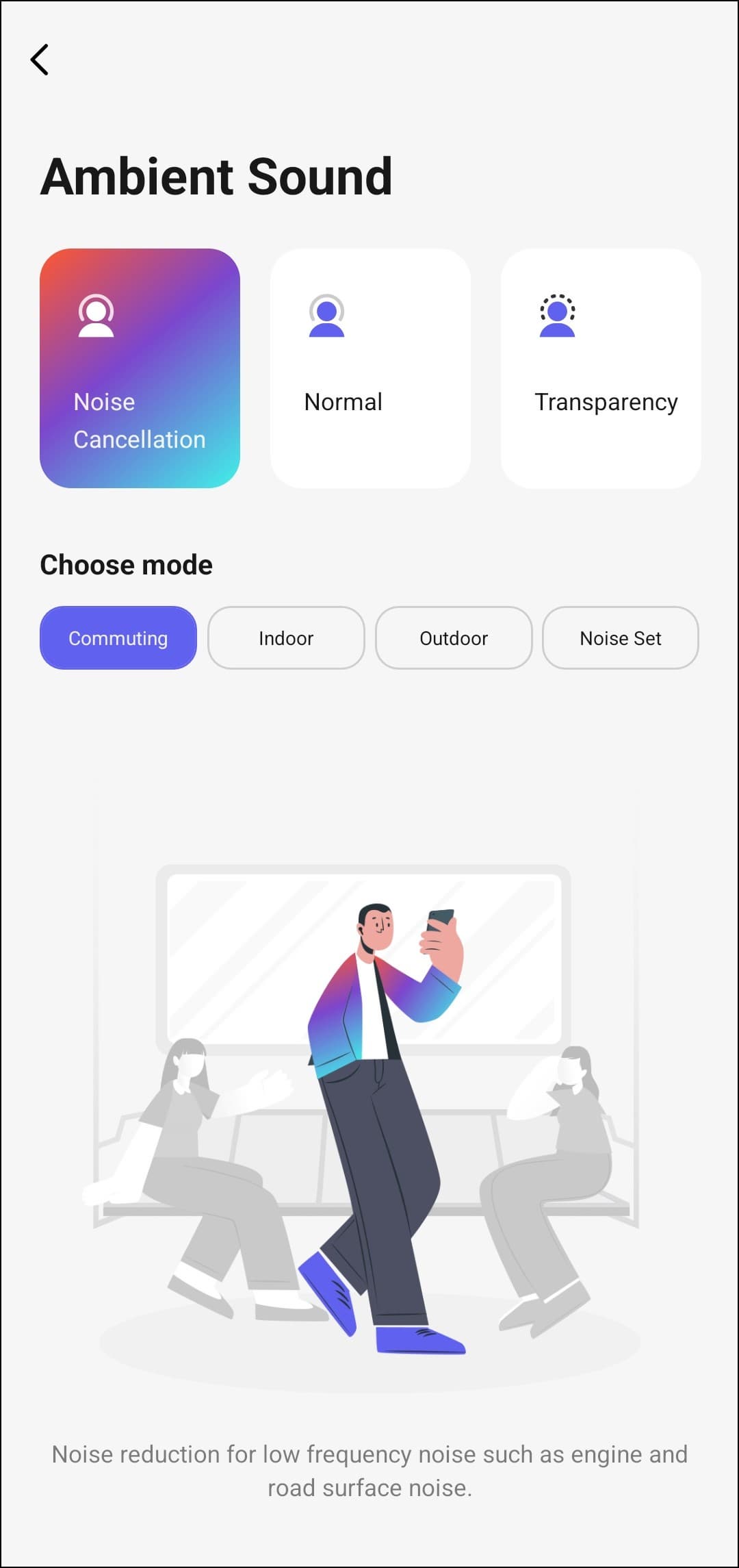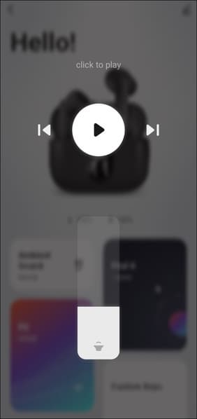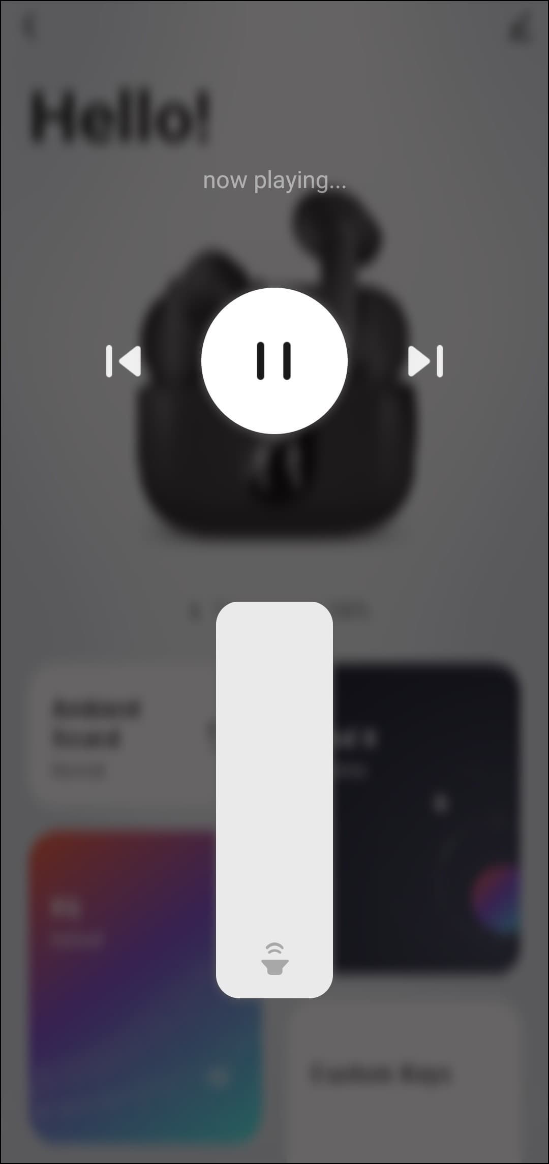 Кнопка воспроизведения, расположенная поверх изображения наушников, здесь не для красоты — она действительно работает. По тапу открывается модуль управления воспроизведением: можно поставить музыку на паузу, переключать треки и изменять громкость. В нижней части экрана находятся несколько кнопок. Первая из них ведет в меню настройки активного шумоподавления и режима звуковой прозрачности, в котором микрофоны гарнитуры транслируют внешние звуки в динамики.