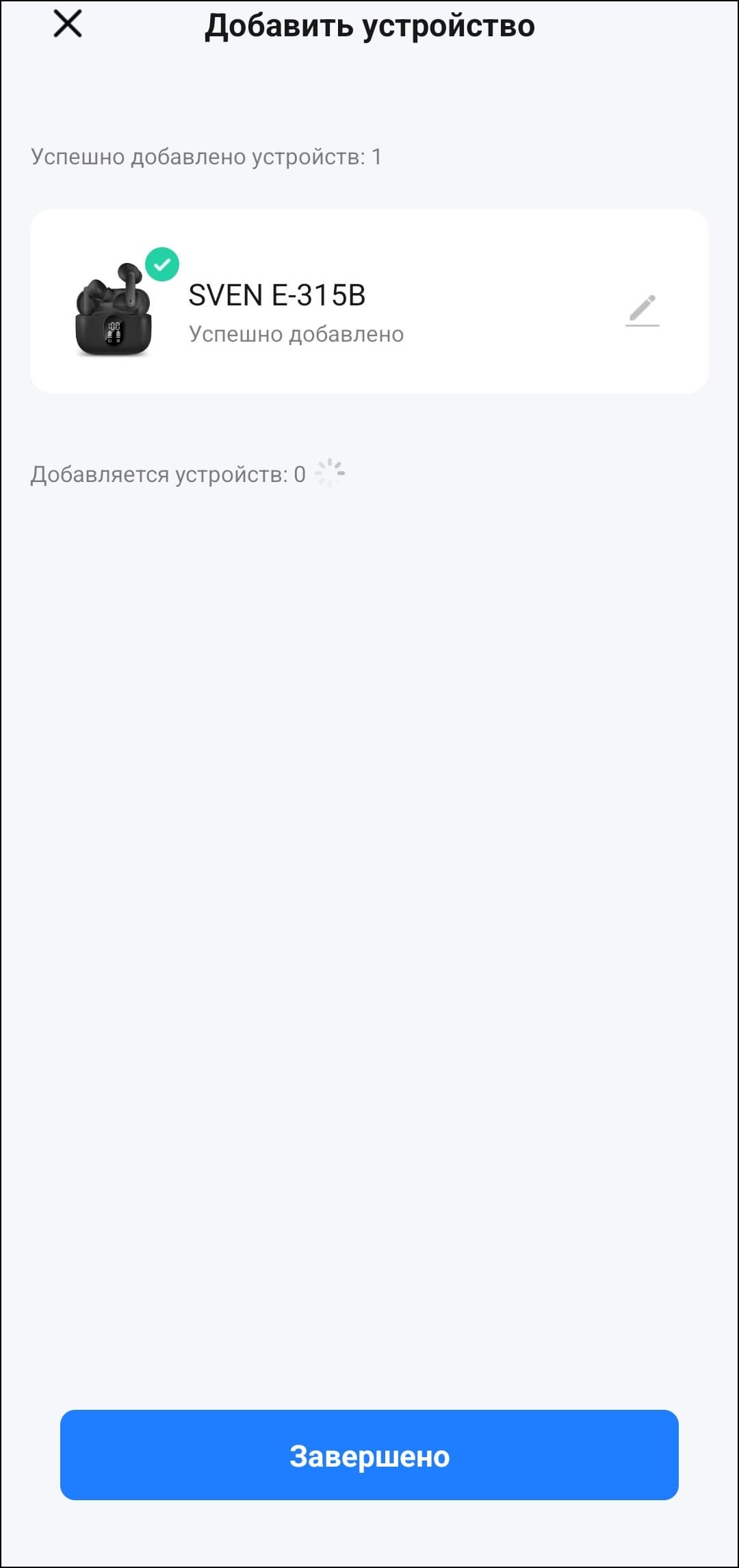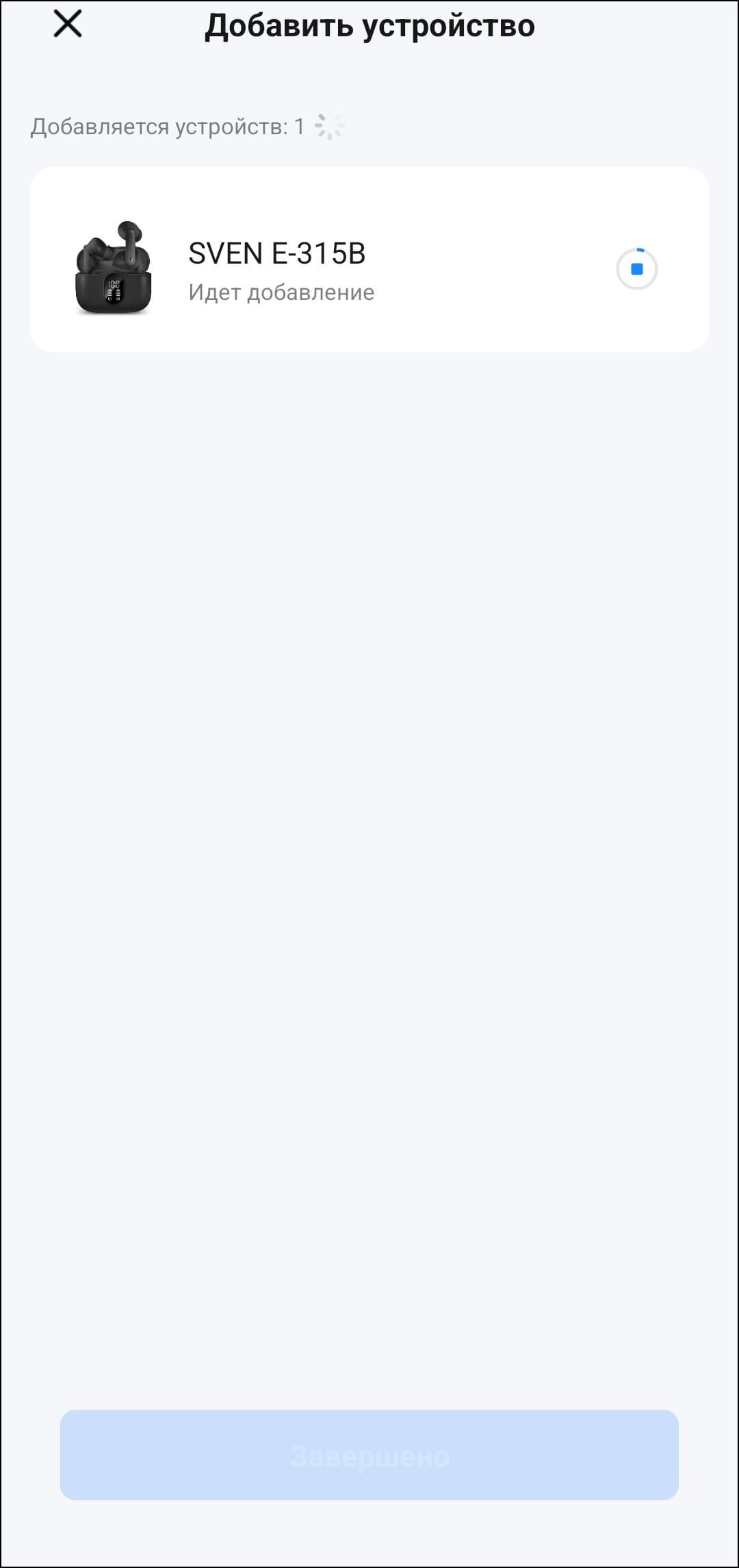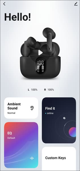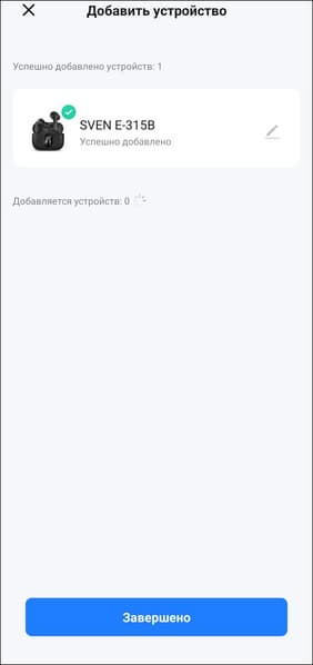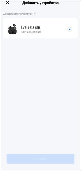 После добавления заранее сопряженного устройства в приложение попадаем на его страницу. В центре — крупное изображение наушников, ниже расположены индикаторы заряда для каждого из них по отдельности.