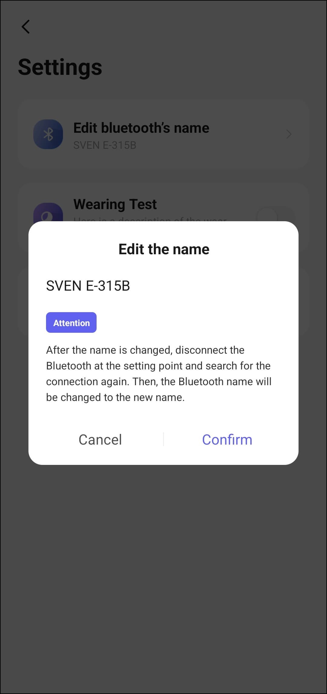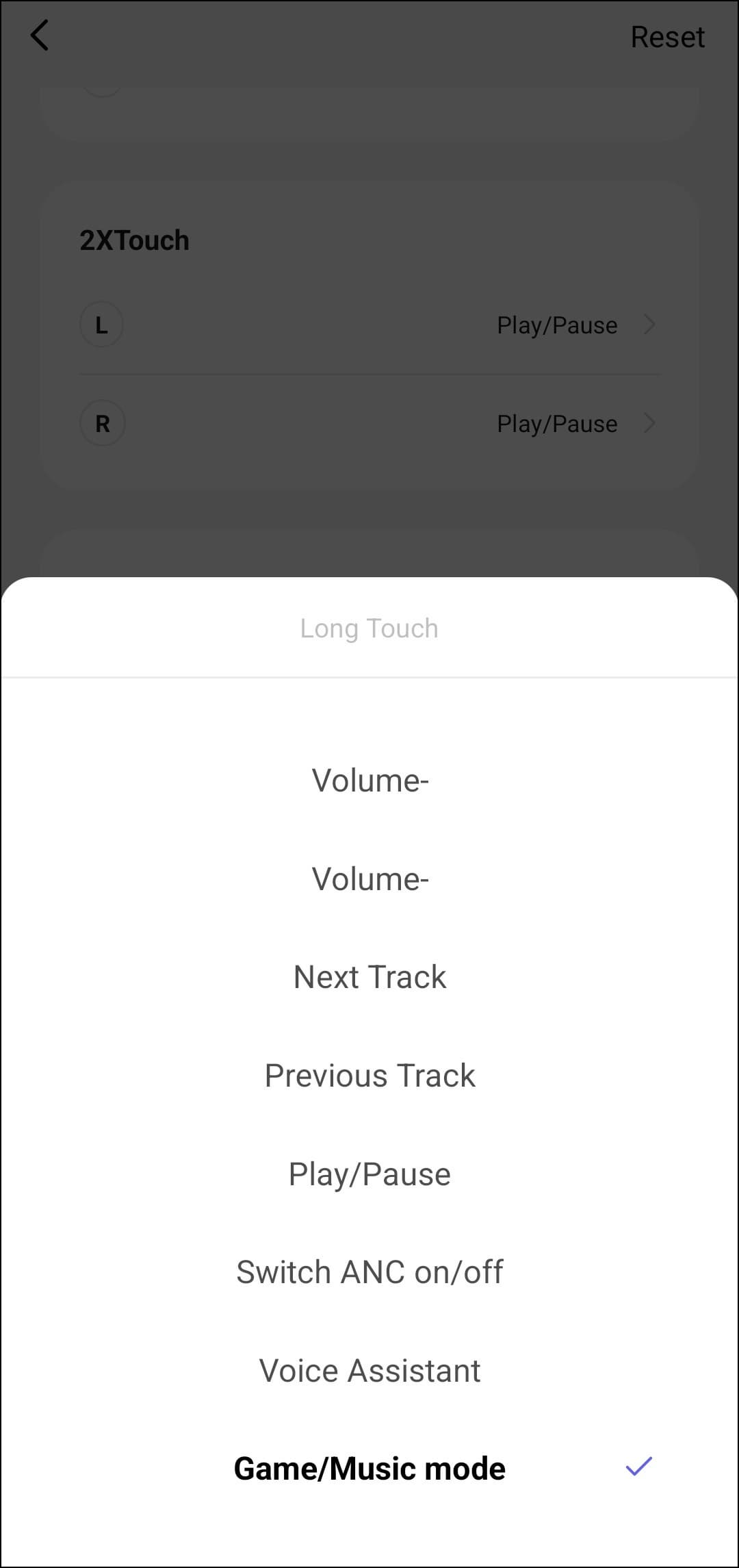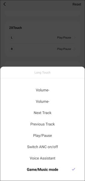 На странице настроек можно изменить имя устройства или вернуть его к заводским параметрам. Но самое интересное здесь — функция Wearing Test. Правда, с названиями вышла небольшая путаница: на деле этот переключатель активирует игровой режим.