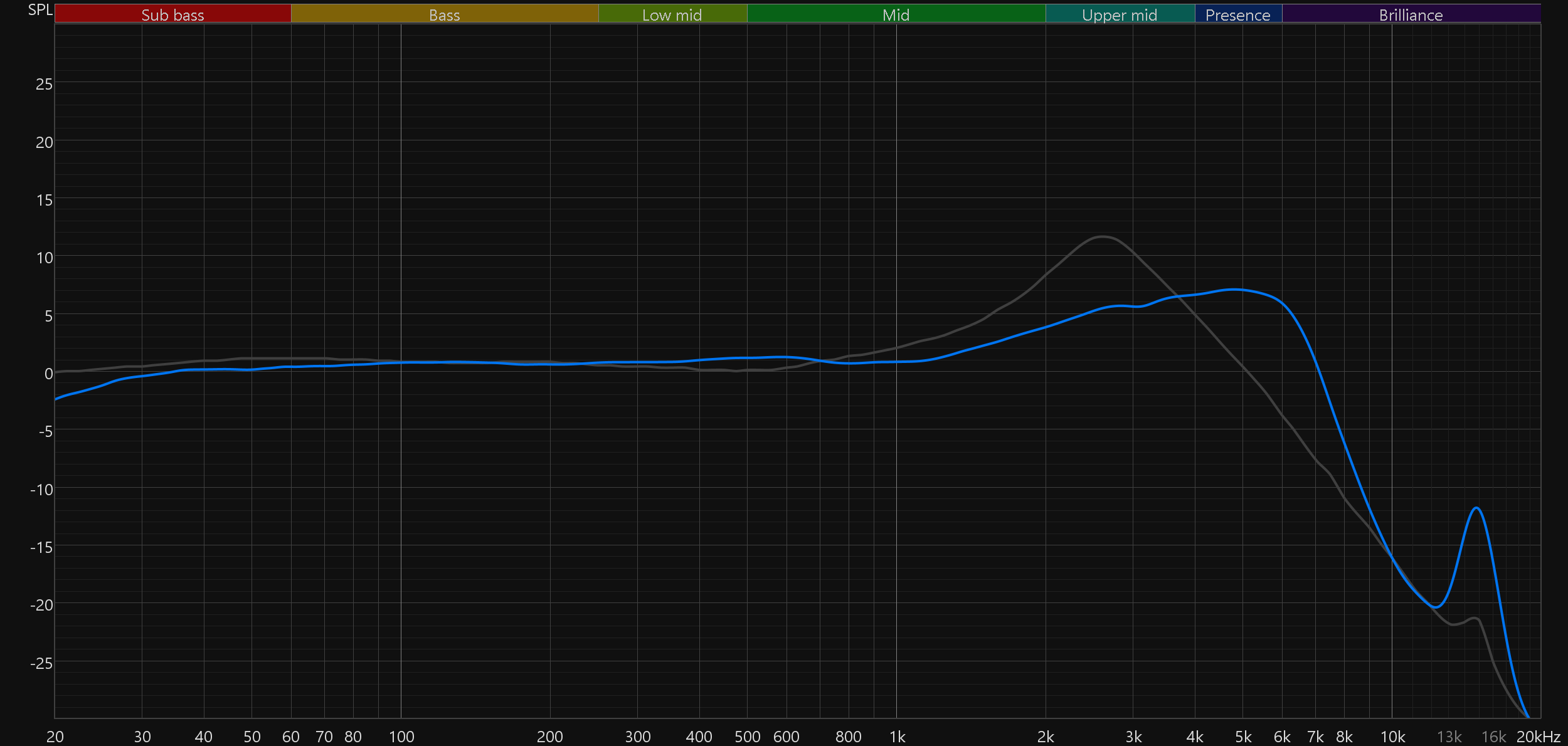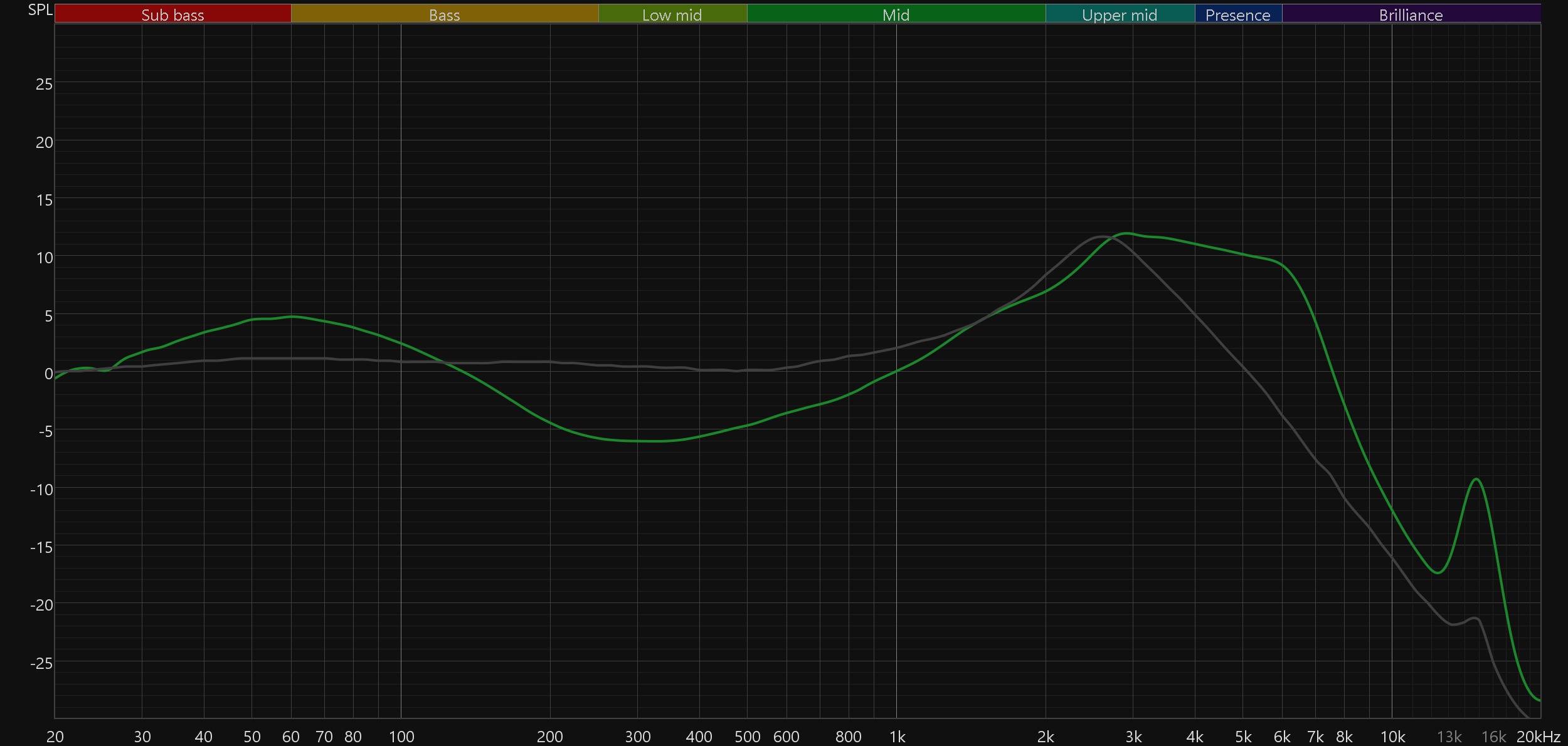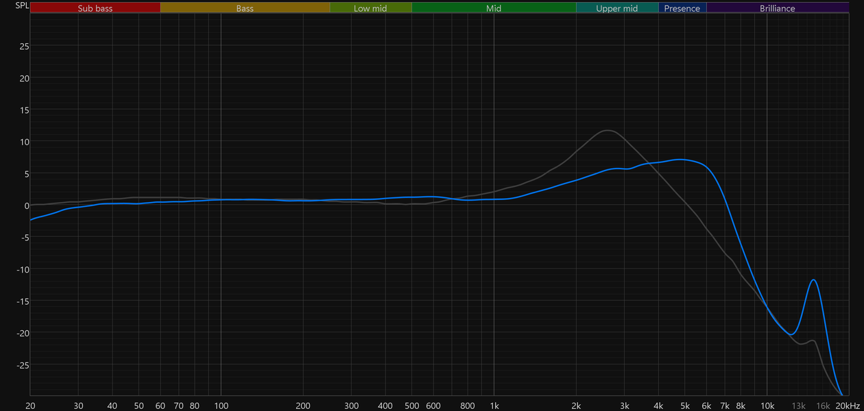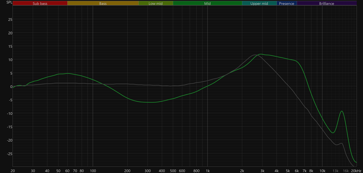 График АЧХ показан на фоне кривой IDF (IEM diffuse field compensation), предоставленной производителем используемого стенда. Ее задача — помочь скомпенсировать резонансные явления в имитированном слуховом канале и особенности оборудования, создав «звуковой профиль», максимально корректно иллюстрирующий то, как звучание наушников воспринимается слушателем. Ее можно рассматривать как адаптированный под конкретное устройство аналог так называемой кривой Хармана, созданной командой Harman International под руководством доктора Шона Олива. Скомпенсируем полученный график АЧХ в соответствии с кривой IDF — в таком виде он наиболее полно иллюстрирует субъективные впечатления от прослушивания.