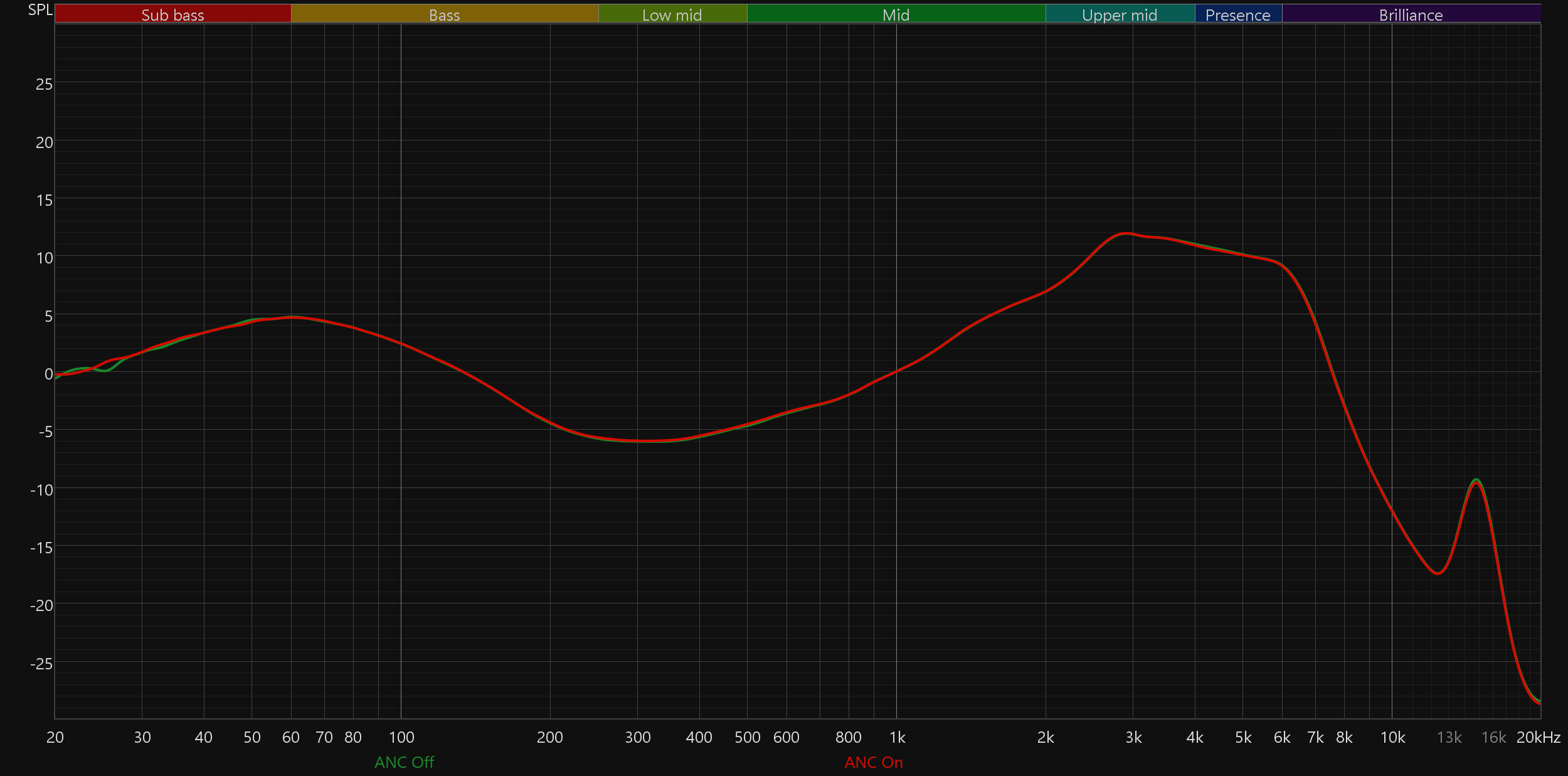 Сразу сравним графики при включенной и выключенной системе активного шумоподавления. Обычно «шумодавы» заметно влияют на подачу НЧ-диапазона, делая бас менее выраженным. Однако в данном случае этот эффект практически не проявляется — удивительно, но факт.