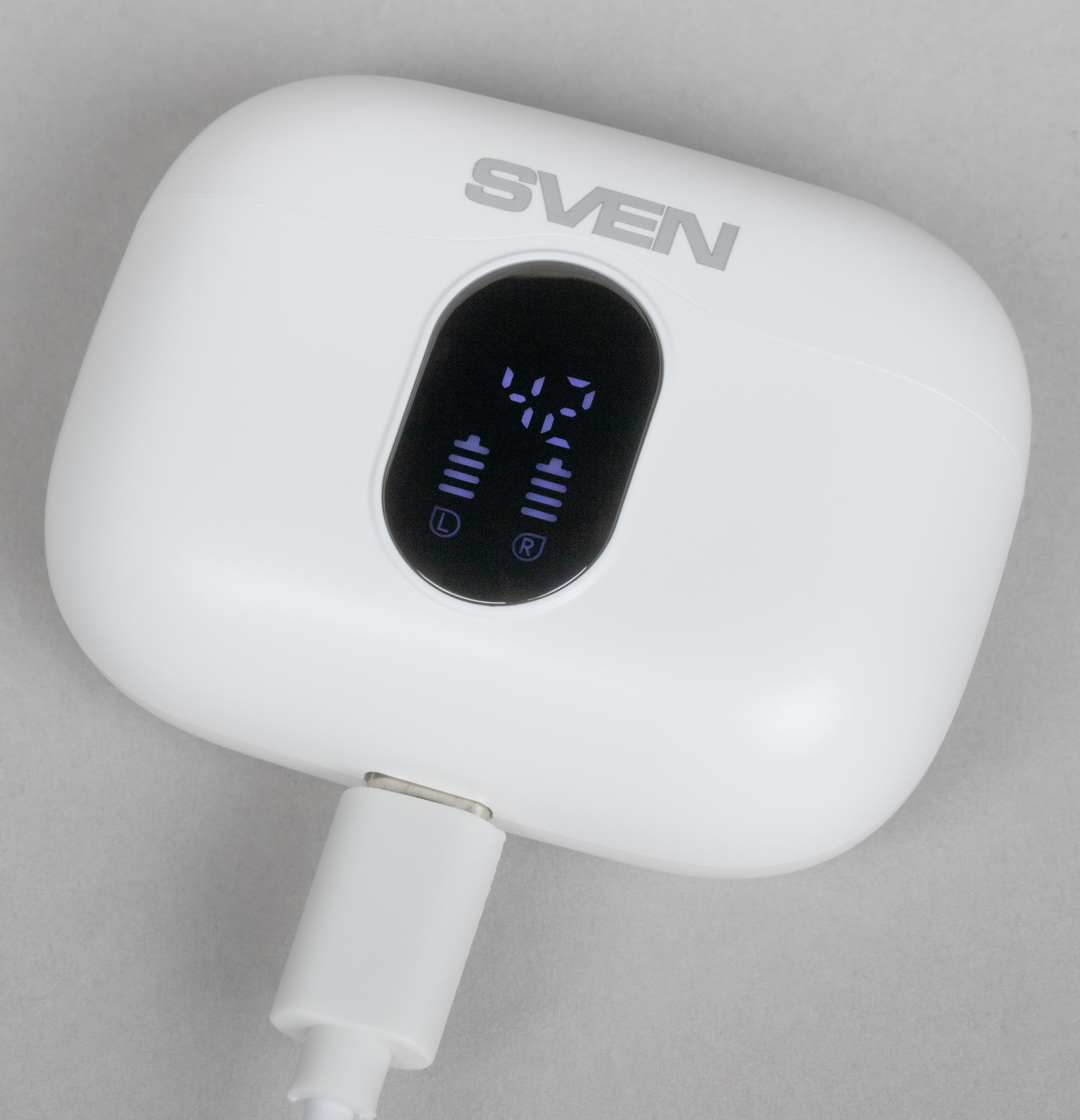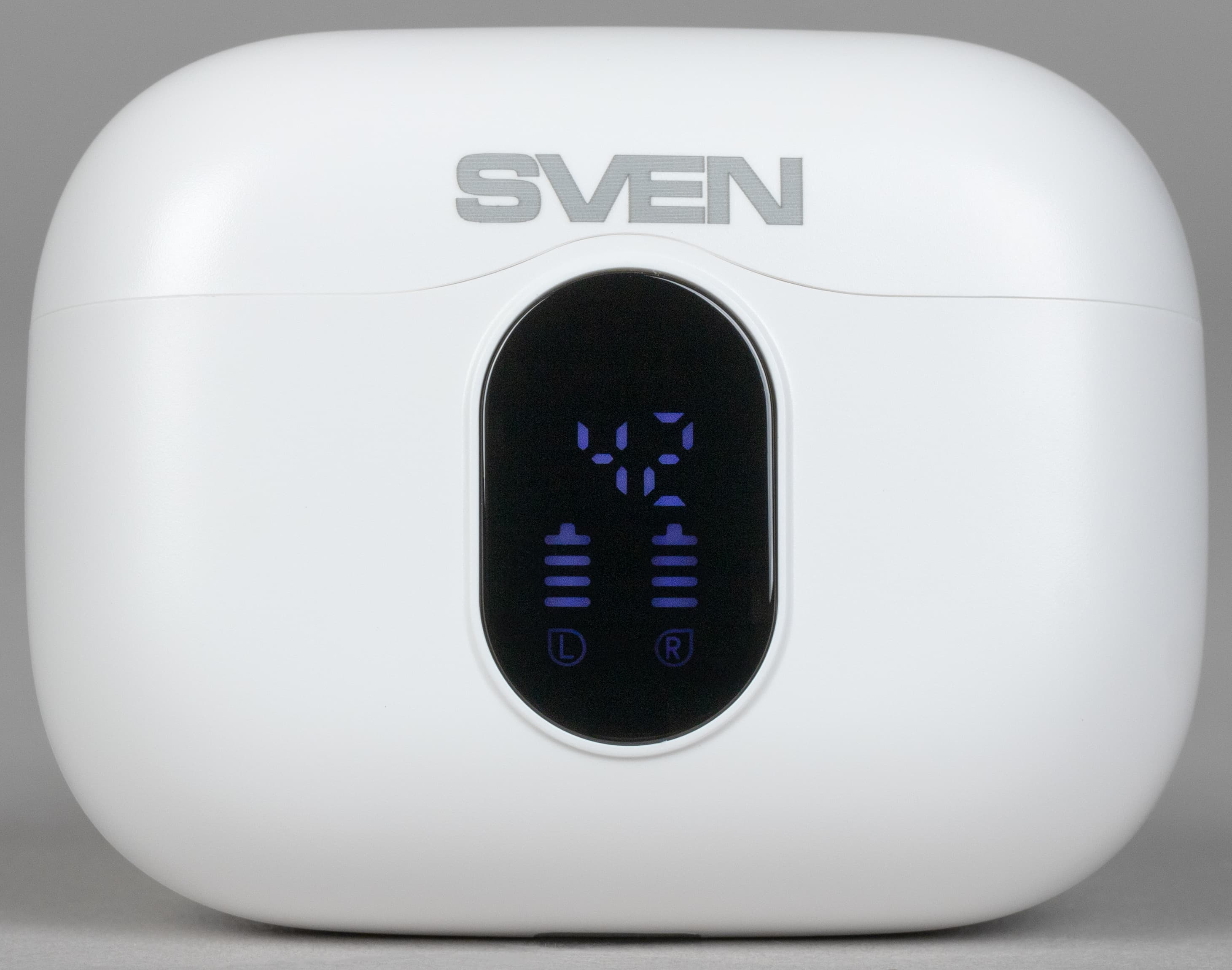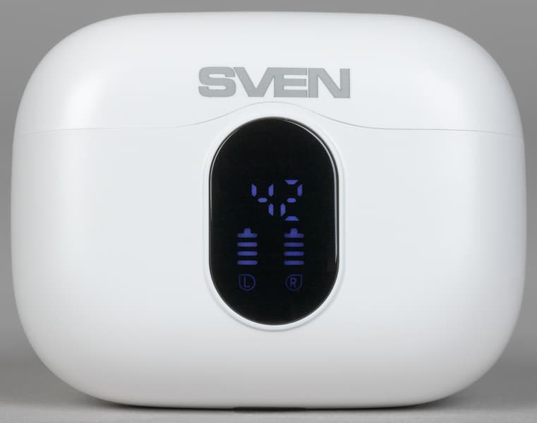 В верхней части экрана расположены два семисегментных индикатора, отображающих заряд кейса в процентах. Ниже — вертикальные шкалы, показывающие уровень заряда каждого наушника отдельно. Такое решение заметно удобнее и нагляднее, чем привычные многоцветные светодиоды, да и визуально выглядит куда приятнее.