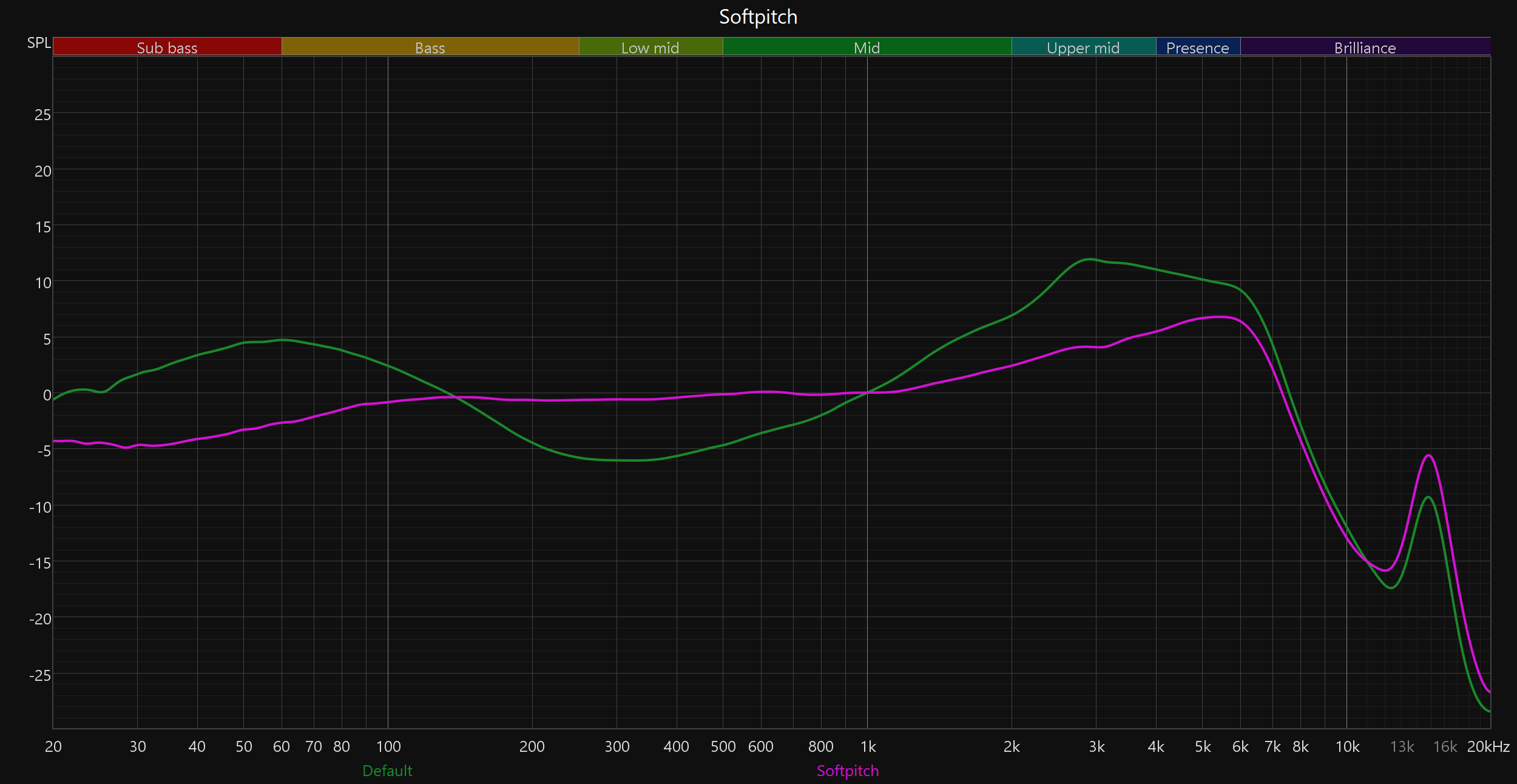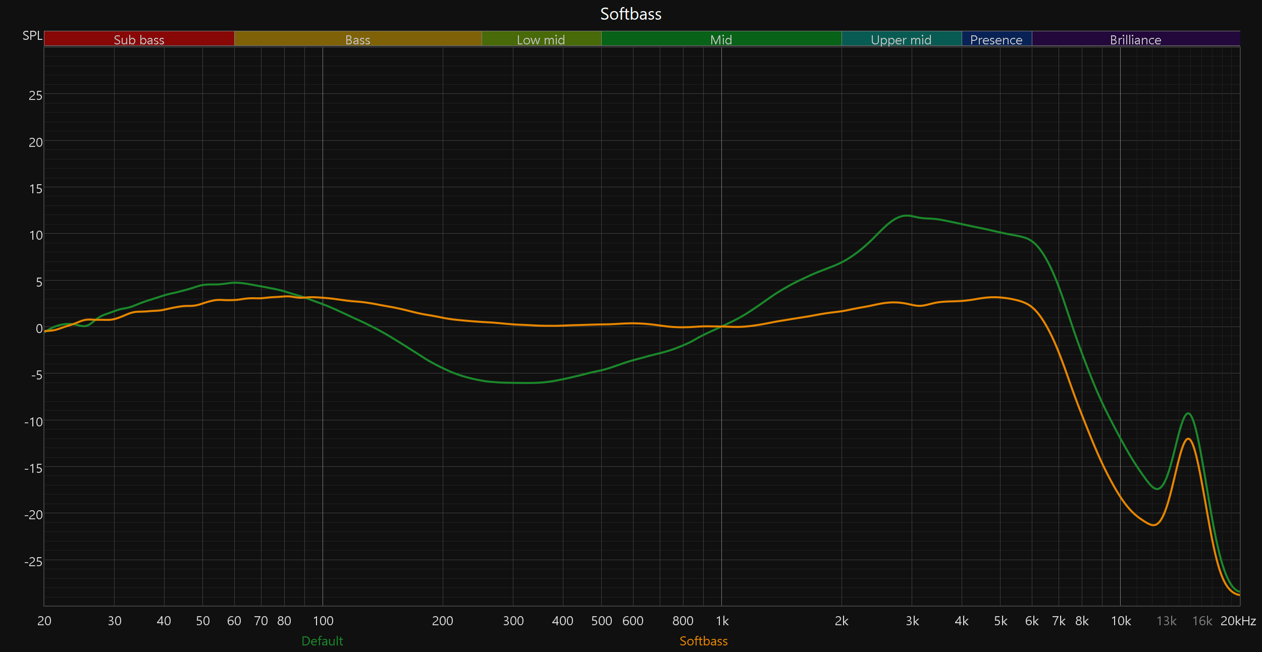 За воспроизведение звука в Sven E-310B/E-315B отвечают сравнительно крупные 13-миллиметровые динамики, что обычно подразумевает ярко выраженный бас — и в данном случае это действительно так. НЧ-регистр тут ощутимый и акцентированный, однако нижняя середина и основной СЧ-диапазон звучат смазанно и теряют читаемость, что наглядно подтверждает график АЧХ. Такая тональная подача может органично вписаться в хип-хоп или электронную музыку, где важен акцент на удар и суббас, но в целом звучание остается весьма нишевым и далеким от универсального. Тем не менее, делать окончательные выводы рано — для начала стоит оценить, как наушники реагируют на эквалайзер.