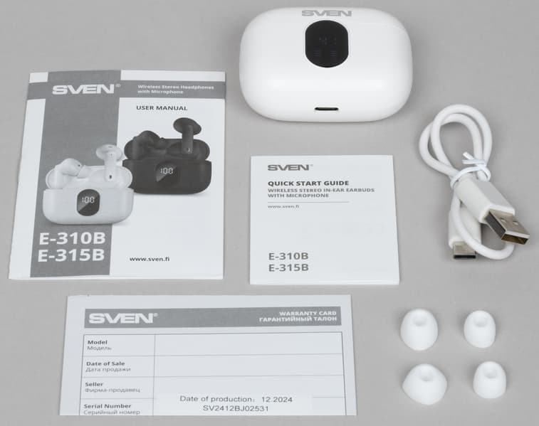 Sven E-310B/E-315B поставляются в коробках из картона средней плотности, оформленных в традиционной для бренда бело-синей гамме. Внутри кейс с наушниками надежно зафиксирован в ложементе, остальные элементы комплектации упакованы отдельно — за сохранность устройства при транспортировке можно не переживать.