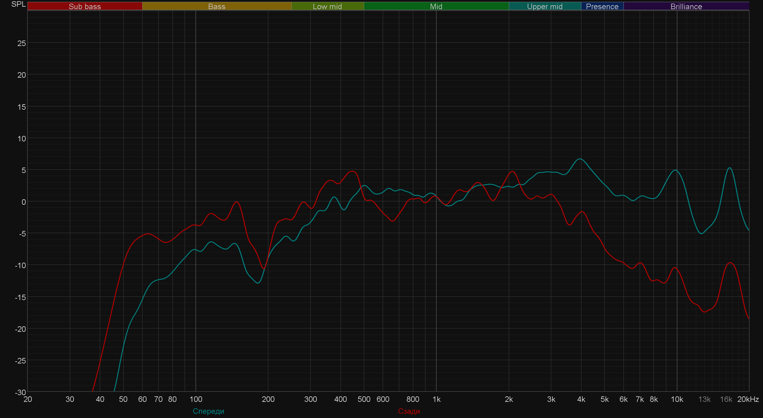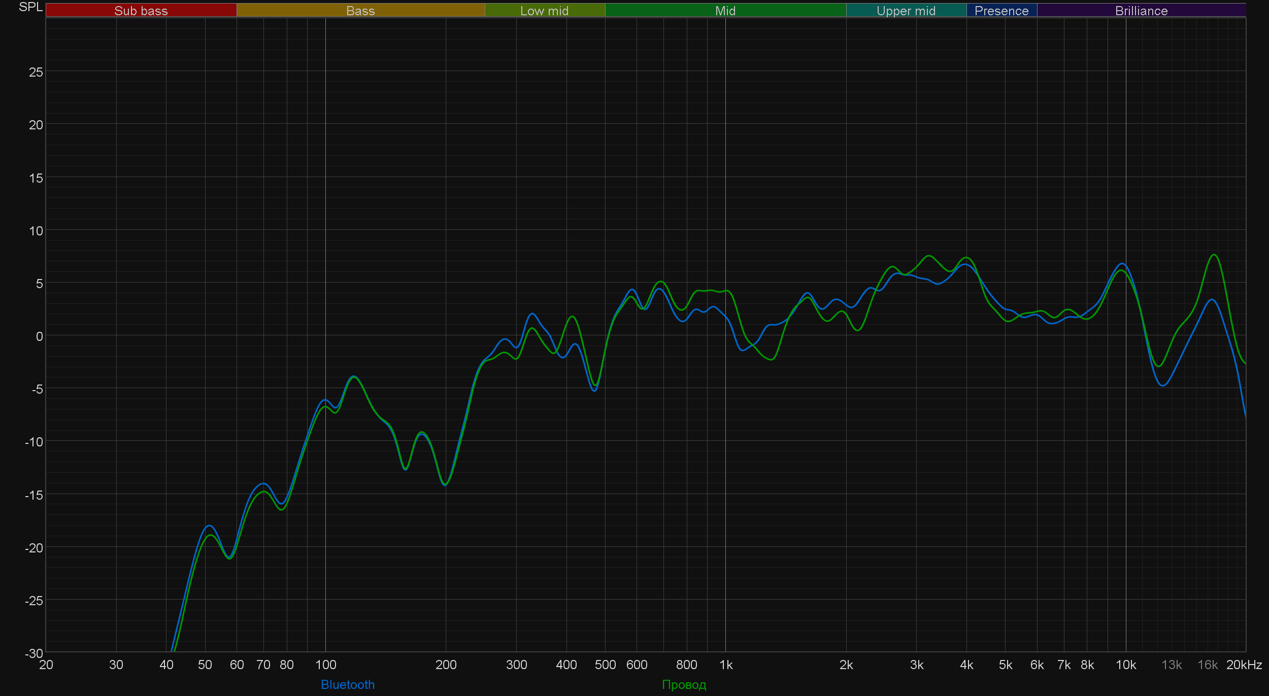 Ну и, наконец, нельзя не сравнить звучание при проводном и беспроводном подключении. Здесь графики совпали почти идеально, да и во время прослушивания разница была практически неуловима. Так что при выборе способа соединения с источником звука имеет смысл руководствоваться исключительно собственным комфортом.