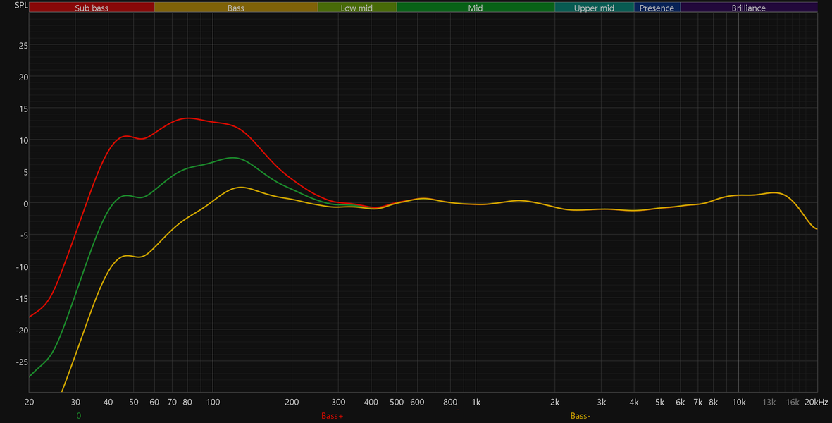 Что касается акцентов на краях диапазона, от них довольно легко избавиться с помощью темброблока. Переместимся в условную точку прослушивания и посмотрим на графики, полученные при переводе регуляторов эквалайзера в крайние положения. Для наглядности графики представлены с максимальной степенью сглаживания — в данном случае нас интересуют не тонкие особенности звучания самой акустики, а качество работы эквалайзера.
