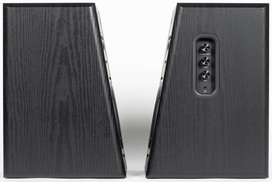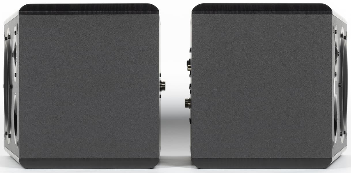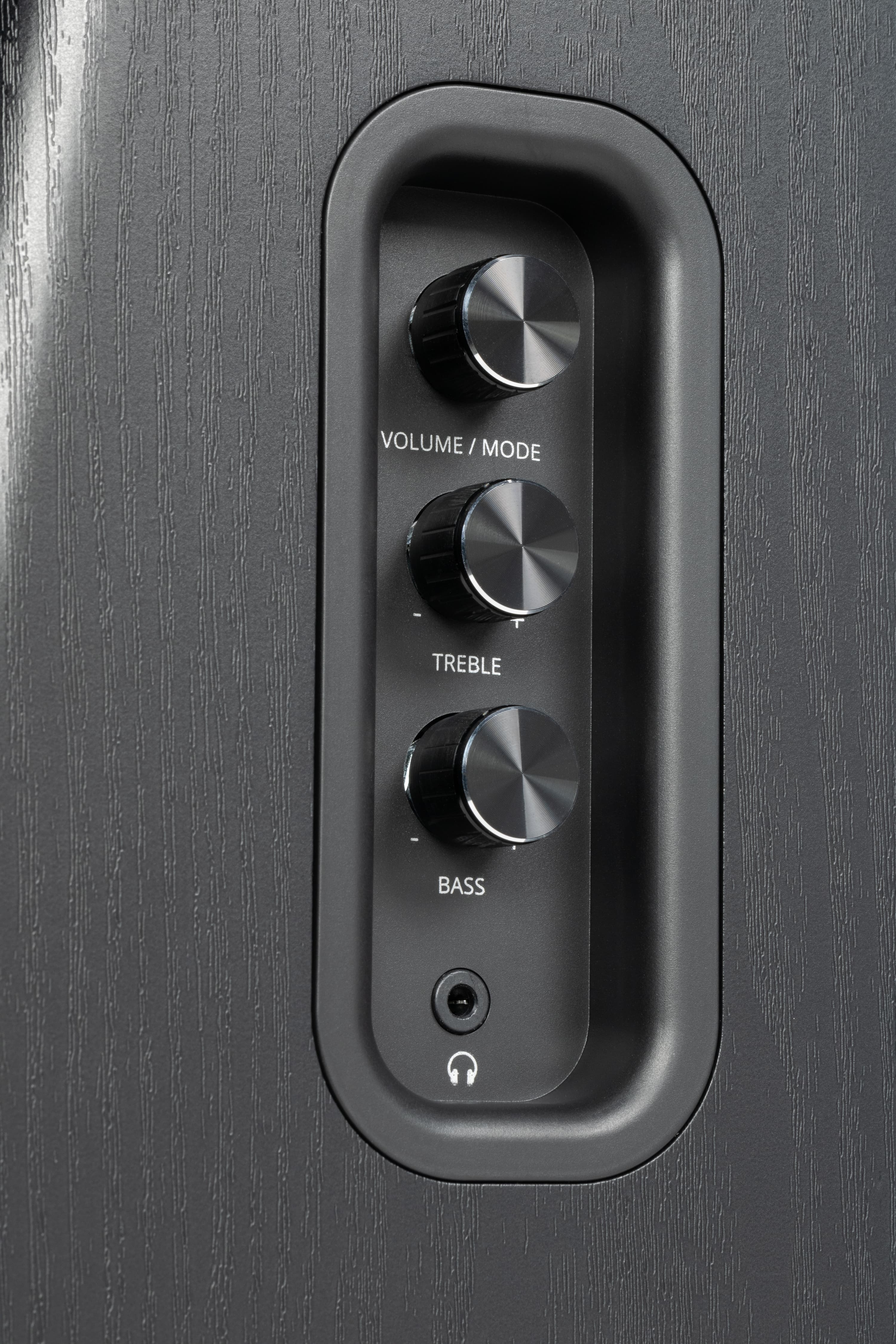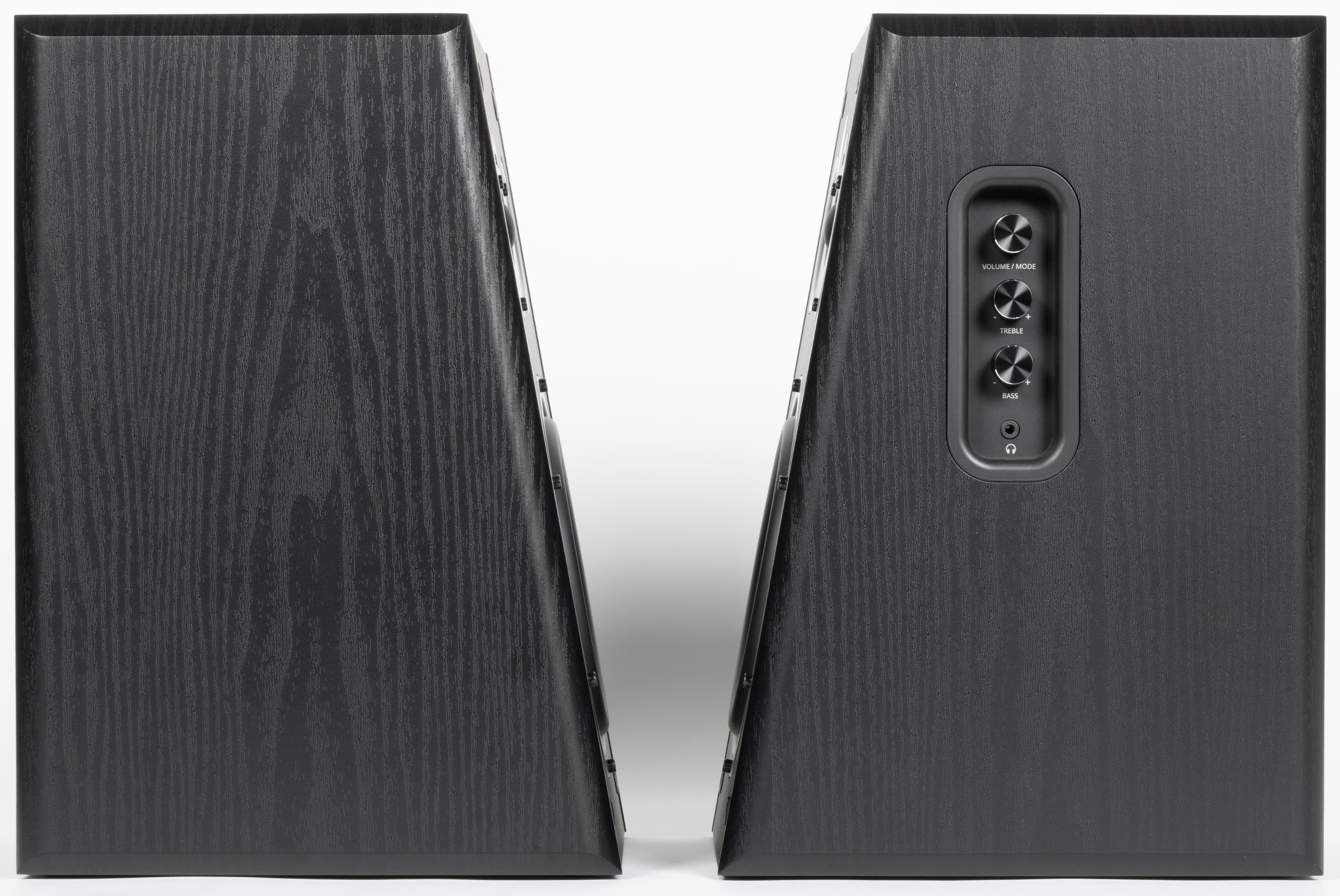 На правой боковой панели активной колонки находятся ручки управления громкостью и работой темброблока. Все стенки акустики аккуратно обтянуты виниловой пленкой, которая устойчива к появлению пятен от прикосновений, а при необходимости легко очищается.