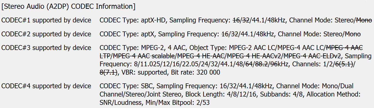 После активации Bluetooth-подключения колонка некоторое время пытается отыскать «знакомые» устройства, если не получается — запускает режим сопряжения. Далее остается найти ее в соответствующем меню используемого гаджета и подключить. Мультипойнт Sven MC-50 не поддерживает, с помощью утилиты Bluetooth Tweaker был получен полный список поддерживаемых кодеков и их режимов.
