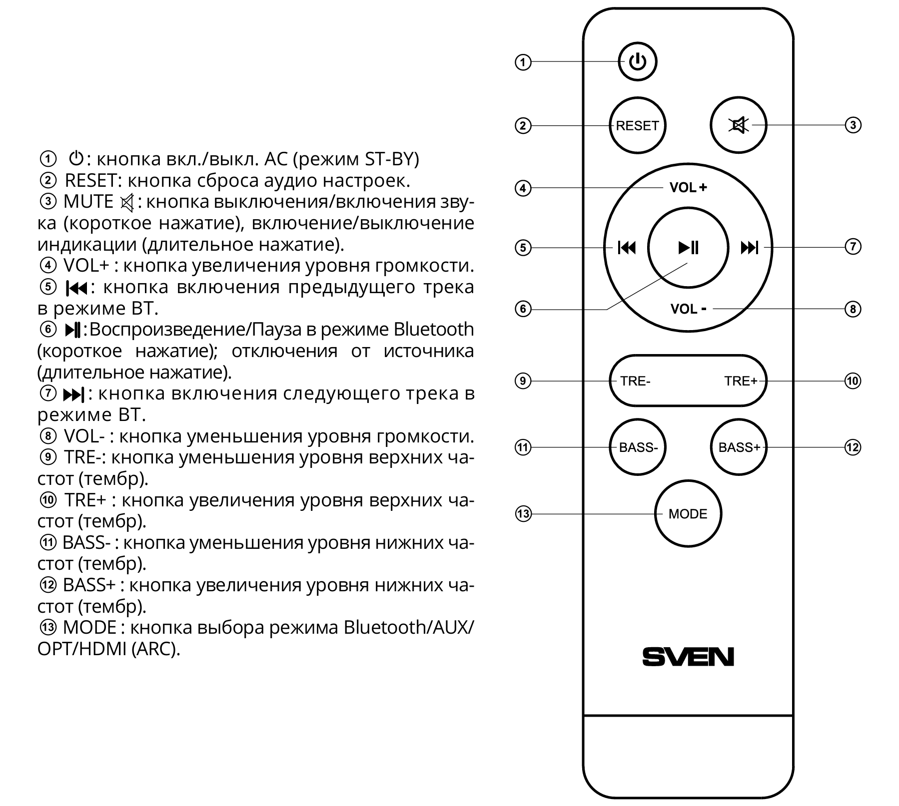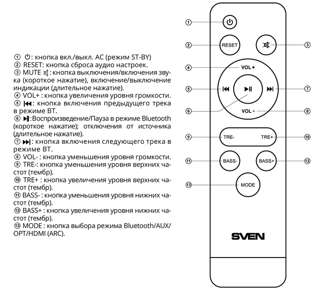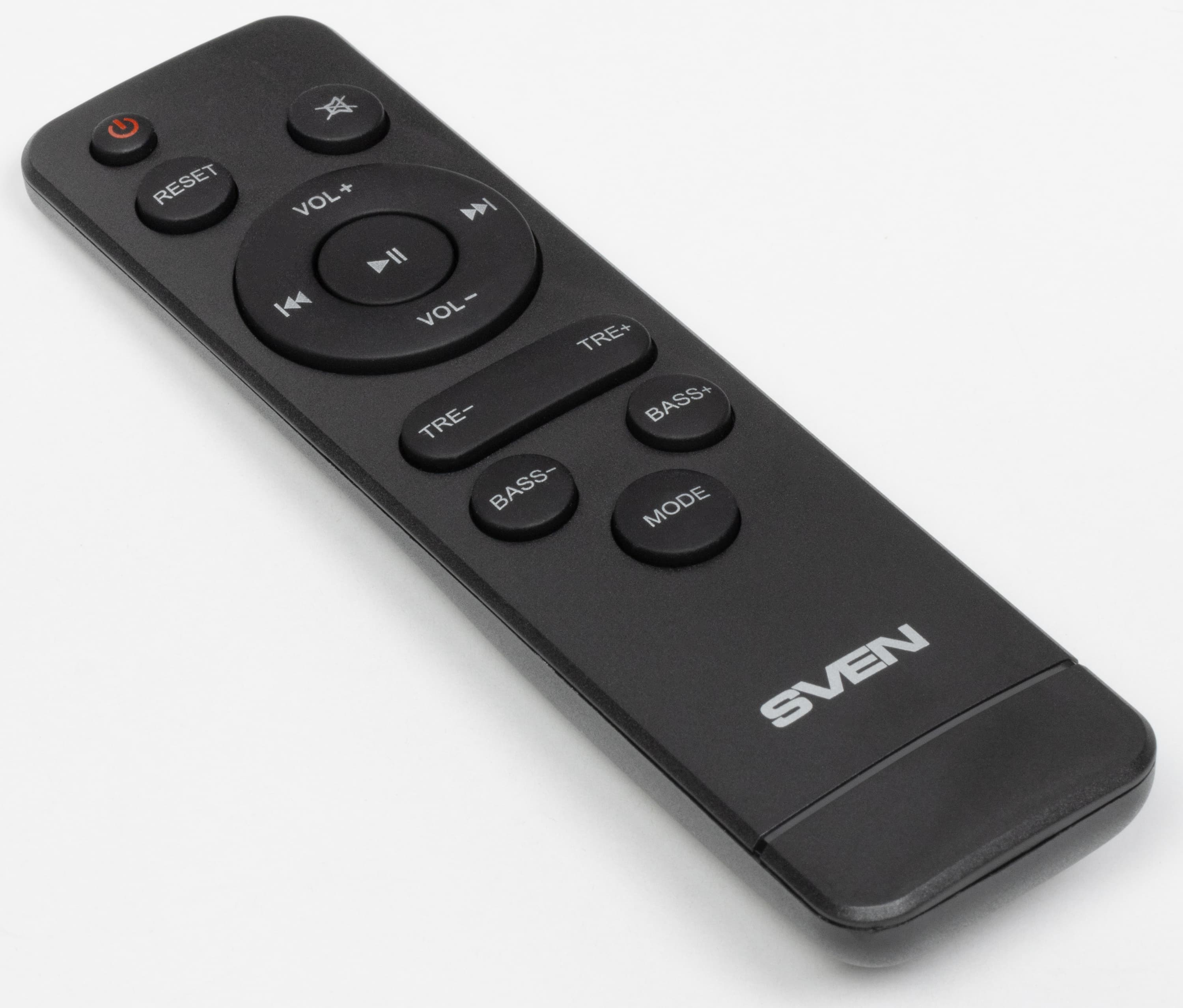 Не самое удобное расположение панели управления частично компенсируется наличием у Sven MC-50 пульта дистанционного управления, с которым пользователь, скорее всего, будет взаимодействовать гораздо чаще. Пульт компактный, кнопки нажимаются с приятным усилием и отчетливым кликом. Управление воспроизведением и громкостью вынесено на «кольцо» в верхней части, которое удобно использовать на ощупь.