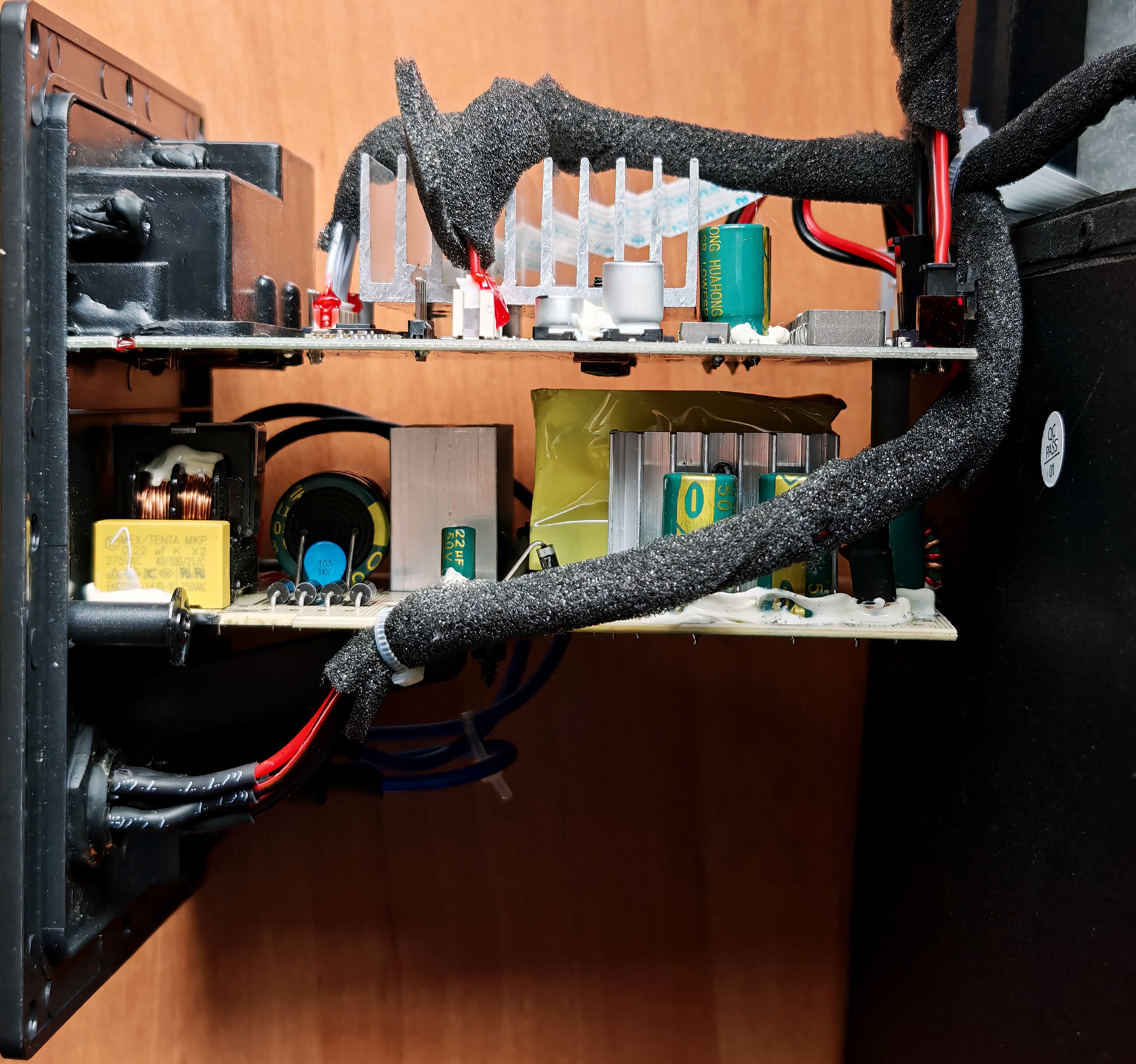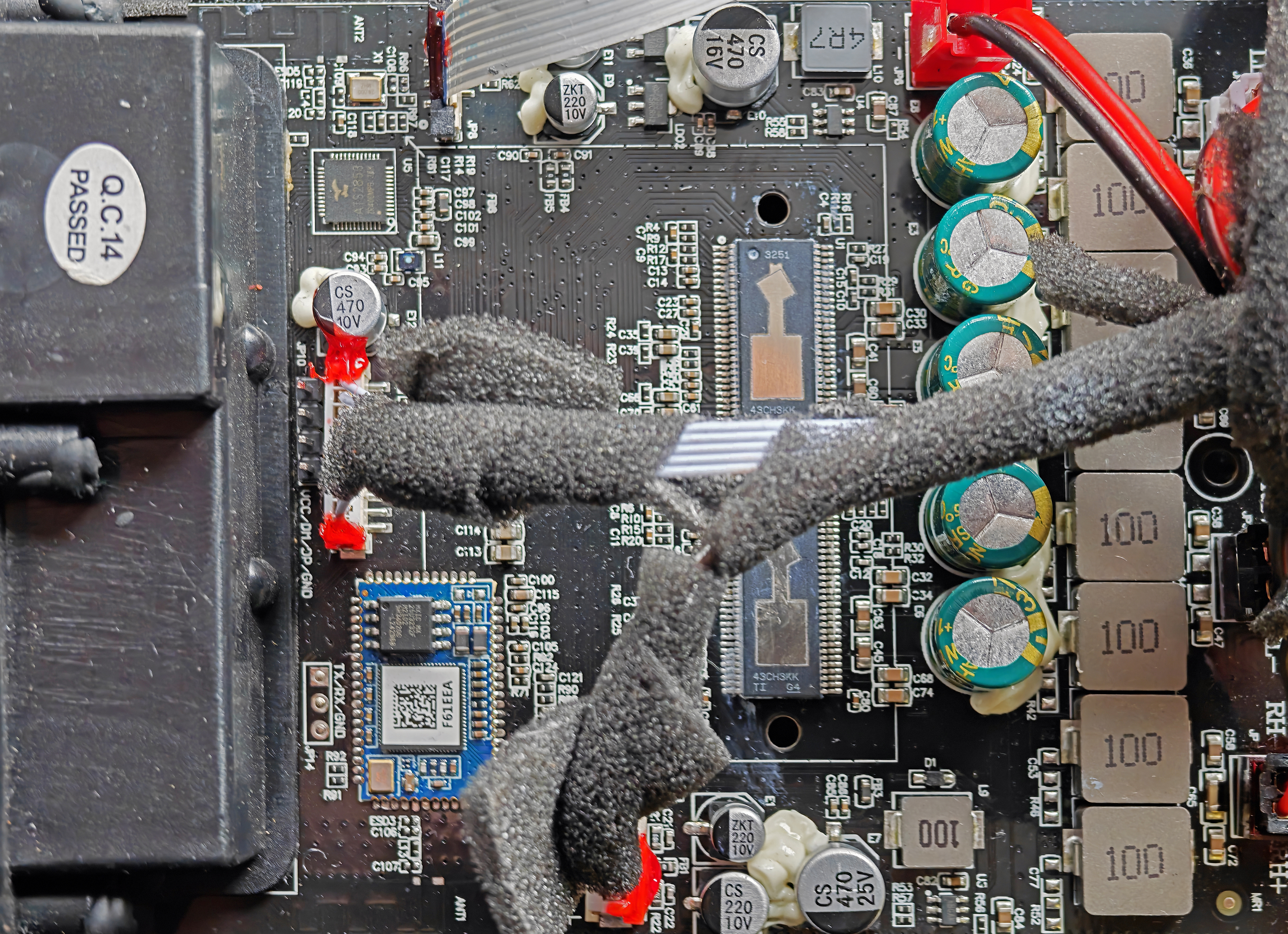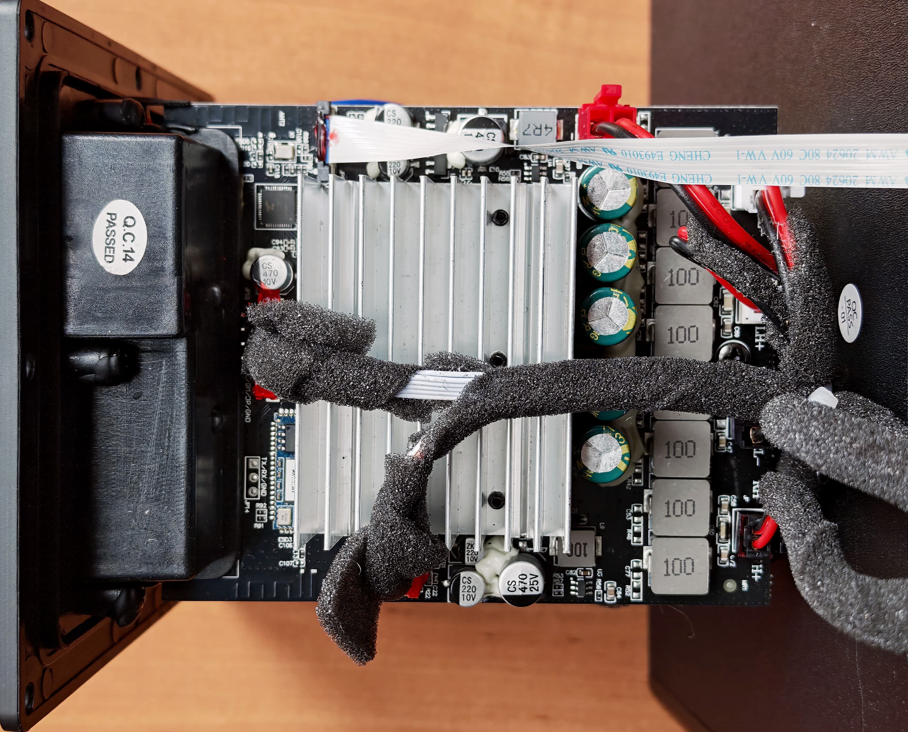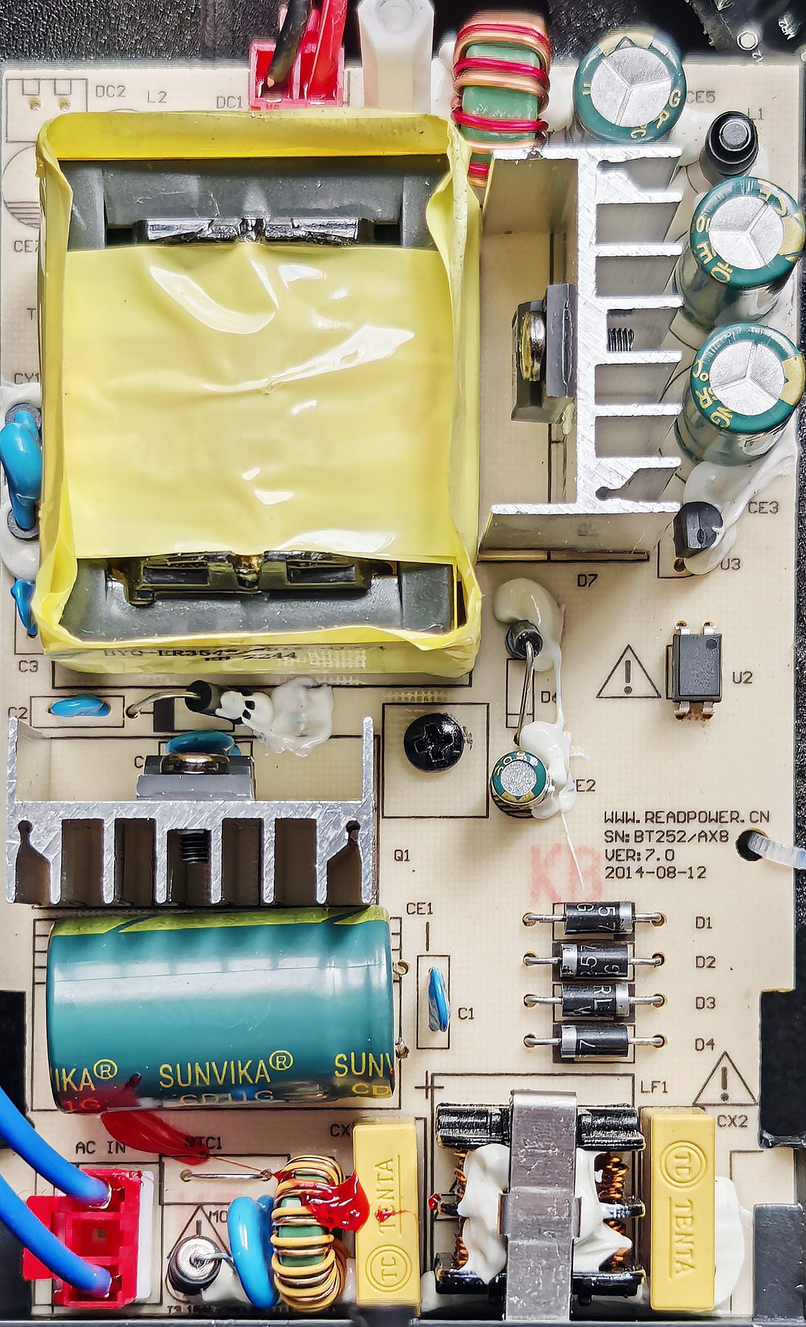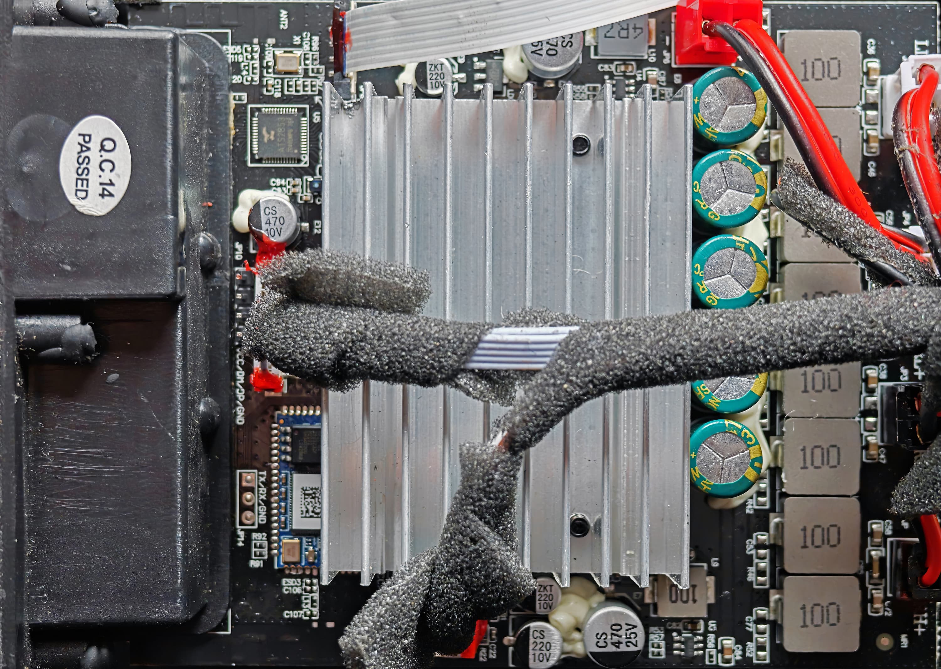 Импульсный блок питания находится на отдельной плате, что немного снижает уровень наводок, и построен по типовой архитектуре. На плате хорошо видны два массивных радиатора охлаждения, крупный силовой трансформатор, диодный мост, а также электролитические конденсаторы бренда Sunvika, принадлежащего китайской компании Shenzhen Sanzhijia Electronics. Общее качество монтажа — высокое: всё выглядит аккуратно, подверженные нагреву элементы дополнительно зафиксированы компаундом. Судя по маркировке и ссылке на сайт (который, впрочем, не работает), плата приобретается в сборе у стороннего производителя.