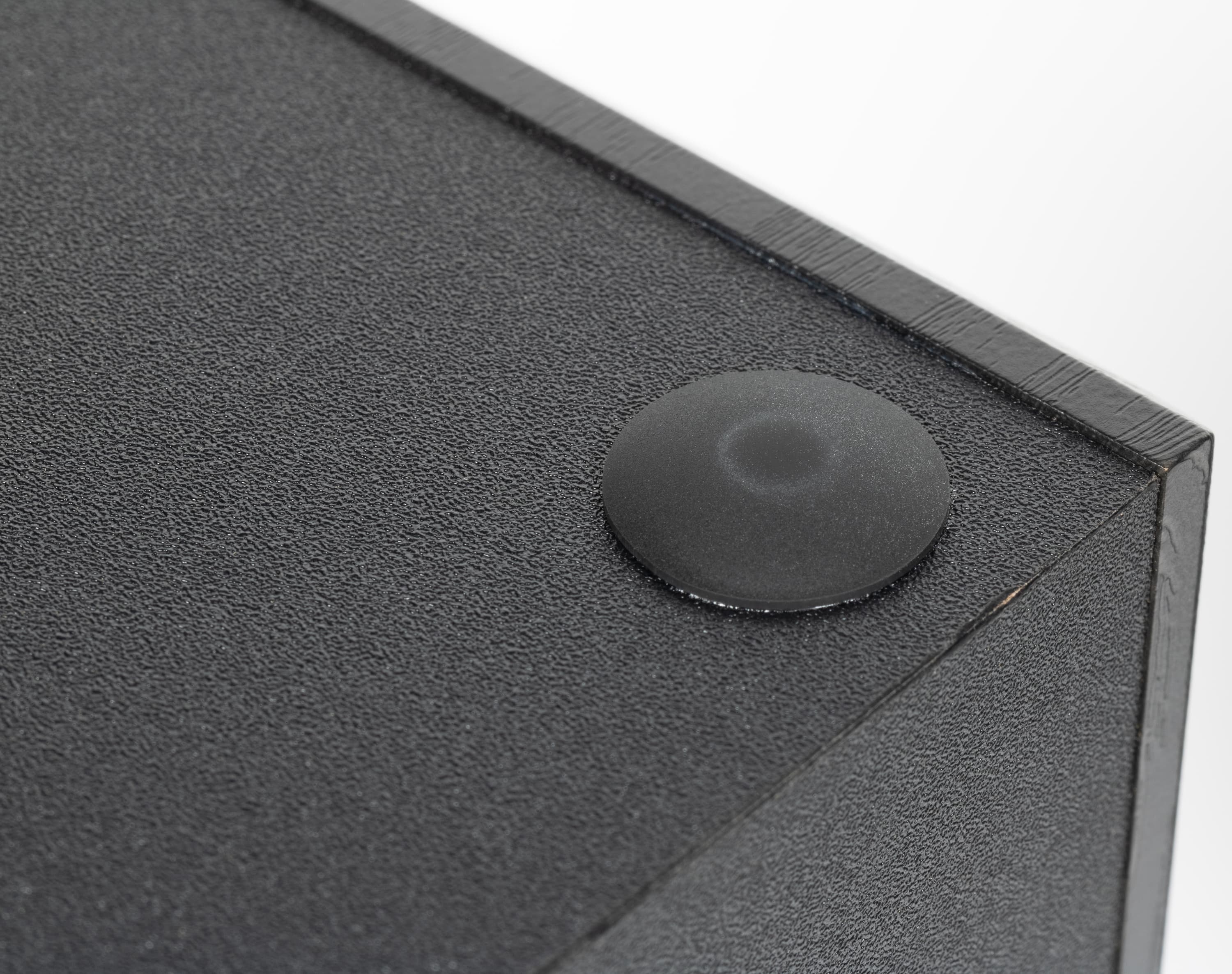 Верхняя и нижняя панели выполнены из MDF, покрытого матовой черной пленкой, которая еще более устойчива к загрязнениям. На дно наклеены ножки, сделано это чуть-чуть неровно — перфекционисты могут быть слегка шокированы. К счастью, при повседневном использовании акустики этот нюанс по понятным причинам совершенно не заметен.