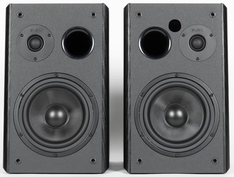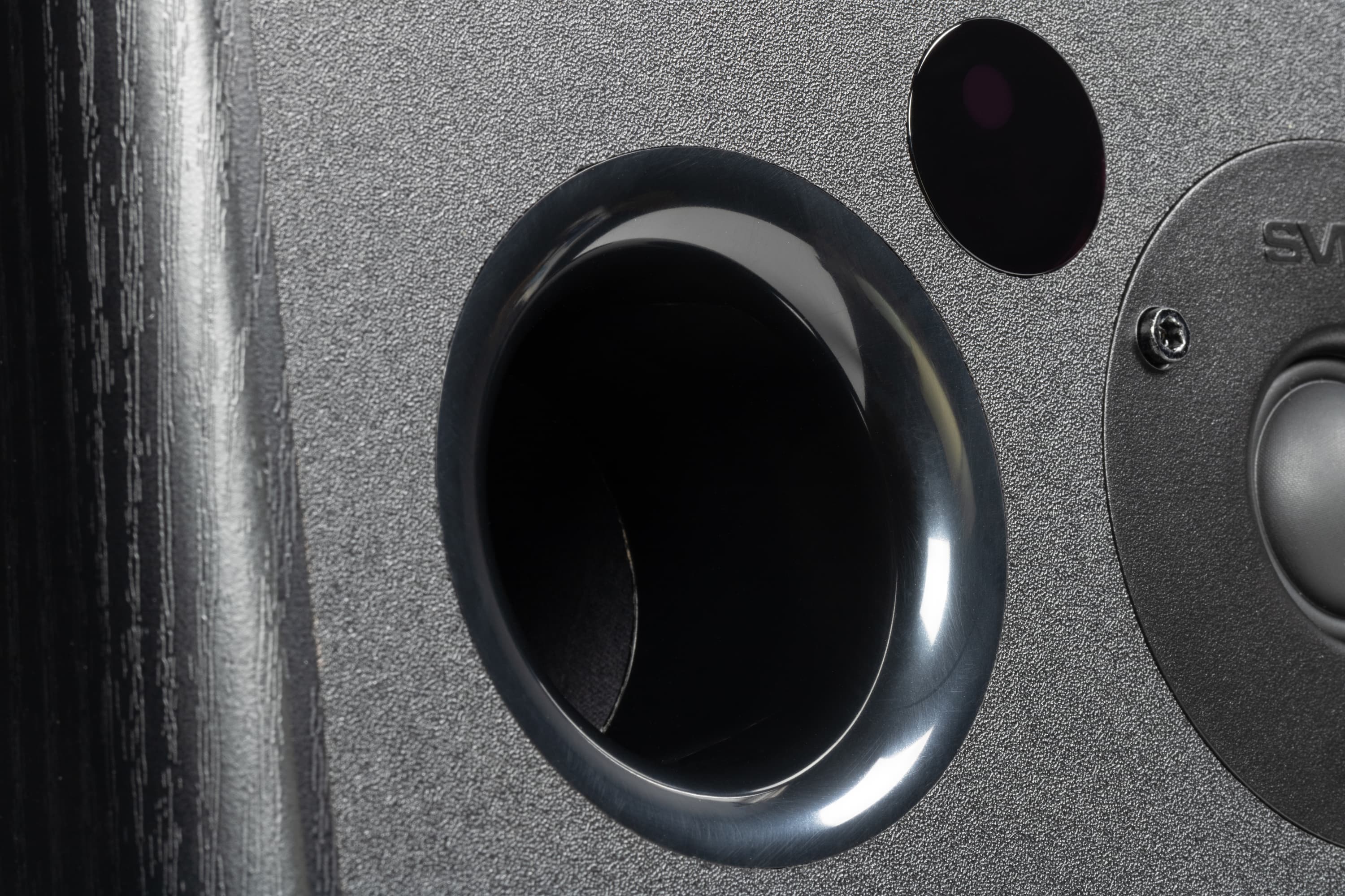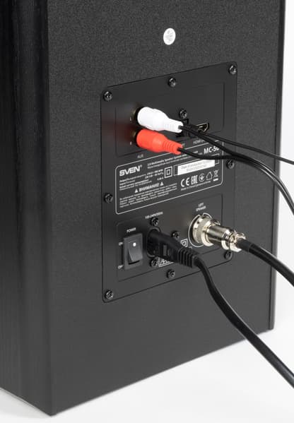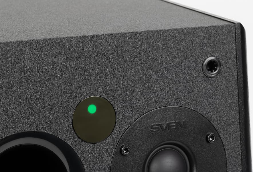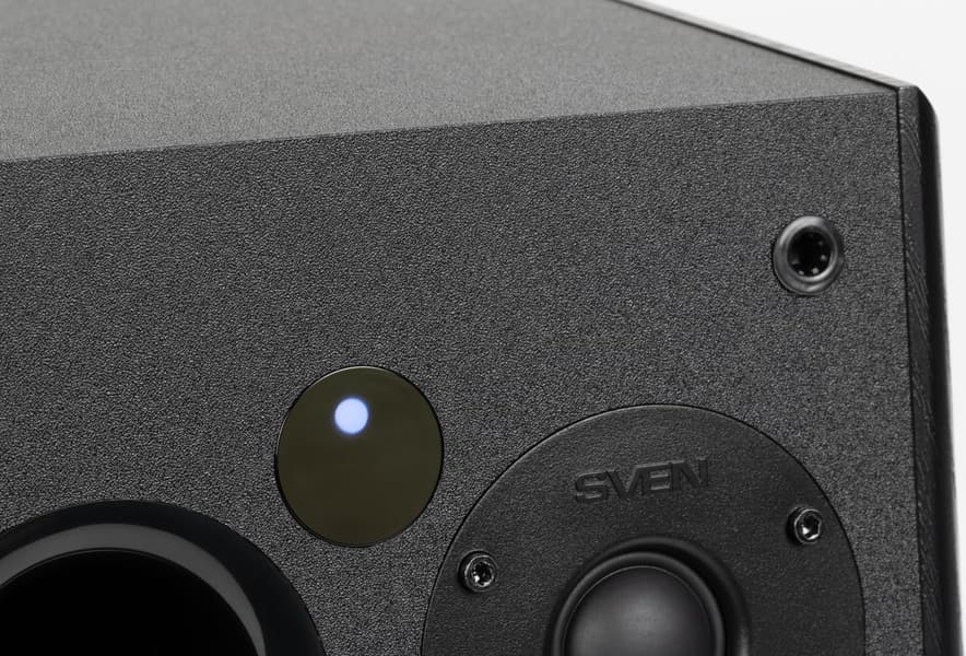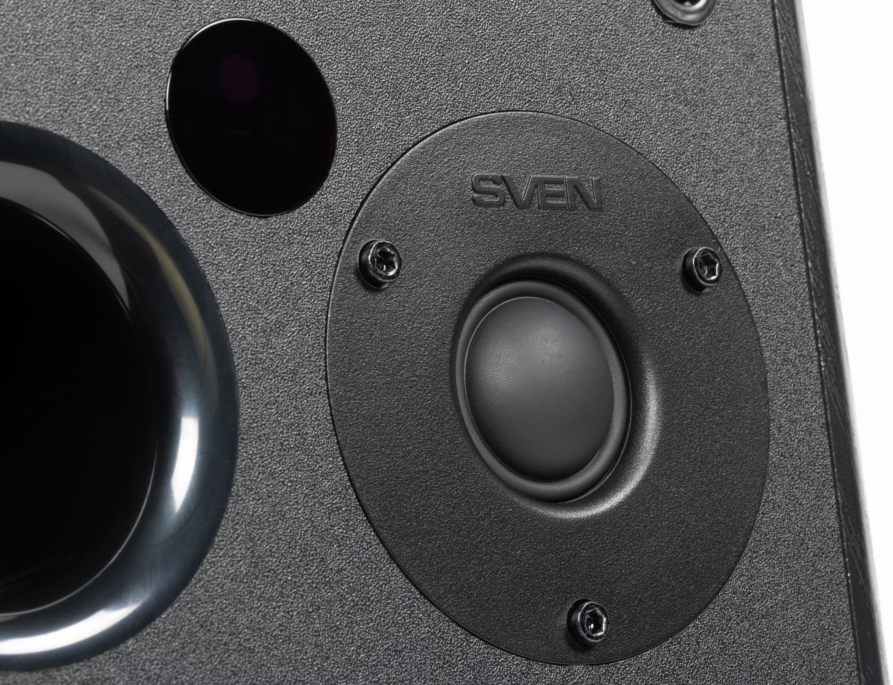 Отверстие фазоинвертора выведено на переднюю панель, что обеспечивает Sven MC-50 акцентированный бас, а заодно позволяет без опасений размещать колонки практически вплотную к стенам.