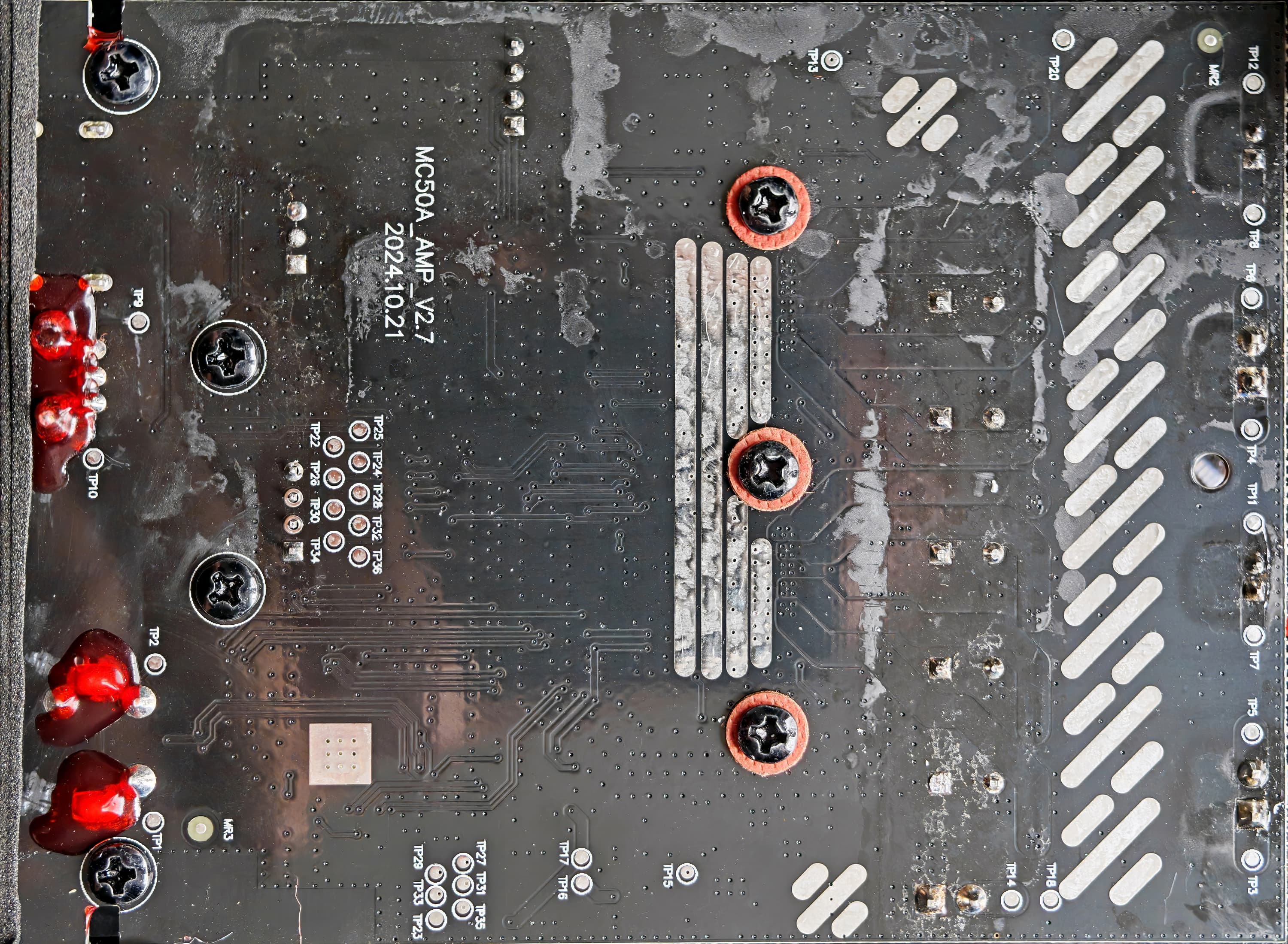 На нижней части основной платы также видна маркировка, которая сообщает нам о том, что производится она специально под рассматриваемый продукт. Внешний вид не очень «нарядный», но при этом серьезных вопросов к качеству монтажа нет. По центру видны крепления радиатора и обширные зоны теплоотвода с множеством металлизированных дорожек, над которыми размещены усилители.