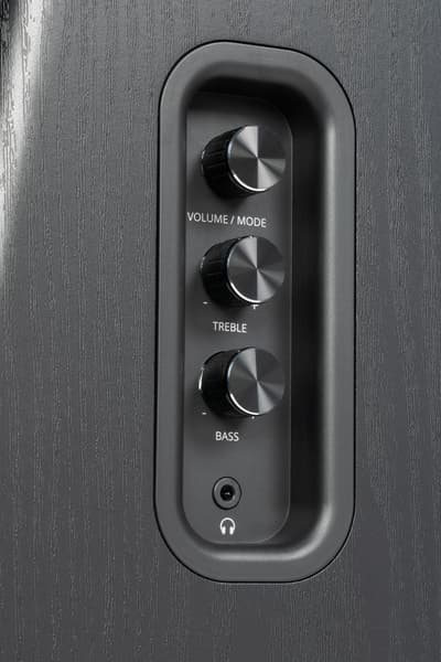 Три ручки управления выведены на боковую панель активной колонки — решение распространенное, но всё же спорное. С одной стороны, это визуально разгружает переднюю панель, с другой — пользоваться регуляторами становится чуть менее удобно. Все три — валкодеры без ограничения угла вращения, с приятным усилием и мягкими, но хорошо ощутимыми кликами. Два нижних отвечают за регулировку НЧ и ВЧ, верхний — за громкость, при нажатии он также переключает активные входы.