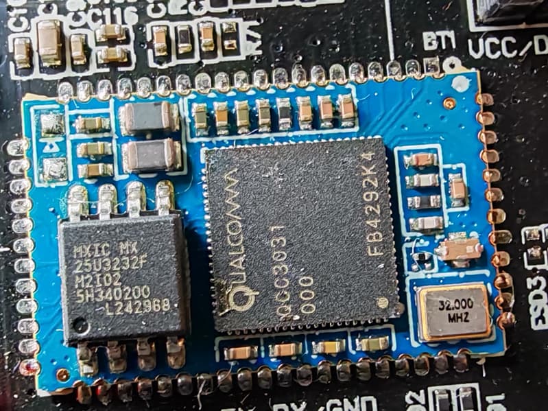 Микросхема на модуле Bluetooth традиционно прикрыта наклейкой, которая легко удаляется. Под ней обнаруживается чипсет Qualcomm QCC3031 — уже не самый свежий, но по-прежнему актуальный и поддерживающий в числе прочих «хайрезный» кодек aptX HD.