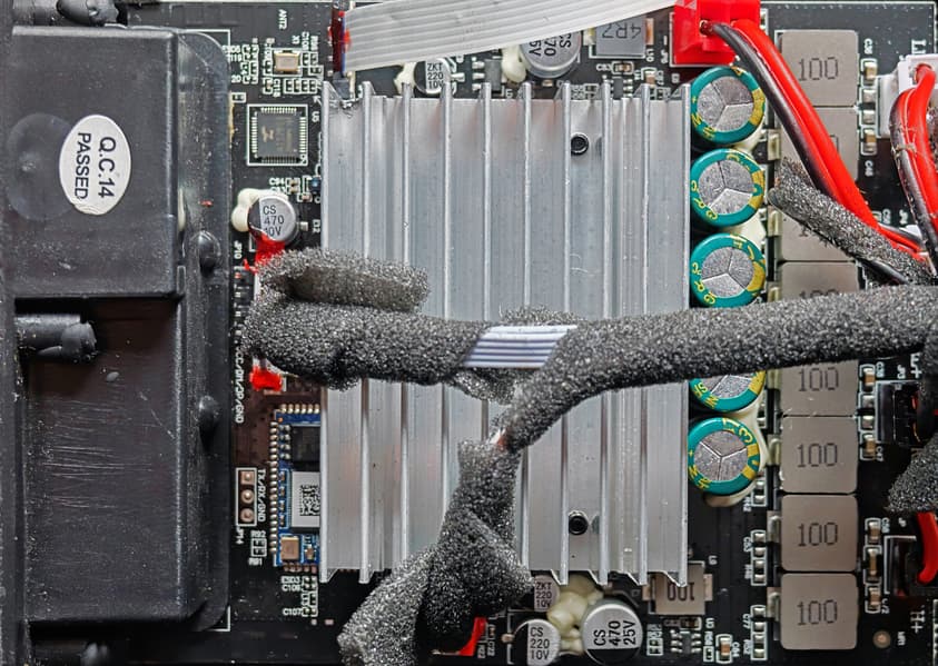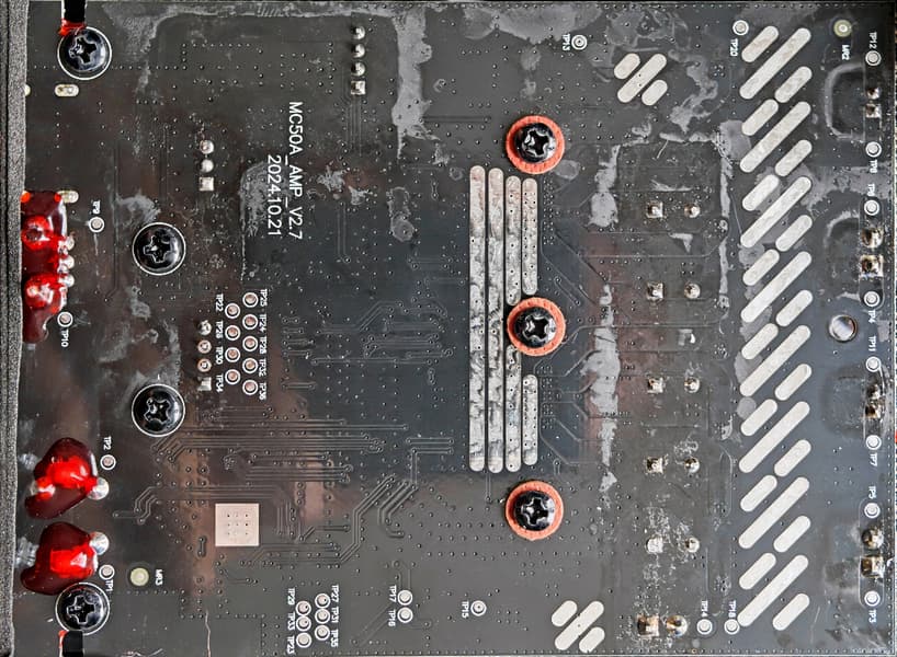 Лицевая сторона усилительной платы скрывает под массивным алюминиевым радиатором основную силовую часть тракта. Рядом размещены банки фильтрующих конденсаторов и крупные SMD-резисторы. Компоновка продуманная, элементы подобраны качественные — пусть и не из премиального сегмента, но и не самых бюджетных.