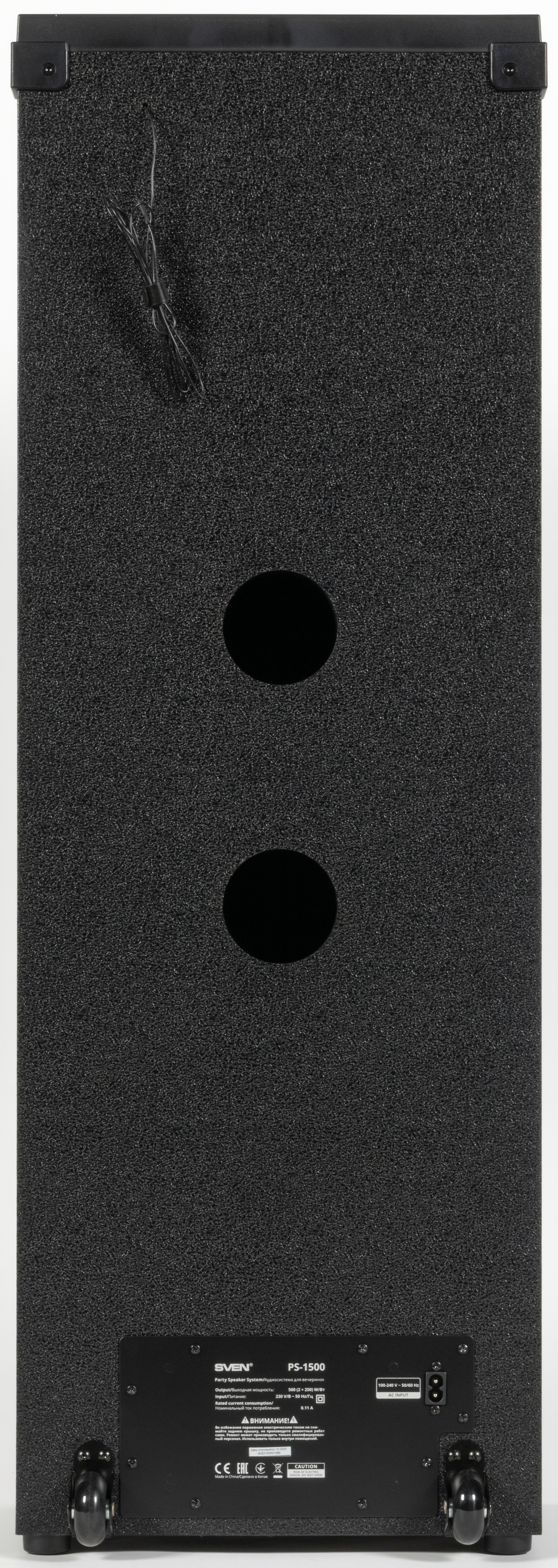 Колесики хорошо закреплены, их диаметр — 45 мм. Также на дне Sven PS-1500 расположены небольшие резиновые ножки, обеспечивающее надежное размещение колонки на горизонтальной поверхности.